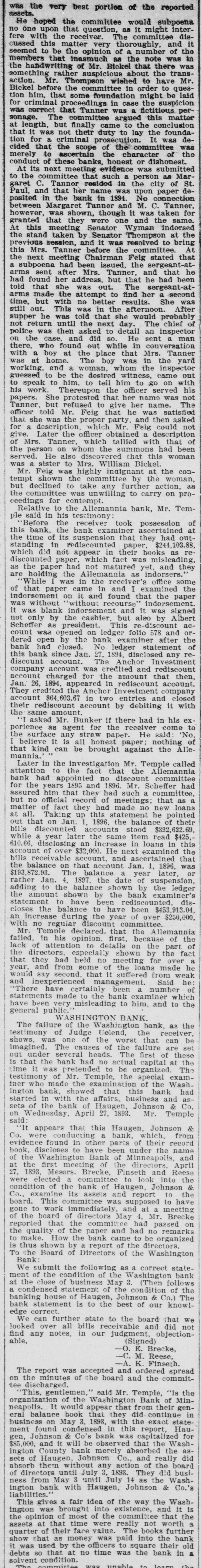 was the very best portion of the reported assets. He hoped the committee would subpoena no one upon that question, as it might interfere with the receiver. The committee discussed this matter very thoroughly, and it seemed to be the opinion of a number of the members that inasmuch as the note was in the handwriting of Mr. Bickel that there was something rather suspicious about the transaction. Mr. Thompson wished to have Mr. Bickel before the committee in order to question him, that some foundation might be laid for criminal proceedings in case the suspicion was correct that Tanner was a fictitious personage. The committee argued this matter at length, but finally came to the conclusion that it was not their duty to lay the foundation for a criminal prosecution. It was decided that the scope of the committee was merely to ascertain the character of the conduct of these banks, honest or dishonest. At its next meeting evidence was submitted to the committee that such a person as Margaret C. Tanner resided in the city of St. Paul, and that her name was upon paper deposited in the bank in 1894. No connection between Margaret Tanner and M. C. Tanner, however, was shown, though it was taken for granted that they were one and the same. At this meeting Senator Wyman indorsed the stand taken by Senator Thompson at the previous session, and it was resolved to bring this Mrs. Tanner before the committee. At the next meeting Chairman Feig stated that a subpoena had been issued, the sergeant-at-arms sent after Mrs. Tanner, and that he had found her address, but that he had been told that she was out. The sergeant-at-arms made the attempt to find her a second time, but with no better results. She was still out. This was in the afternoon. After supper he was told that she would probably not return until the next day. The chief of police was then asked to detail an inspector on the case, and did so. He sent a man there, who found out while in conversation with a boy at the place that Mrs. Tanner was at home. The boy was in the yard working, and a woman, whom the inspector guessed to be the desired witness, came out to speak to him, to tell him to go on with his work. Thereupon the officer served his papers. She protested that her name was not Tanner, but refused to give her name. The officer told Mr. Feig that he was satisfied that she was the proper party, and then asked for a description, which Mr. Feig could not give. Later the officer obtained a description of Mrs. Tanner, which tallied with that of the person on whom the summons had been served. He also discovered that this woman was a sister to Mrs. William Bickel. Mr. Feig was highly indignant at the contempt shown the committee by the woman, but declined to take any further action, as the committee was unwilling to carry on proceedings for contempt. Relative to the Allemannia bank, Mr. Temple said in his testimony: "Before the receiver took possession of this bank, the bank examiner ascertained at the time of its suspension that they had outstanding in rediscounted paper, $244,103.88, which did not appear in their books as rediscounted paper, which fact was misleading, as the paper had not matured yet, and they are holding the Allemannia as indorsers." "While I was in the receiver's office some of that paper came in and I examined the indorsement on it and found that the paper was without "without recourse" indorsement. it was blank indorsement and it was signed not only by the cashier, but also by Albert Scheffer as president. This re-discount account was opened on ledger folio 578 and ordered open by the bank examiner after the bank had closed. No ledger statement of this bank since Jan. 27, 1894, disclosed any rediscount account. The Anchor Investment company account was credited and rediscount account charged for the amount that then, Jan. 26, 1894, appeared in rediscount account. They credited the Anchor Investment company account $64,603.67 in two entries and closed their rediscount account by debiting it with the same amount. "I asked Mr. Bunker if there had in his experience as agent for the receiver come to the surface any straw paper. He said: 'No, I believe it is all honest paper; nothing of that kind can be brought against the Allemannia.'" Later in the investigation Mr. Temple called attention to the fact that the Allemannia bank had appointed no discount committee for the years 1895 and 1896. Mr. Scheffer had assured him that they had such a committee, but no official record of meetings; that as a matter of fact they had made no new loans at all. Taking up this statement he pointed out that on Jan. 1, 1896, the balance of their bil's discounted accounts stood $392,622.69, while a year later the same item read $425,610.66, disclosing an increase in loans in this account of over $32,000. He next examined the bills receivable account, and ascertained that the balance on that account Jan. 1, 1896, was $193,872.93. The balance a year later, or rather Jan. 4, 1897, the date of suspension, adding to the balance shown by the ledger the amount shown by the bank examiner's statement to have been rediscounted, discloses the balance to have been $453,913.04, an increase during the year of over $250,000, with no reguiar discount committee. Mr. Temple declared, that the Allemannia failed, in his opinion, first, because of the lack of attention to details on the part of the directors, especially shown by the fact that they had held no meeting for over a year, and from some of the loans made he would say second, that it suffered from weak and inexperienced management. Said he: "There have certainly been a number of statements made to the bank examiner which have been very misleading to him, and to the general public." # WASHINGTON BANK. The failure of the Washington bank, as the testimony of Judge Uelend, the receiver, shows, was one of the worst that can be imagined. The causes of the failure are set out under several heads. The first of these is