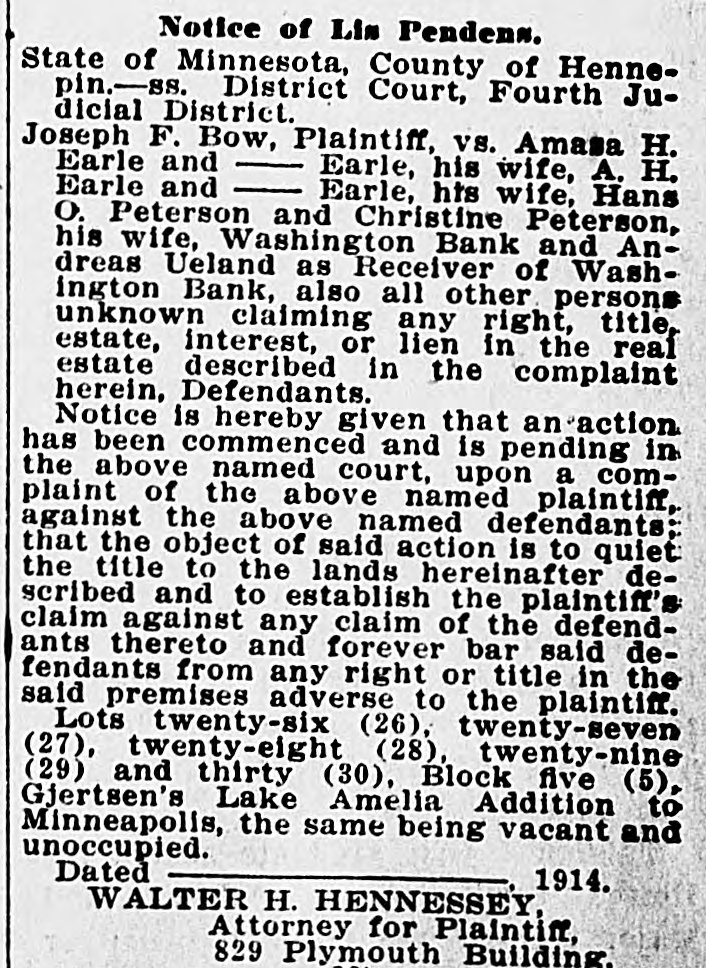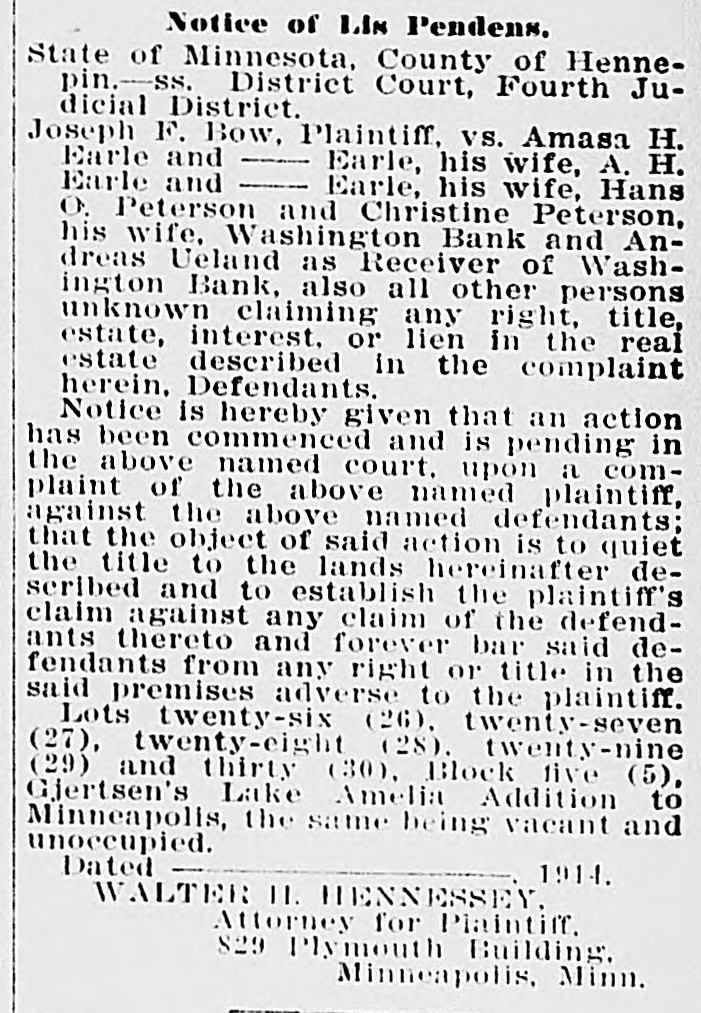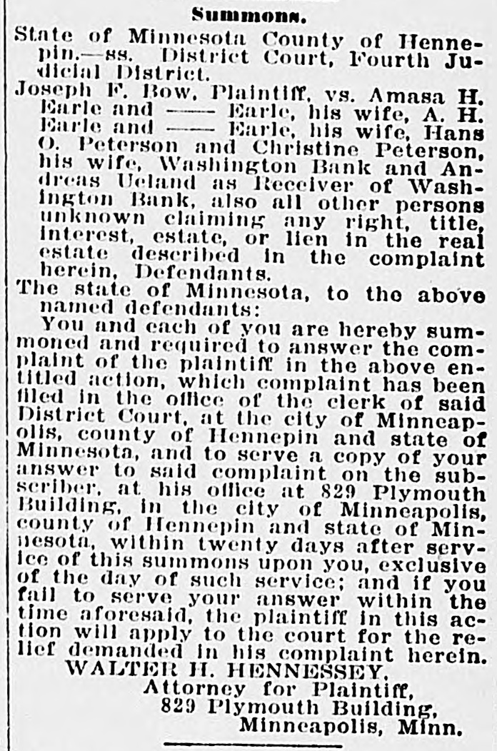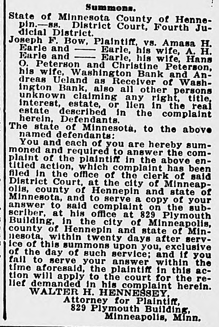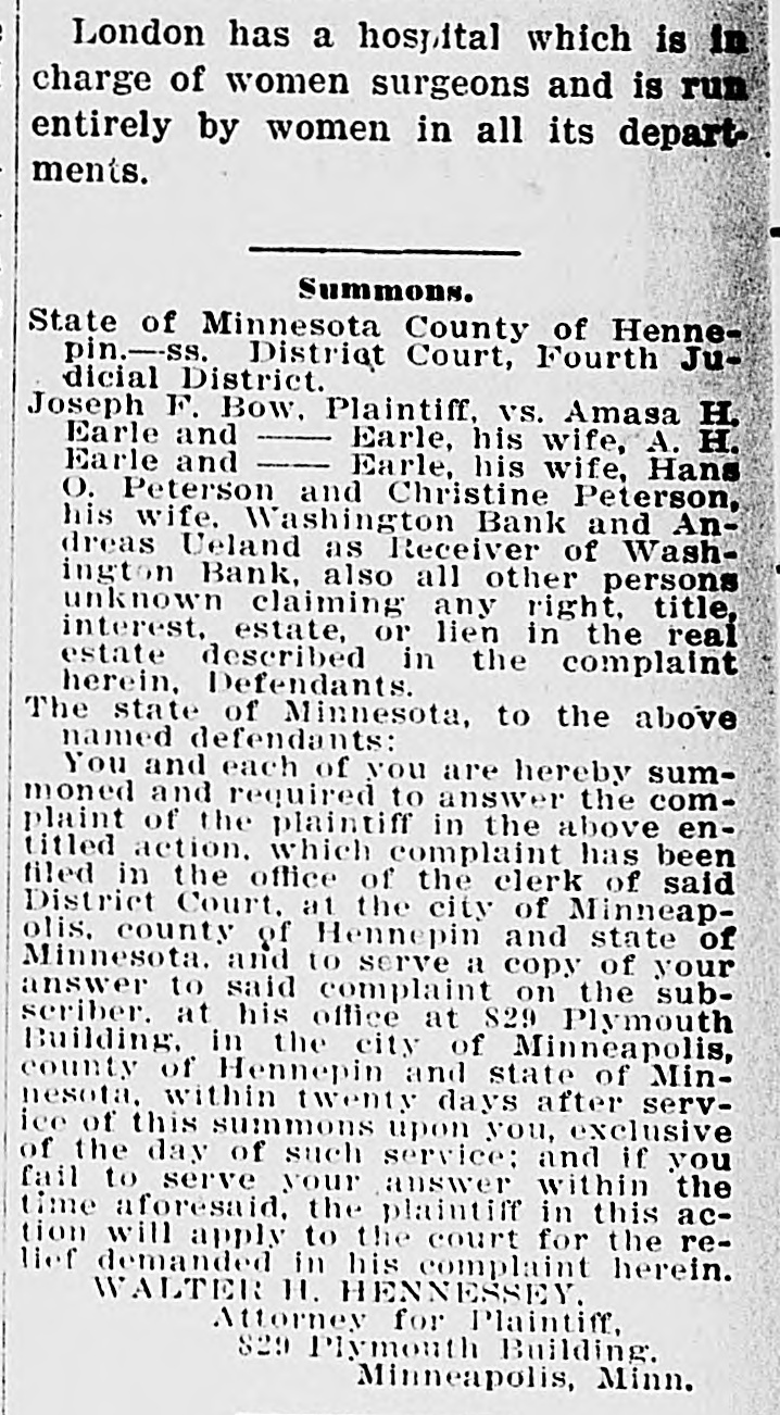 London has a hospital which is in charge of women surgeons and is run entirely by women in all its departments. # Summons. State of Minnesota County of Hennepin.--ss. District Court, Fourth Judicial District. Joseph F. Bow, Plaintiff, vs. Amasa H. Earle and — Earle, his wife, A. H. Earle and — Earle, his wife, Hans O. Peterson and Christine Peterson, his wife. Washington Bank and Andreas Ueland as Receiver of Washington Bank, also all other persons unknown claiming any right, title, interest, estate, or lien in the real estate described in the complaint herein, Defendants. The state of Minnesota, to the above named defendants: You and each of you are hereby summoned and required to answer the complaint of the plaintiff in the above entitled action, which complaint has been filed in the office of the clerk of said District Court, at the city of Minneapolis, county of Hennepin and state of Minnesota, and to serve a copy of your answer to said complaint on the subscriber, at his office at 829 Plymouth Building, in the city of Minneapolis, county of Hennepin and state of Minnesota, within twenty days after service of this summons upon you, exclusive of the day of such service; and if you fail to serve your answer within the time aforesaid, the plaintiff in this action will apply to the court for the relief demanded in his complaint herein. WALTER H. HENNESSEY, Attorney for Plaintiff, 829 Plymouth Building, Minneapolis, Minn.