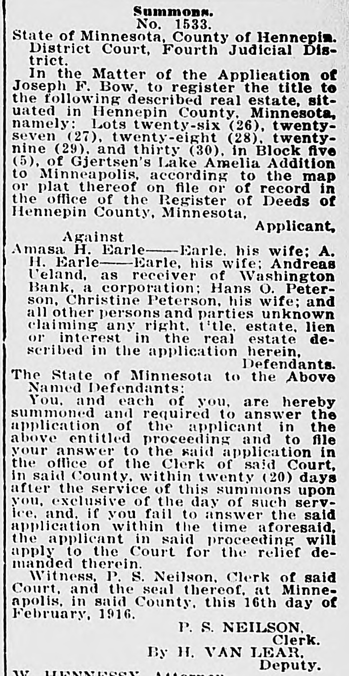 Summons. No. 1533. State of Minnesota, County of Hennepin. District Court, Fourth Judicial District. In the Matter of the Application of Joseph F. Bow, to register the title to the following described real estate, situated in Hennepin County, Minnesota, namely: Lots twenty-six (26), twenty-seven (27), twenty-eight (28), twenty-nine (29), and thirty (30), in Block five (5), of Gjertsen's Lake Amelia Addition to Minneapolis, according to the map or plat thereof on file or of record in the office of the Register of Deeds of Hennepin County, Minnesota, Applicant, Against Amasa H. Earle—Earle, his wife; A. H. Earle—Earle, his wife; Andreas Ueland, as receiver of Washington Bank, a corporation; Hans O. Peterson, Christine Peterson, his wife; and all other persons and parties unknown claiming any right, title, estate, lien or interest in the real estate described in the application herein, Defendants. The State of Minnesota to the Above Named Defendants: You, and each of you, are hereby summoned and required to answer the application of the applicant in the above entitled proceeding and to file your answer to the said application in the office of the Clerk of said Court, in said County, within twenty (20) days after the service of this summons upon you, exclusive of the day of such service, and, if you fail to answer the said application within the time aforesaid, the applicant in said proceeding will apply to the Court for the relief demanded therein. Witness, P. S. Neilson, Clerk of said Court, and the seal thereof, at Minneapolis, in said County, this 16th day of February, 1916. P. S. NEILSON, Clerk. By H. VAN LEAR, Deputy.