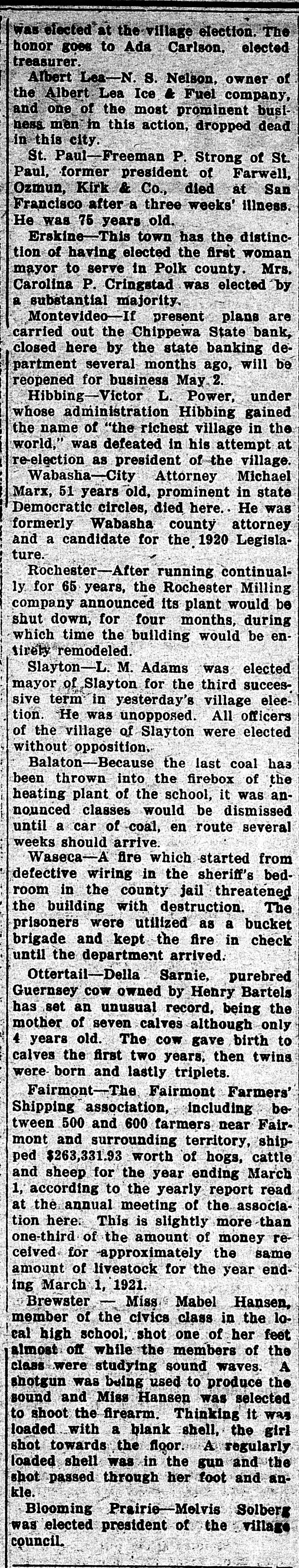 Wabasha—City Attorney Michael Marx, 51 years old, prominent in state Democratic circles, died here. He was formerly Wabasha county attorney and a candidate for the 1920 Legislature.