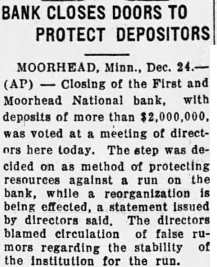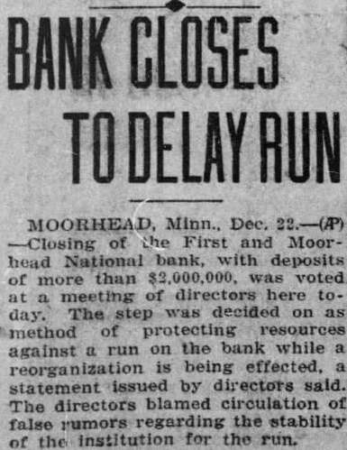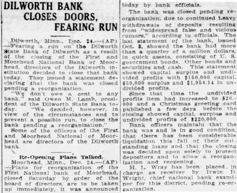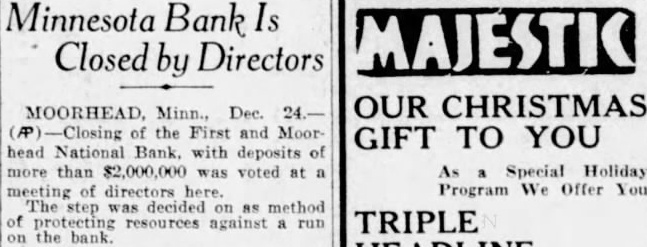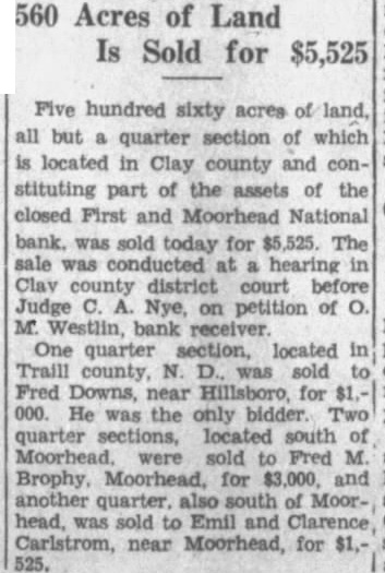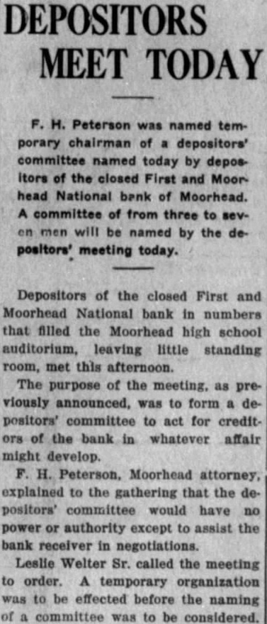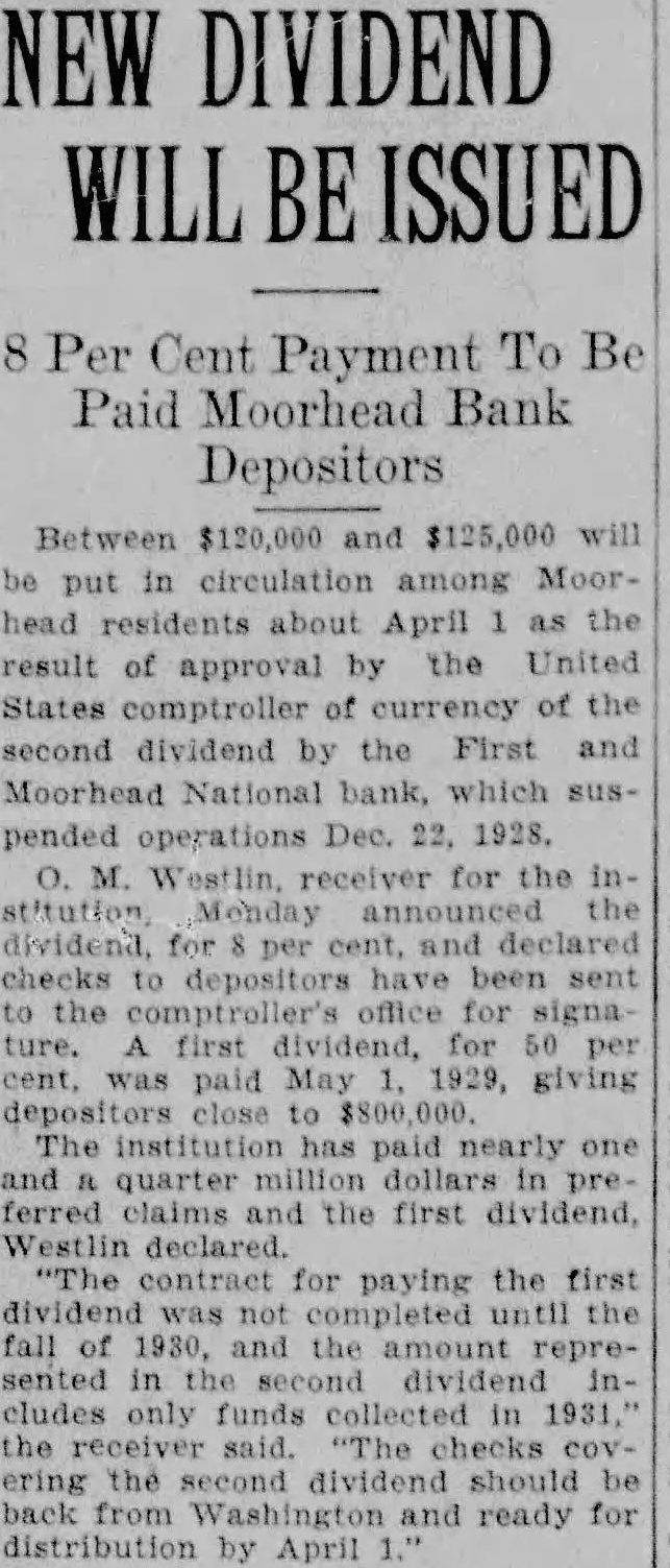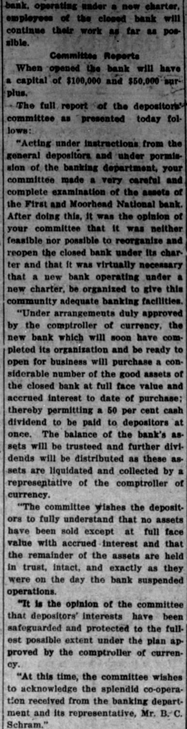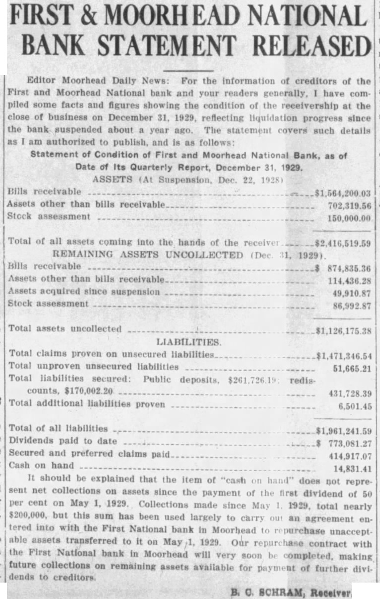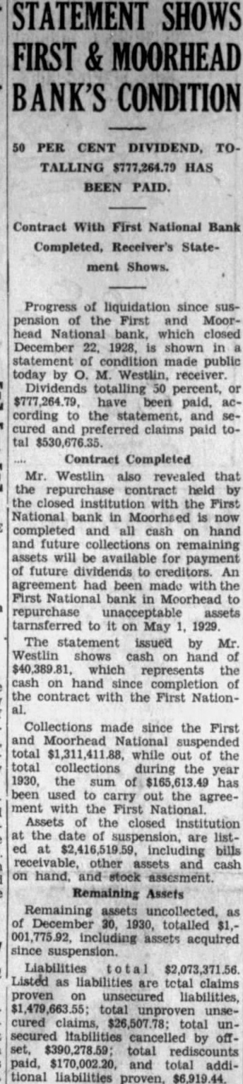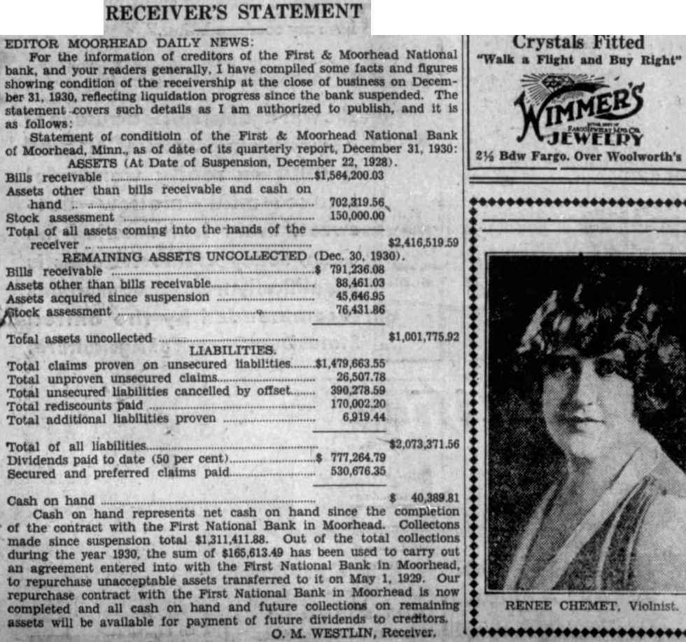 EDITOR MOORHEAD DAILY NEWS: Crystals Fitted For the information of creditors of the First & Moorhead National "Walk a Flight and Buy Right" bank, and your readers generally, have compiled some facts and figures showing condition of the receivership at the close of business on December 31, 1930. reflecting liquidation progress since the bank suspended. The statement covers such details as I am authorized to publish, and it is as follows: Statement of conditioin of the First & Moorhead National Bank JEWELRY of Moorhead, Minn., as of date of its quarterly report, December 31, 1930: 21/2 Bdw Fargo. Over Woolworth's ASSETS (At Date of Suspension, December 22, 1928). Bills receivable $1,564,200.03 Assets other than bills receivable and cash on hand assessment 150,000.00 Stock Total of all assets coming into the hands of the receiver $2,416,519.59 REMAINING ASSETS UNCOLLECTED (Dec. 30, 1930) Bills receivable 791,236.08 Assets other than bills receivable 88,461.03 45,646.95 Assets acquired since suspension Stock assessment 76,431.86