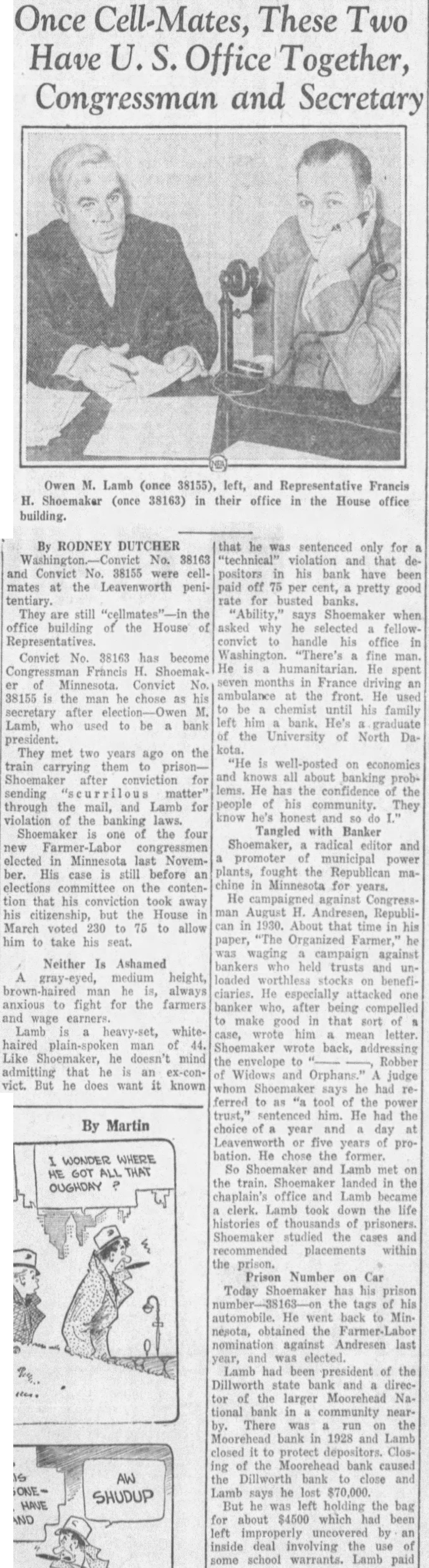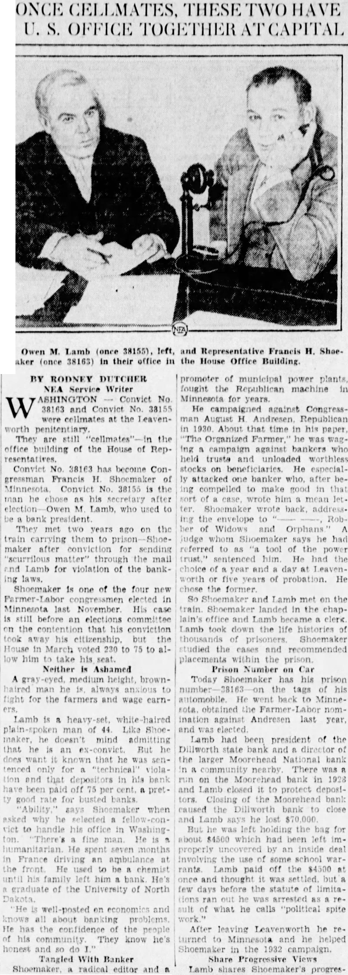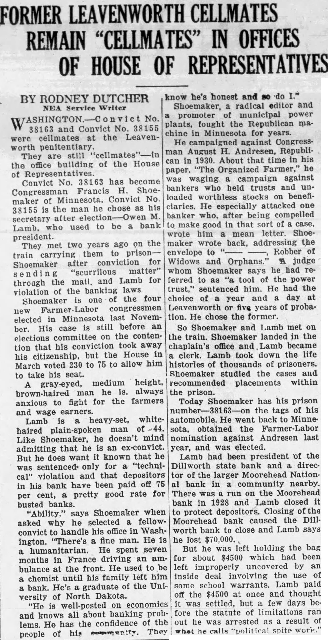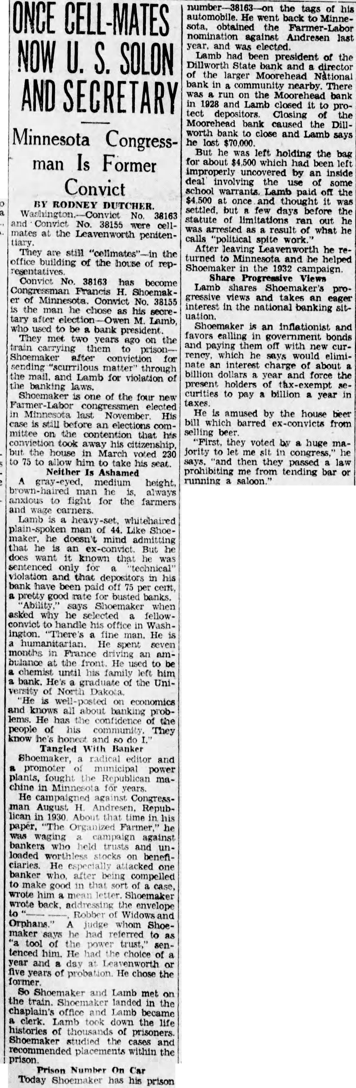 By RODNEY DUTCHER No. 38163 and Convict No. 38155 were cellmates at the Leavenworth penitentiary. They are still "ceilmates"- the office building of the house of repConvict No 38163 has become Congressman Francis H. Shoemaker of Minnesota. Convict No. 38155 is the man he chose as his secretary after M. Lamb, who used to be bank president. They met years ago on the train carrying them prison- Shoemaker after conviction for sending "scurrilous through the mail, for violation of the banking laws. Shoemaker of the four new Farmer-Labor in Minnesota last November His case still before an elections committee on the contention that his conviction took away his citizenship, but the house in March voted 230 to 75 to allow him to take his seat. Neither Is Ashamed A gray eyed. medium height nan he always anxious to fight for the farmers and Lamb is heavy-set. plain-spoken man of Like he doesn't mind admitting that he is an ex-convict But he want it that he was sen only violation and in his bank have been paid off 75 per pretty rate for busted banks asked why he selected fellow vict to handle his office in fine man. He humanitarian He spent seven months in driving an ambulance the front He used to his family left him bank He's graduate of the University of North Dakota 'He posted economics and knows all about banking prob. lems. He has the confidence of the people of his community They know he's honest and so do Tangled With Banker Shoemaker radical editor and promoter of municipal power plants fought the Republican machine in for years. He campaigned against Congressman August Andersen Republican in 1930. About that time in his paper "The Organized Farmer he was waging against held trusts and unloaded worthless stocks beneficiaries. He especially attacked banker after being compelled to make good in that sort of wrote him mean letter Shoemaker wrote back. addressing the envelope to Robber of Widows and Orphans judge Shoemaker says he had referred as tool of the power trust him He had the choice of year and day at Leavenworth or five years of probation He chose the So and Lamb met on the train. Shoemaker landed in the chaplain's office and Lamb became clerk. Lamb took down the life histories of thousands of prisoners Shoemaker studied the cases and recommended placements within the Today Shoemaker has his prison number- the tags of his automobile. He went to Minnesota, obtained the Farmer Labor nomination against Andresen last and was elected. Lamb had been president of the Dillworth state bank and director of the larger Moorehead National bank in community nearby. There was run on the Moorehead bank in 1928 and Lamb closed it to protect Closing of Moorehead bank the Dill. worth bank and Lamb says he lost But he was left holding the bag for about which had been improperly uncovered by inside deal involving the use warrants. Lamb paid off the and settled. but few days the statute arrested as result of what he calls "political spite After leaving Leavenworth he returned to and he Shoemaker in the 1932 campaign. Lamb shares progres. sive takes an eager in terest in the national banking sit Shoemaker is an inflationist and and paying off with new rency which he says nate an interest charge of about billion and force ent holders of securities presto pay billion year in taxes He amused by the beer bill which barred ex-convicts from selling "First they voted by a huge jority to me he "and then they passed law prohibiting me tending bar running