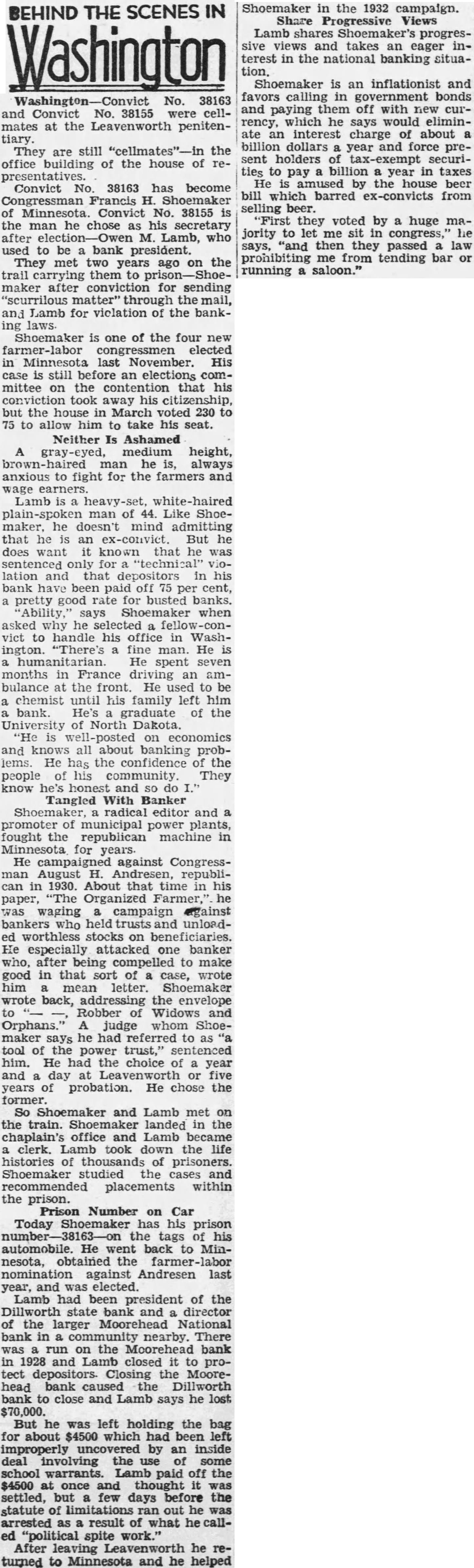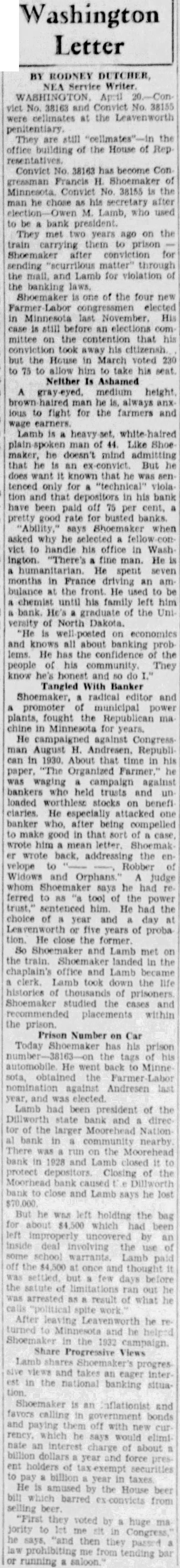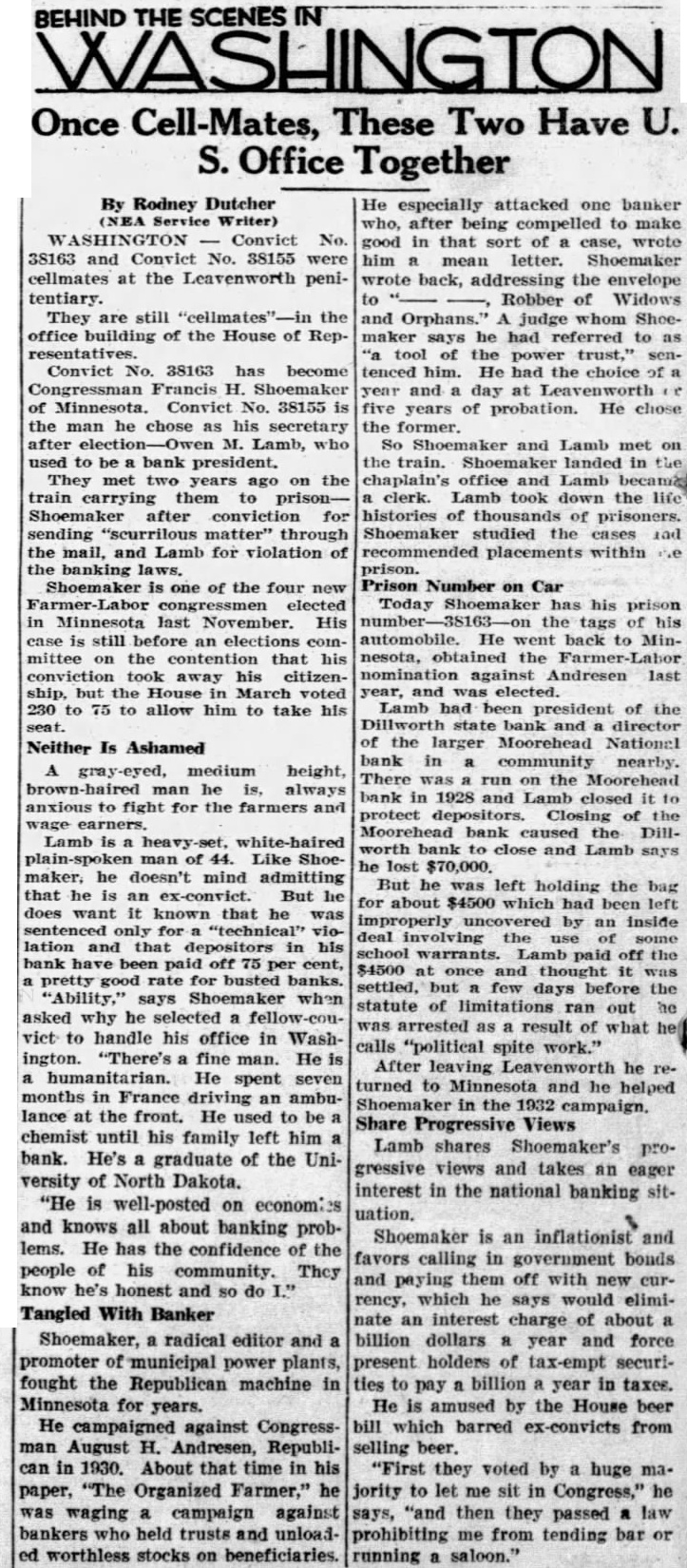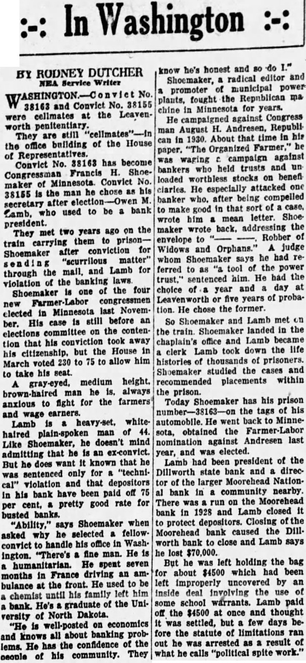 By RODNEY DUTCHER No. 38163 and Convict No. 38155 were cellmates at the Leavenworth penitentiary. They are still "ceilmates"- the office building of the house of repConvict No 38163 has become Congressman Francis H. Shoemaker of Minnesota. Convict No. 38155 is the man he chose as his secretary after M. Lamb, who used to be bank president. They met years ago on the train carrying them prison- Shoemaker after conviction for sending "scurrilous through the mail, for violation of the banking laws. Shoemaker of the four new Farmer-Labor in Minnesota last November His case still before an elections committee on the contention that his conviction took away his citizenship, but the house in March voted 230 to 75 to allow him to take his seat. Neither Is Ashamed A gray eyed. medium height nan he always anxious to fight for the farmers and Lamb is heavy-set. plain-spoken man of Like he doesn't mind admitting that he is an ex-convict But he want it that he was sen only violation and in his bank have been paid off 75 per pretty rate for busted banks asked why he selected fellow vict to handle his office in fine man. He humanitarian He spent seven months in driving an ambulance the front He used to his family left him bank He's graduate of the University of North Dakota 'He posted economics and knows all about banking prob. lems. He has the confidence of the people of his community They know he's honest and so do Tangled With Banker Shoemaker radical editor and promoter of municipal power plants fought the Republican machine in for years. He campaigned against Congressman August Andersen Republican in 1930. About that time in his paper "The Organized Farmer he was waging against held trusts and unloaded worthless stocks beneficiaries. He especially attacked banker after being compelled to make good in that sort of wrote him mean letter Shoemaker wrote back. addressing the envelope to Robber of Widows and Orphans judge Shoemaker says he had referred as tool of the power trust him He had the choice of year and day at Leavenworth or five years of probation He chose the So and Lamb met on the train. Shoemaker landed in the chaplain's office and Lamb became clerk. Lamb took down the life histories of thousands of prisoners Shoemaker studied the cases and recommended placements within the Today Shoemaker has his prison number- the tags of his automobile. He went to Minnesota, obtained the Farmer Labor nomination against Andresen last and was elected. Lamb had been president of the Dillworth state bank and director of the larger Moorehead National bank in community nearby. There was run on the Moorehead bank in 1928 and Lamb closed it to protect Closing of Moorehead bank the Dill. worth bank and Lamb says he lost But he was left holding the bag for about which had been improperly uncovered by inside deal involving the use warrants. Lamb paid off the and settled. but few days the statute arrested as result of what he calls "political spite After leaving Leavenworth he returned to and he Shoemaker in the 1932 campaign. Lamb shares progres. sive takes an eager in terest in the national banking sit Shoemaker is an inflationist and and paying off with new rency which he says nate an interest charge of about billion and force ent holders of securities presto pay billion year in taxes He amused by the beer bill which barred ex-convicts from selling "First they voted by a huge jority to me he "and then they passed law prohibiting me tending bar running