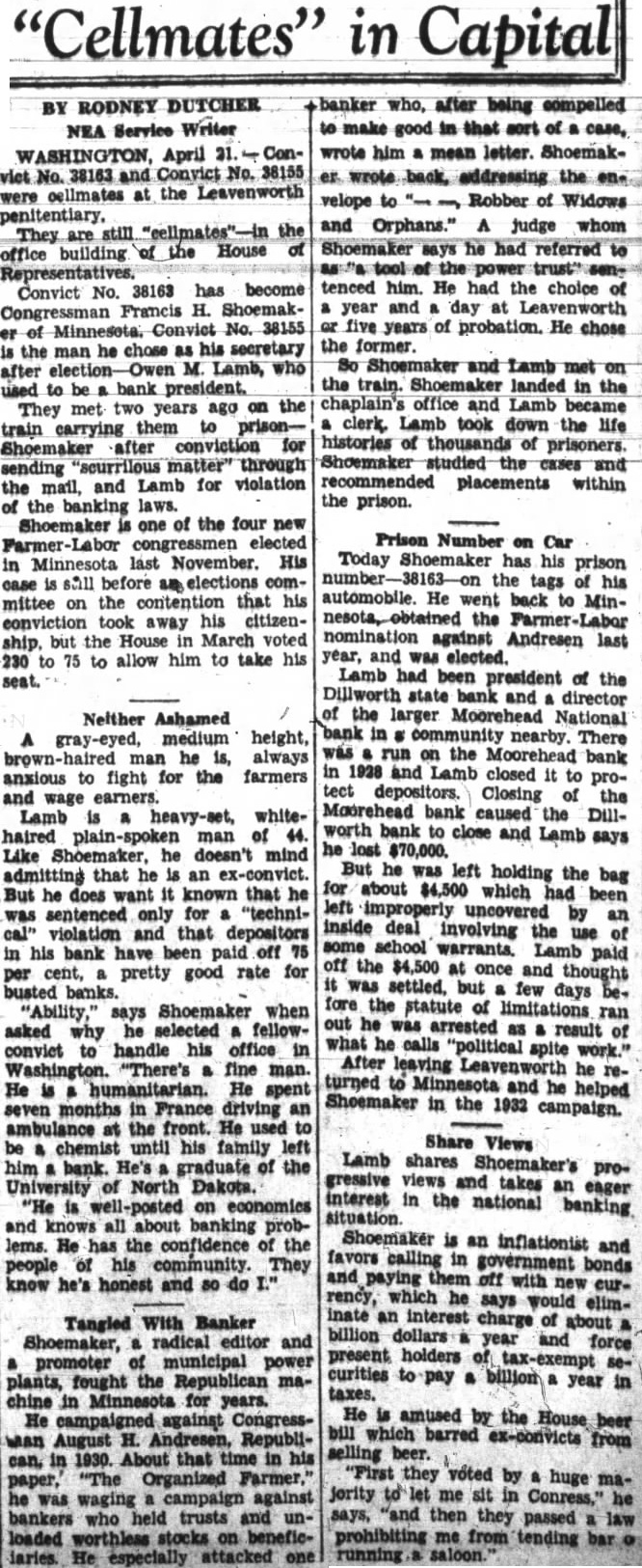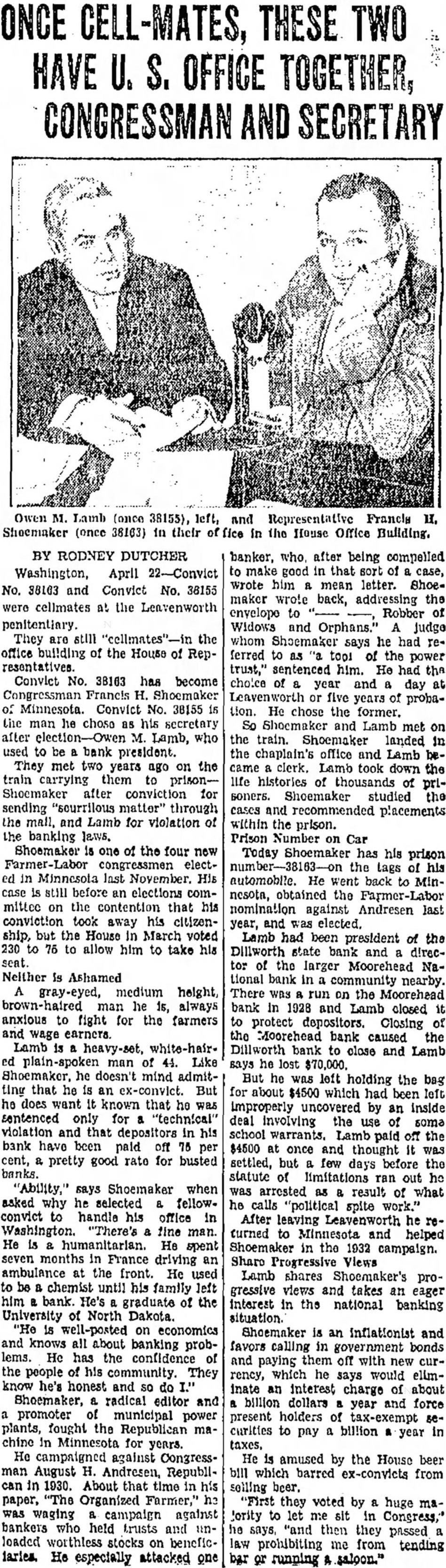 Washington, April 22-Convict No. 38103 and Convict No. 38155 were cellmates at the Leavenworth penitentiary. They are still the office building of the House of Representatives. Convict No. 38103 has become Congressman Francis H. Shoemaker of Minnesota. Convict No. 38155 15 the man he chose as his secretary after M. Lamb, who used to be bank president. They met two years ago on the train carrying them to prisonShoemaker after conviction for sending "scurrilous matter" through the mail, and Lamb for violation of the banking laws. Shoemaker one of the four new Farmer-Labor congressmen elected in Minnesota last November. His case is still before an elections committee the contention that his conviction took away his citizenship, but the House in March voted 230 to 75 to allow him to take his seat. Neither is Ashamed A gray-eyed, medium height, brown-haired man he 15, always anxious to fight for the farmers and wage earners. Lamb is heavy-set, white-haired plain-spoken man of 44. Like Shoemaker, he doesn't mind admitting that he is an ex-convict. But he does want it known that he was sentenced only for "technical" violation and that depositors in his bank have been paid off 75 per cent, pretty good rate for busted banks. "Ability," says Shoemaker when asked why he selected fellowconvict to handle office in Washington. "There's fine man. He is humanitarian. He spent seven months in France driving an ambulance at the front. He used to be chemist until his family left him bank. He's graduate of the University of North Dakota. "He well-posted on economics and knows all about banking problems. He has the confidence of the people of his community. They know he's honest and SQ do I." Shoemaker, radical editor and promoter municipal power plants, fought the Republican machine in Minnesota for years. He campaigned against Congressman August H. Andresen, Republican in 1930. About that time in his paper, "The Organized Farmer," h3 was waging a campaign against bankers who held trusts and unloaded worthless stocks on beneficHe especially attacked one banker, who, after being compelled to make good in that sort of case, wrote him mean letter. Shoemaker wrote back, addressing the envelope to Robber of Widows and Orphans." A judge whom says he had referred to as tool of the power trust," sentenced him. He had the choice of year and a day at Leavenworth or five years of probation. chose the former. So Shoemaker and Lamb met on the train. Shoemaker landed in the chaplain's office and Lamb became clerk. Lamb took down the life histories of thousands of prisoners. studied the cases and recommended placements within the prison. Prison Number on Car Today Shoemaker has his prison the tags of his automobile. He went back to Minnesota, obtained the Farmer-Labor nomination against Andresen last year, and was elected. Lamb had been president of the Dillworth state bank and director of the larger Moorehead National bank in nearby. There was run on the Moorehead bank in 1928 and Lamb closed it to protect depositors. Closing of the Moorehead bank caused the Dillworth bank to close and Lamb says he lost $70,000 But he was left holding the bag for about $4500 which had been left improperly by an Inside deal involving the use of soma school warrants. Lamb paid off the $4500 at once and thought It was settled, but few days before the statute of limitations ran out he was arrested a result of what he calls "political spite work." After leaving Leavenworth he returned to Minnesota helped Shoemaker in the 1932 campaign. Sharo Progressive Views Lamb shares Shoemaker's progressive views and takes an eager interest in the national banking situation. Shoemaker is an inflationist and favors calling in government bonds and paying them off with new currency, which he says would eliminate an interest charge of about billion dollars year and force present holders of tax-exempt securities to pay a billion a year in taxes, He is amused by the House beer bill which barred ex-convicts from selling beer. "First they voted by a huge maJority to let me sit in Congress," he says, "and then they passed law prohibiting me from tending bar or running A saloon."
