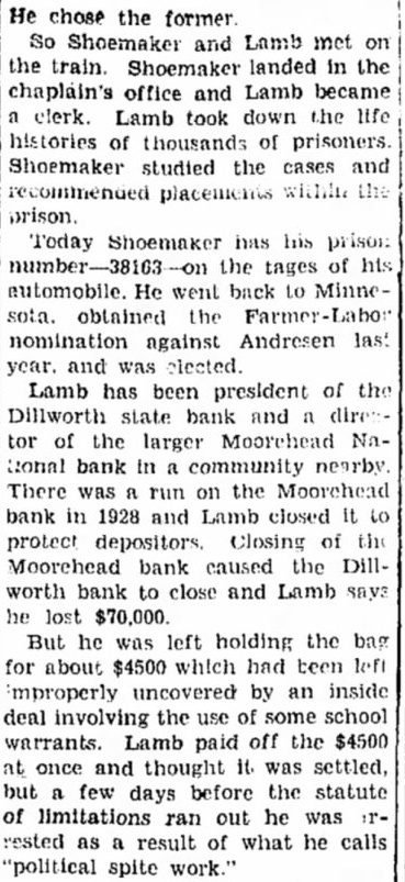 He chose the former So Shoemaker and Lamb met on the train. Shoemaker landed in the chaplain's office and Lamb became a clerk. Lamb took down the life histories of thousands of prisoners. Shoemaker studied the cases and recommended placements withh the prison. Today Shoemaker has his prison number-38163-on the tages of his eutomobile. He went back to Minnesota. obtained the Farmer-Labor nomination against Andresen las: year. and was elected. Lamb has been president of the Dillworth state bank and a directtor of the larger Moorehead NaNonal bank in a community nearby. There was a run on the Moorchead bank in 1928 and Lamb closed it to protect depositors. Closing of the Moorehead bank caused the Dillworth bank to close and Lamb says he lost $70,000. But he was left holding the bag for about $4500 which had been left improperly uncovered by an inside deal involving the use of some school warrants. Lamb paid off the $4500 at once and thought it. was settled, but a few days before the statute of limitations ran out he was :rrested as a result of what he calls "political spite work."
