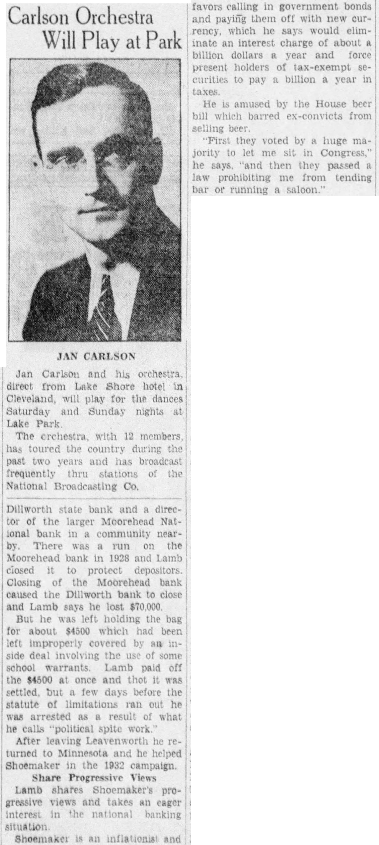 Dillworth state bank and a director of the larger Moorehead National bank in a community nearby There was a run on the Moorehead bank in 1928 and Lamb closed it to protect depositors Closing of the Moorehead bank caused the Dillworth bank to close and Lamb says he lost $70,000 But he was left holding the bag for about $4500 which had been left improperly covered by an inside deal involving the use of some school warrants. Lamb paid off the $4500 at once and thot it was settled. but a few days before the statute of limitations ran out he was arrested as result of what he calls political spite work. After leaving Leavenworth he returned to Minnesota and he helped Shoemaker in the 1932 campaign. Share Progressive Views Lamb shares Shoemaker's progressive views and takes an eager interest in the national banking situation Shoemaker is an inflationist and favors calling in government bonds and paying them off with new currency. which he says would eliminate an interest charge of about R billion dollars a year and force present holders of tax-exempt securities to pay a billion a year in taxes. He is amused by the House beer bill which barred ex-convicts from selling beer First they voted by a huge majority to let me sit in Congress, he says, "and then they passed law prohibiting me from tending bar or running saloon."