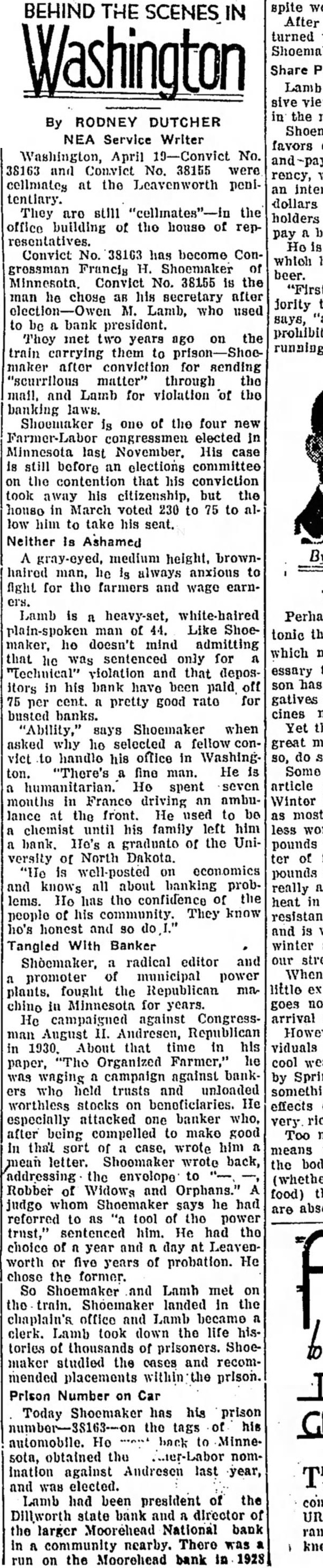 BY RODNEY DUTCHER, NEA Service Writer viet No. 38163 and Convict No. 38155 were cellmates at the Leavenworth They are still the office building of the House of Rep. resentatives. Convict No. 38163 has become Con gressman Francis H. Shoemaker of Minnesota Convict No. 38155 is the man he chose as his after Owen M. Lamb, who used to be bank president. They met two years ago on the train carrying them to prison Shoemaker after conviction for sending "scurrilous matter" through the mail, and Lamb for violation of banking laws. Shoemaker one of the four new Farmer Labor congressmen elected in Minnesota last November, His case in still before an elections com mittee on the contention that his conviction took away his citizensh but the House in March voted 230 to 75 to allow him to take his seat Neither Is Ashamed A medium height haired man he is, always anx lous to fight for the farmers and wage Lamb heavy-set. plain spoken man of 44. Like Shoe maker, he doesn't mind admitting that he is an ex-convict But he does want it known that he was sen tenced only for "technical" viola tion and that depositors in his bank have been paid off 75 per cent, pretty good rate for busted banks. "Ability," says Shoemaker when asked why he selected fellow vict to handle his office in Wash ington. "There's fine man. He is humanitarian. He spent seven months in France driving an am bulance at the front. He used to be chemist until his family left him bank. graduate of the Uni versity of North Dakota. "He is on economics and knows all about banking prob lems. He has the confidence of the people of his community They know he's honest and so do I." Tangled With Banker Shoemaker, radical editor and promoter of municipal power plants, fought the Republican ma chine in Minnesota for years. He campaigned against Congress man August H. Andresen. Republi can in 1930. About that time in his paper "The Organized Farmer, he was waging campaign against bankers who held trusts and un loaded stocks on benefi ciaries. He especially attacked one banker who, after being compelled to make good in that sort of case wrote him mean letter er wrote back, addressing the envelope to Robber Widows and Orphans judge whom says he had re ferred to "a tool of the power trust," sentenced him. He had the choice of year and day Leavenworth five years of probation. He close the former So Shoemaker and Lamb met on the train. landed in the chaplain's office and Lamb clerk. Lamb took down the life histories of thousands of prisoners Shoemaker studied the cases and recommended placements within the prison. Prison Number on Car Today Shoemaker has his prison the tags of his automobile He went back to Minne sota, obtained the Farmer Labor nomination against Andresen last and was elected. Lamb had been president of the Dillworth state bank and direc tor of the larger Moorehead Nation al bank in community nearby There was run the Moorehead bank in 1928 and Lamb closed protect depositors Closing of the Moorhead bank caused Dillworth bank to close and Lamb says he lost But he was left holding the bag for about $4,500 which had been left improperly uncovered by an Inside deal involving the use some school Lamb paid off the at once and thought was but few before days the satute of ran out he was arrested as result of what he "political spite work After leaving Leavenworth he returned to and he helped Shoemaker the 1932 campaign. Share Progressive Views Lamb Shoemaker's progres sive and takes an eager interest in the national banking situais an inflationist and favors calling in government bonds and paying them off with new cur rency. which he says would eliminate an interest charge of about billion year and force pres ent holders of securities to pay billion year in taxes He amused by the House beer bill which barred convicts from selling beer "First they voted by a huge ma jority to let me Congress,' he says, "and then they law prohibiting me from tending bar or running