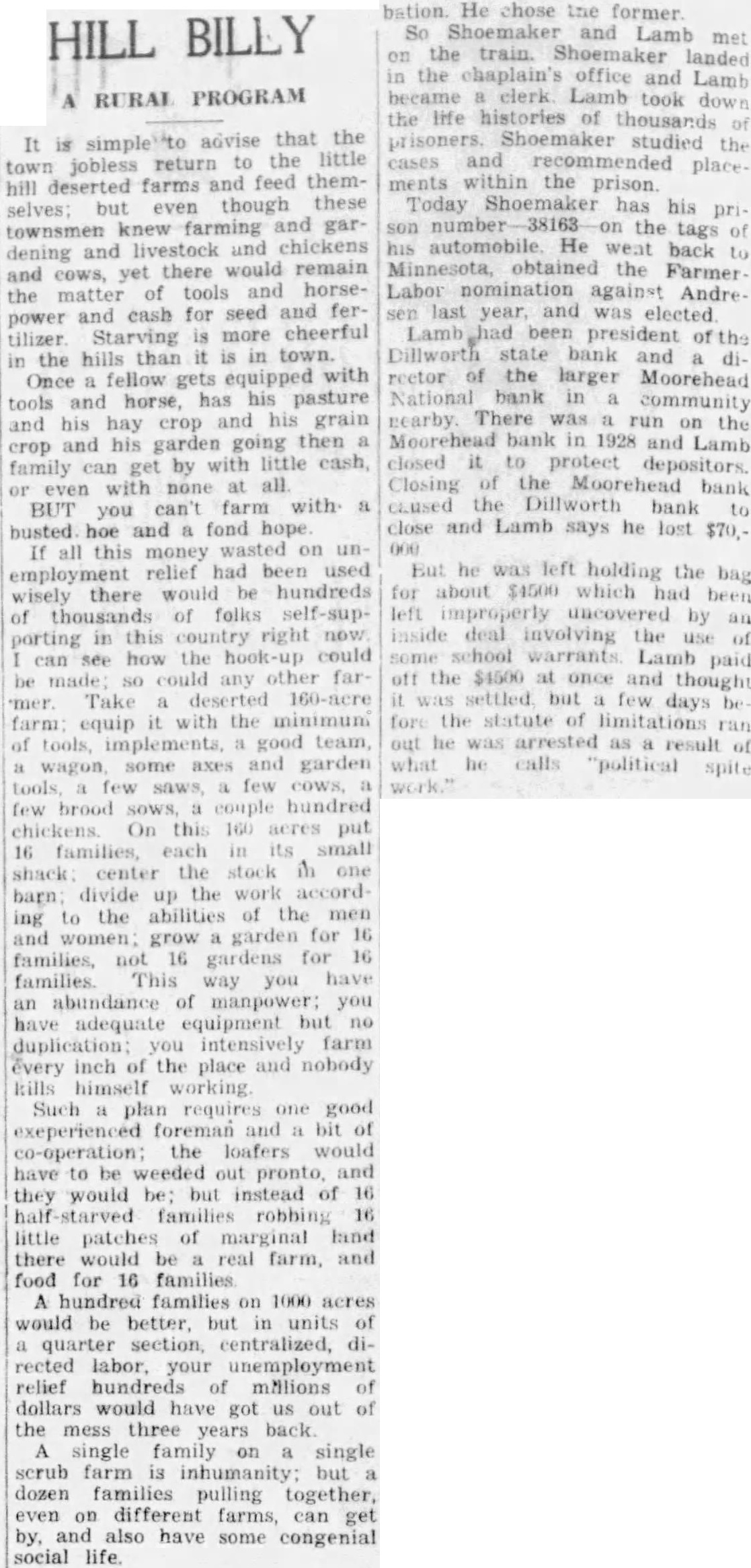 It is simple advise that the town jobless return to the little hill deserted farms and feed themselves; but even though these townsmen knew farming and gar dening and livestock and chickens and cows, yet there would remain the matter of tools and horsepower and cash for seed and fertilizer Starving is more cheerful in the hills than it is in town. Once a fellow gets equipped with tools and horse, has pasture and his hay crop and his grain crop and his garden going then family can get by with little cash, or even with none at all BUT you can't farm with a busted hoe and a fond hope. If all this money wasted on unemployment relief had been used wisely there would be hundreds of thousands of folks self-supporting in this country right now can see how the hook-up could be made so could any other farmer. Take a deserted 160-acre farm: equip it with the minimum of tools, implements, a good team, wagon, some axes and garden tools, few saws, few cows, few brood sows, couple hundred chickens On this 160 acres put 16 families, each in its small shack center the stock in one barn: divide the work accord ing to the abilities of the men and women; grow garden for 16 families, not 16 gardens for 16 families This way you have an abundance of manpower you have adequate equipment but no duplication you intensively farm every inch of the place and nobody kills himself working. Such plan requires one good exeperienced foreman and bit of co-operation; the loafers would have to be weeded out pronto, and they would be: but instead of 16 half-starved families robbing 16 little patches of marginal land there would be real farm, and food for 16 families A hundred families on 1000 acres would be better, but in units of a quarter section, centralized, directed labor, your unemployment relief hundreds of millions of dollars would have got us out of the mess three years back A single family on single scrub farm is inhumanity: but a dozen families pulling together, even on different farms, can get by, and also have some congenial social life. bation. He chose the former So Shoemaker and Lamb met on the train. Shoemaker landed in the chaplain's office and Lamb became clerk Lamb took down the life histories of thousands of prisoners. Shoemaker studied the cases and recommended place. ments within the prison. Today Shoemaker has his prison 38163 on the tags of his automobile He weat back to Minnesota, obtained the Farmer Labor nomination against Andresen last year, and was elected Lamb had been president of the Dillworth state bank and a director of the larger Moorehead National bank in a community nearby. There was a run on the Moorehead bank in 1928 and Lamb closed it to protect depositors. Closing of the Moorehead bank caused the Dillworth bank to close and Lamb says he lost $70.000