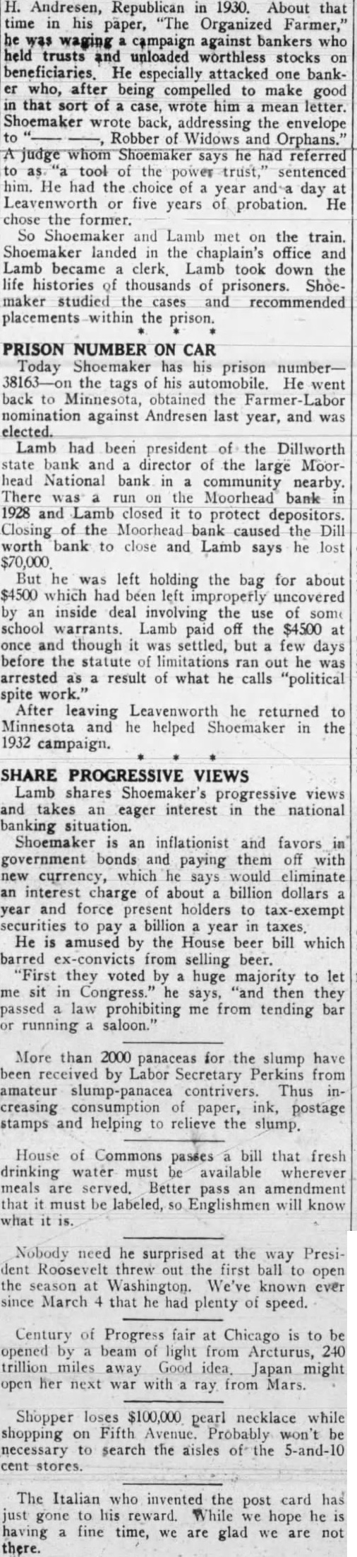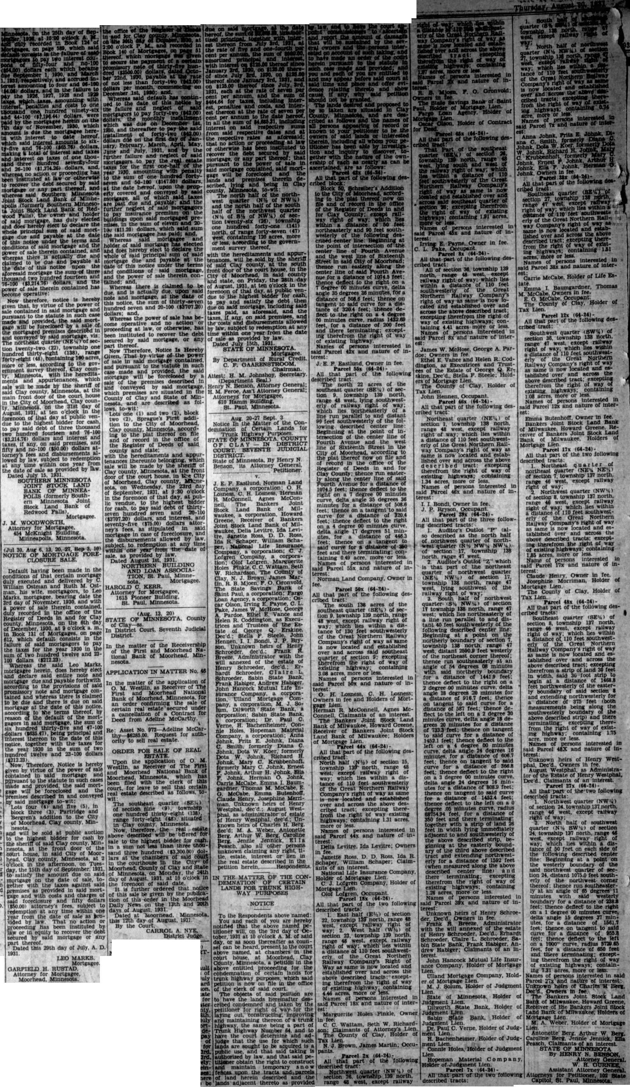 dollars 1930. interest recover mortgage (formerly whereas payable aforesaid and operative is made northeast township according three interest dollars SOUTHERN MINNESOTA MINNEA(formerly South Minnesota Joint Bank of Redwood McKnight Building, Minnesota. NOTICE FORE CLOSURE SALE. Default having certain executed and delivered Ostman Ruth mortgagors, 1930. Register and dollars ($212.23) Marks, Whereas reason mortgage dollars twelve Therefore, mortgage addition Moorhead, Clay attorney's within from That instituted the mortgage this 29th day July, LEO MARKS Mortgagee GARFIELD RUSTA mortgage, pres mortgage, any Hereby power sale provided, mortgage which County nesota, to-wit: and block Register Deeds hereditaments Wednesday forenoon highest ($75.00) dollars ney's stipulated mortgage foreclosure allowed redemption within August 1931. NORTHERN BUILDING ASSOCIATION, MinneMortgagee. HAROLD KERR Attorney Mortgagee, Pioneer Building, STATE MINNESOTA, County District Court, Seventh Judicial matter Receivership the tional Bank Moorhead, Minnesota APPLICATION IN MATTER No. 46 the matter estate cancellation Contract Deed from Adeline McCarthy Adeline McCarRequest authority sell real estate ORDER SALE OF REAL ESTATE Upon the application Westlin, Receiver Moorhead, filed estate described southeast section situated county described bidder chambers County Minnesota, Monday August ordered given order 13th August, CARROL NYE, District Judge the date STATE MINNESOTA Mortgagee By GAARENSTROOM Chairman Attest: Johnshoy Secretary for Mortgagee, Building Paul. Minnesota Notice ConCertain Lands MINNESOTA COUNTY DISTRICT COURT SEVENTH JUDICIAL DISTRICT Henry Benson Attorney Petitioner Eastlund, Norman Company Losness, Agnes McConMcConnell, Bankers Joint waukee, Receiver Janette Ross, Schaper William SchaNational Company corporation; Lofgren Company, corporaMarguerite Richardson, County Savings corporation Irving James McHose, Trustees Dec'd.; Breeze Henry Schroeder Sabin Bank, Frank Habiger, Andrew Habiger John Hancock Mutual Company Mortgage corporation, Dilworth Hopeman Johnk Johnk, Diana Smith formerly Diana Dota Richard Johnk, Johnk, Johnk, McCabe Henry, Josephine Unknown heirs Westphal known Charles dec'd: Antonette Jennie other interest estate described THE THE CERTAIN LANDS TRUNK HIGHPURPOSES the Respondents named each titioner named, at chambers entitled proceeding condemnation certain trunk purposes, which said office objects petition taken maintaining thereon trunk the being Highway Number 64. have judge for which sought acquired public that petitioner obtain right maintain temporary snow upon tracts parcels herein lands adjacent thereto as provided distance terminating: therefrom existing highway nature in- following north acres township north, railway northeasterly southwesterly center Beginning point tersection line Avenue Sixteenth Street thereof Deeds and County: thence center distance feet; thence degree curve, minutes distance tangent degree delta 446.3 curve distance taining acre, Names persons Parcel nature Norman Land Company, Owner southwest the Parcel des northwest quarter section township north, range southeast quarter which northeasterly township except railway within center Great Northern Beginning northerly Company's township north range located across southeast distant excepting northeast corner quarter southeasterly degrees minutes existing highway more distance 1441.9 and thence deflect right Parcel nature degree minutes degrees minutes Losness, Holders distance feet; tangent curve McConnell, Agnes Mc thence degree Bankers curve, Milwaukee minutes Bankers Stock thence on tangent Holders distance thence deflect Mortgage degree Parcel degrees of the following desdistance North section tangent distance 366.8 township north, except railway thence deflect right way; within degree degrees Great Northern Railway of distance tangent located and established distance 1452.4 feet: across the above excepting there- minutes existing distance terminating highways: containing acres. more width Names persons Parcel 44x and nature southwesterly above described easterly Delia Levitre. Ida Levitre; Owners described extending northwestJanette Ross, Ross, Ida distance 1592 Schaper William Schaper; Claiminterest measured described center and Insurance Company there terminating excepting Holder Mortgage Lofgren Company, Holder of therefrom way existing highways; acres, Parcel Parcel and nature inthe two following described heirs SchroeEast Owners township right annexed estate way; Erhardt section 23 township Claire Schroeder range within State Bank, Habiger, southwest- Habiger; Claimants Great Northern Hancock Mutual InsurRailway Company's Right Company, Holder Mortgage same located established across Mortgage above described tracts therefrom right Solum. Holder of Judgment existing acres, more persons interested State Minnesota, Holder of said Parcel nature inter- Judgment Dilworth State Bank, Holder of Marguerite Holes Finkle, Owner Judgment Sabin State Bank, Holder Wattam, W RichardPaul Verne, Holder of JudgClaimants County of Clay, Holder Bachenheimer Holder Judg Tax Brown, James Martin; OccuConnie Holes Holder of Judgment Parcel following Hopeman Material Judgment Parcel Northwest quarter of two following township described tracts: range west, except railway of inGronvold F. Saint Holder of Contract and nature fee in the township which distance therefrom acres more Names persons interested nature W McHose George A. ParEthel Vance and Helen CodExecutrices the Estate George Mortgage Lien. County Clay. Holder of John Hennen, Occupant part following Northeast quarter (NE%) township north range except which lies distance southwestGreat Northern Company's right located lished across tract: excepting therefrom right way existing highways; interested 46x and nature in- Bondi, Owner three followdescribed Auditor's described the half northwest quarter section township 138 Auditor's which northeast quarter (NE% secti