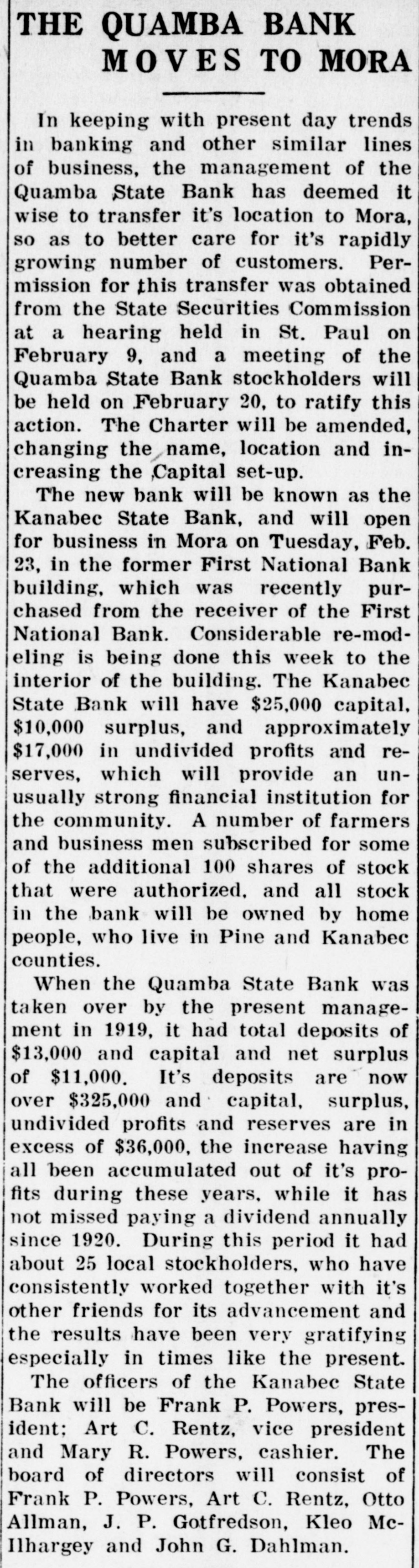 THE QUAMBA BANK MOVES TO MORA In keeping with present day trends in banking and other similar lines of business, the management of the Quamba State Bank has deemed it wise to transfer it's location to Mora, so as to better care for it's rapidly growing number of customers. Permission for this transfer was obtained from the State Securities Commission at a hearing held in St. Paul on February 9, and a meeting of the Quamba State Bank stockholders will be held on February 20, to ratify this action. The Charter will be amended, changing the name, location and increasing the ,Capital set-up. The new bank will be known as the Kanabec State Bank, and will open for business in Mora on Tuesday, Feb. 23, in the former First National Bank building, which was recently purchased from the receiver of the First National Bank. Considerable re-modeling is being done this week to the interior of the building. The Kanabec State Bank will have $25,000 capital, $10,000 surplus, and approximately $17,000 in undivided profits and reserves, which will provide an unusually strong financial institution for the community. A number of farmers and business men subscribed for some of the additional 100 shares of stock that were authorized. and all stock in the bank will be owned by home people, who live in Pine and Kanabec counties. When the Quamba State Bank was taken over by the present management in 1919, it had total deposits of $13,000 and capital and net surplus of $11,000. It's deposits are now over $325,000 and capital, surplus, undivided profits and reserves are in excess of $36,000, the increase having all been accumulated out of it's profits during these years, while it has not missed paying a dividend annually since 1920. During this period it had about 25 local stockholders, who have consistently worked together with it's other friends for its advancement and the results have been very gratifying especially in times like the present. The officers of the Kanabec State Bank will be Frank P. Powers, president: Art C. Rentz, vice president and Mary R. Powers, cashier. The board of directors will consist of Frank P. Powers, Art C. Rentz, Otto Allman, J. P. Gotfredson, Kleo McIlhargey and John G. Dahlman.