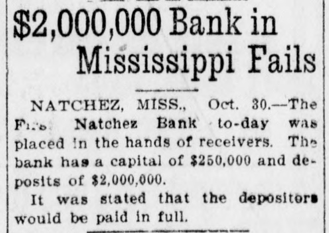 A notice posted on the door of the First Natchez bank this morning announced the fact that the bank has been placed in the hands of receivers who will wind up its affairs. ... It was stated that the depositors would be paid in full.
