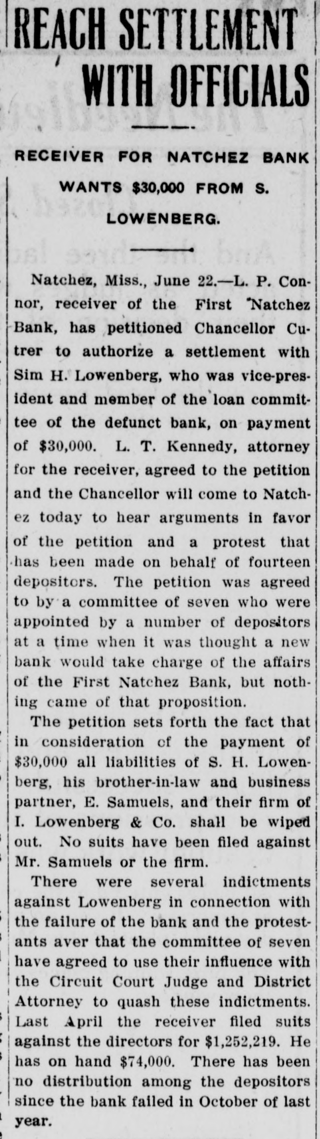 REACH SETTLEMENT WITH OFFICIALS RECEIVER FOR NATCHEZ BANK WANTS $30,000 FROM S. LOWENBERG. Natchez, Miss., June 22.-L. P. Connor, receiver of the First "Natchez Bank, has petitioned Chancellor Cutrer to authorize a settlement with Sim H. Lowenberg, who was vice-president and member of the loan committee of the defunct bank, on payment of $30,000. L. T. Kennedy, attorney for the receiver, agreed to the petition and the Chancellor will come to Natchez today to hear arguments in favor of the petition and a protest that has been made on behalf of fourteen depositors. The petition was agreed to by a committee of seven who were appointed by a number of depositors at a time when it was thought a new bank would take charge of the affairs of the First Natchez Bank, but nothing came of that proposition. The petition sets forth the fact that in consideration of the payment of $30,000 all liabilities of S. H. Lowenberg, his brother-in-law and business partner, E. Samuels, and their firm of I. Lowenberg & Co. shall be wiped out. No suits have been filed against Mr. Samuels or the firm. There were several indictments against Lowenberg in connection with the failure of the bank and the protestants aver that the committee of seven have agreed to use their influence with the Circuit Court Judge and District Attorney to quash these indictments. Last April the receiver filed suits against the directors for $1,252,219. He has on hand $74,000. There has been no distribution among the depositors since the bank failed in October of last year.