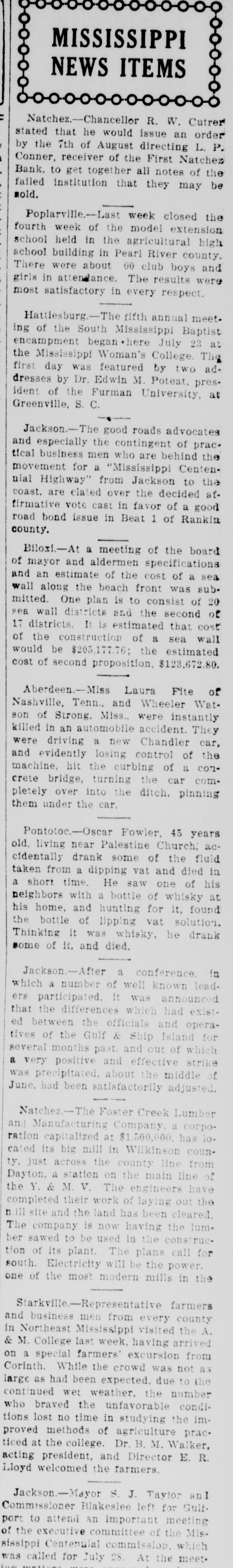 MISSISSIPPI NEWS ITEMS Natchez.-Chanceller R. W. Cutrer stated that he would issue an order by the 7th of August directing L. P. Conner, receiver of the First Natchez Bank. to get together all notes of the failed institution that they may be sold. Poplarville.-Last week closed the fourth week of the model extension school held in the agricultural high school building in Pearl River county. There were about 00 club boys and girls in attendance. The results were most satisfactory in every respect. Hattiesburg.-The fifth annual meeting of the South Mississippi Baptist encampment began here July 23 at the Mississippi Woman's College. The first day was featured by two addresses by Dr. Edwin M. Poteat, president of the Furman University, at Greenville, S. C. Jackson.-The good roads advocates and especially the contingent of practical business men who are behind the movement for a "Mississippi Centennial Highway" from Jackson to the coast. are elated over the decided affirmative vote cast in favor of a good road bond issue in Beat 1 of Rankin county. Biloxi-At a meeting of the board of mayor and aldermen specifications and an estimate of the cost of a sea wall along the beach front was sub. mitted. One plan is to consist of 20 sea wall districts and the second of 17 districts. It is estimated that cost of the construction of a sea wall would be $205,177.76; the estimated cost of second proposition, $123,672.80. Aberdeen.-Miss Laura Fite of Nashville, Tenn., and Wheeler Watson of Strong. Miss., were instantly killed in an automobile accident. They were driving a new Chandler car, and evidently losing control of the machine, hit the curbing of a concrete bridge, turning the car completely over into the ditch, pinning them under the car. Pontotoc.-Oscar Fowler, 45 years old. living near Palestine Church; accidentally drank some of the fluid taken from a dipping vat and died in a short time. He saw one of his neighbors with a bottle of whisky at his home, and hunting for it, found the bottle of lipping vat solution. Thinking it was whisky, he drank some of it. and died. Jackson.-After a conference. in which a number of well known leaders participated, it was announced that the differences which had existed between the officials and operatives of the Gulf & Ship Island for several months past. and out of which a very positive and effective strike was precipitated, about the middle of June, had been satisfactorily adjusted. Natchez.-The Foster Creek Lumber and Manufacturing Company. a corporation capitalized at $1,500,000. has lo. cated its big mill in Wilkinson county, just across the county line from Dayton, a station on the main line of the Y. & M. V. The engineers have completed their work of laying out the nill site and the land has been cleared. The company is now having the lumber sawed to be used in the construction of its plant. The plans call for south. Electricity will be the power. one of the most modern mills in the Starkville.-Representative farmers and business men from every county in Northeast Mississippi visited the A. & M. College last week, having arrived on a special farmers' excursion from Corinth. While the crowd was not as large as had been expected. due to the continued wet weather. the number who braved the unfavorable conditions lost no time in studying the improved methods of agriculture practiced at the college. Dr. B. M. Walker, acting president, and Director E. R. Lloyd welcomed the farmers. Jackson.Mayor S. J. Taylor anl Commissioner Blakeslee left for Gulf. port to attend an important meeting of the executive committee of the Mississippi Centenuial commission. which was called for July 28. At the meet.