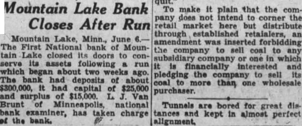 Mountain Lake Bank Closes After Run Mountain Lake, Minn., June forbidding The First National bank of Mounthe company to sell coal to any tain Lake closed its doors to conone in which serve its assets following run interested financially and which began about two weeks ago. pledging the to sell its The had deposits of about coal more than one wholesale $300,000, had capital $25,000 purchaser. and of $15,000. Van Brunt national Tunnels are bored for great disbank examiner, has taken charge tances kept in almost perfect the bank.