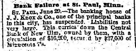 Bank Failure at St. Paul, Minn. ST. PAUL, June 29.-The banking house of J. J. Knox & Co., one of the principal banks in this city, has suspended. Liabilities not very large. This carries do wn the Central Bank of New Ulm. owned by them, with a circulation of $16,200, tecur d by $27,000 of
