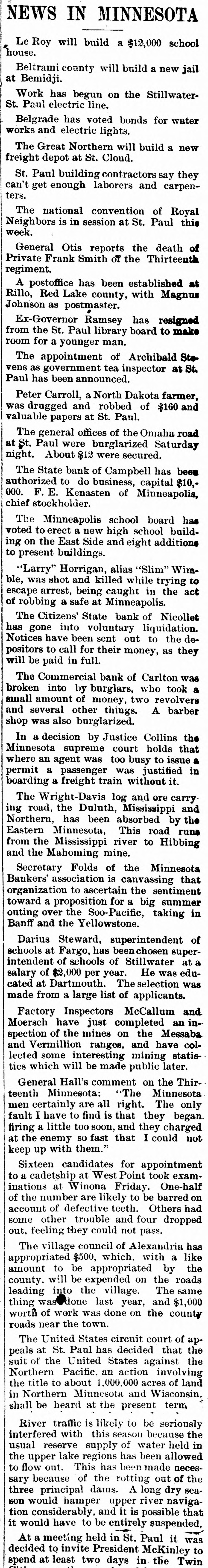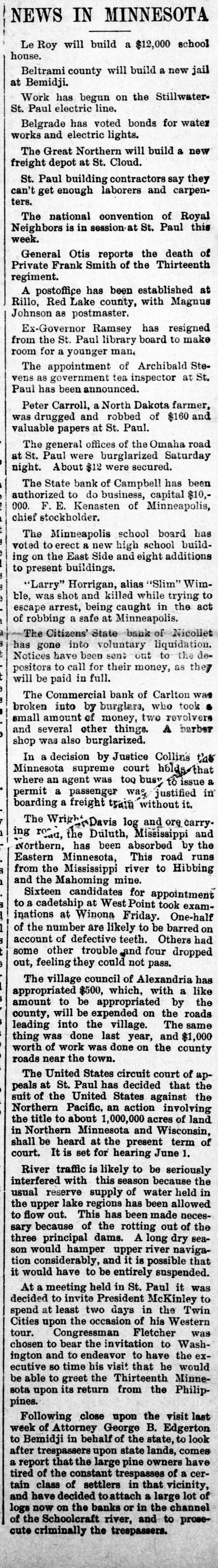 NEWS IN MINNESOTA Le Roy will build a $12,000 school house. Beltrami county will build a new jail at Bemidji. Work has begun on the StillwaterSt. Paul electric line. Belgrade has voted bonds for water works and electric lights. The Great Northern will build a new freight depot at St. Cloud. St. Paul building contractors say they can't get enough laborers and carpenters. The national convention of Royal Neighbors is in session-at St. Paul this week. General Otis reports the death of Private Frank Smith of the Thirteenth regiment. A postoffice has been established at Rillo, Red Lake county, with Magnus Johnson as postmaster. Ex-Governor Ramsey has resigned from the St. Paul library board to make room for a younger man. The appointment of Archibald Stevens as government tea inspector at St. Paul has been announced. Peter Carroll, a North Dakota farmer, was drugged and robbed of $160 and valuable papers at St. Paul. The general offices of the Omaha road at St. Paul were burglarized Saturday night. About $12 were secured. The State bank of Campbell has been authorized to do business, capital $10,000. F. E. Kenasten of Minneapolis, chief stockholder. The Minneapolis school board has voted to erect a new high school building on the East Side and eight additions to present buildings. "Larry" Horrigan, alias "Slim" Wimble, was shot and killed while trying to escape arrest, being caught in the act of robbing a safe at Minneapolis. The Citizens' State bank Nicollet has gone into voluntary liquidation. Notices have been sent out to the depositors to call for their money, as they will be paid in full. The Commercial bank of Carlton was broken into by burglars, who took & small amount of money, two revolvers and several other things. A barber shop was also burglarized. In a decision by Justice Collins the Minnesota supreme court holds that where an agent was too busy to issue a permit a passenger was, justified in boarding a freight train without it. The Wright log and ore carrying road, the Duluth, Mississippi and Northern, has been absorbed by the Eastern Minnesota, This road runs from the Mississippi river to Hibbing and the Mahoming mine. Sixteen candidates for appointment to a cadetship at West Point took examinations at Winona Friday. One-half of the number are likely to be barred on account of defective teeth. Others had some other trouble and four dropped out, feeling they could not pass. The village council of Alexandria has appropriated $500, which, with a like amount to be appropriated by the county, will be expended on the roads leading into the village. The same thing was done last year, and $1,000 worth of work was done on the county roads near the town. The United States circuit court of appeals at St. Paul has decided that the suit of the United States against the Northern Pacific, an action involving the title to about 1,000,000 acres of land in Northern Minnesota and Wisconsin, shall be heard at the present term of court. It is set for hearing June 1. River traffic is likely to be seriously interfered with this season because the usual reserve supply of water held in the upper lake regions has been allowed to flow out. This has been made necessary because of the rotting out of the three principal dams. A long dry season would hamper upper river navigation considerably, and it is possible that it would have to be entirely suspended. At a meeting held in St. Paul it was decided to invite President McKinley to spend at least two days in the Twin Cities upon the occasion of his Western tour. Congressman Fletcher was chosen to bear the invitation to Washington and to endeavor to have the executive so time his visit that he would be able to greet the Thirteenth Minnesota upon its return from the Philippines. Following close upon the visit last week of Attorney George B. Edgerton to Bemidji in behalf of the state, to look after trespassers upon state lands, comes a report that the large pine owners have tired of the constant trespasses of a certain class of settlers in that vicinity, and have decided toattach a large lot of logs now on the banks or in the channel of the Schoolcraft river, and to prosecute criminally the trespassers.