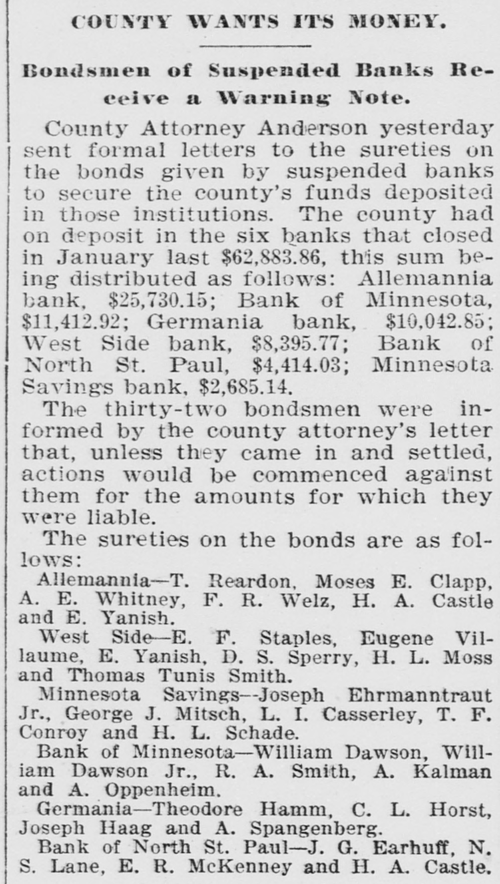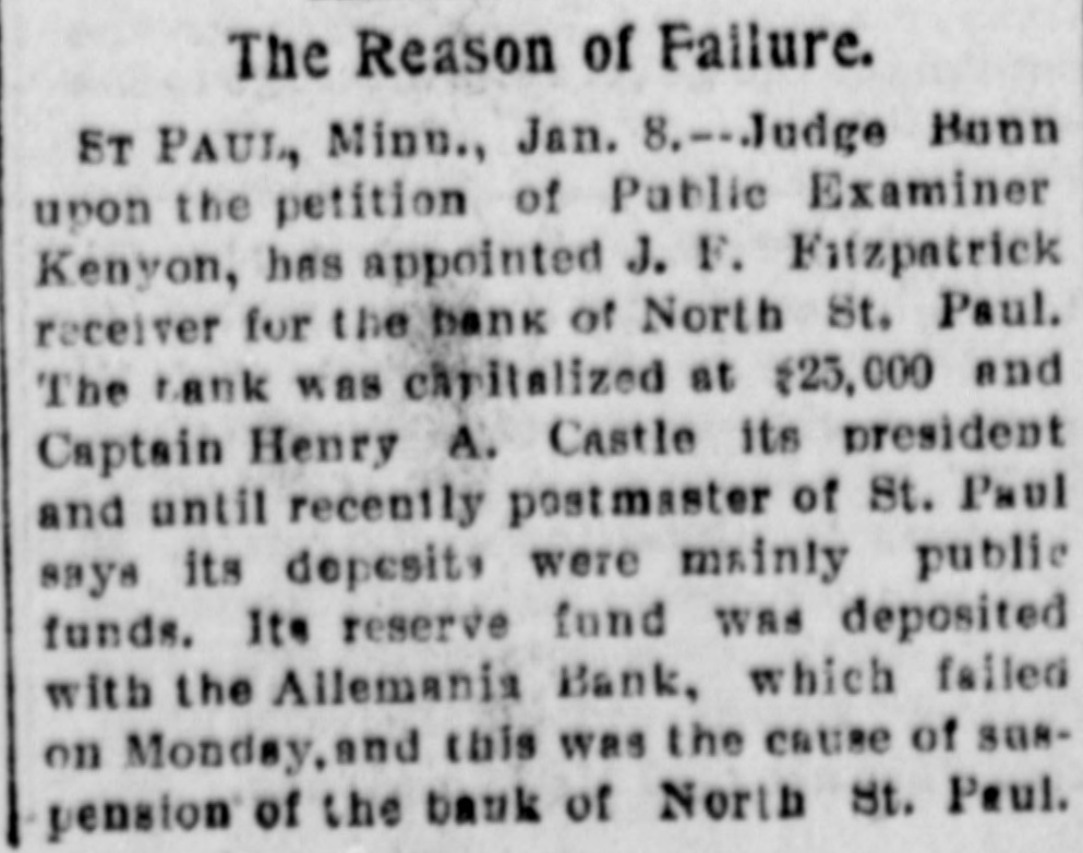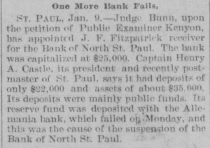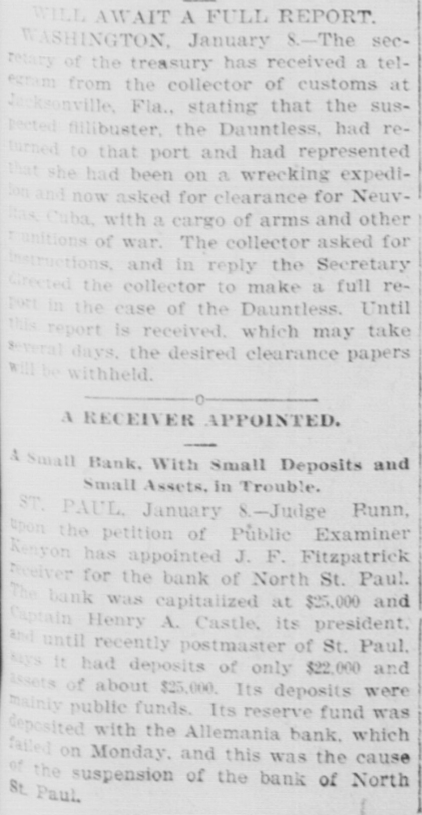 Five young men who comprise a gang of the most daring bank swindlers and forgers that has operated in this country in 20 years were captured in Chicago. The number of steerage passengers landed at Ellis island during 1896 was 252,350. There were 99,223 cabin passengers landed at the port of New York during the same period. Fire destroyed property at Athens, Tex., valued at $100,000. Fire destroyed the entire business portion of Royalton. Wis. In Minnesota the Bank of Canton at Canton and the Citizens' bank of Lanesboro, both owned and operated by Field, Kelsey & Co., suspended business. J. H. Johnston & Co., silversmiths and jewelers in New York, failed for $250,000. Simon Cooper, a negro outlaw, murdered Ben Wilson, aged 80 years, his son Wesley, aged 40. and Mrs. Wesley Wilson, aged 35, and a colored man at Magnolia, S. C. The refusal of Wilson to loan Cooper a buggy was the cause. Senator-elect Money, of Mississippi, arrived at Tampa, Fla., from Cuba and left for Washington. The Bankers' exchange bank in Minneapolis, Minn., which suspended some days ago, has resumed business. William J. Bryan was the guest of the Bryan league at a banquet given at the Tremont house in Chicago in celebration of the anniversary of Andrew Jackson's birth and made the principal speech. Anthony Henderson, a negro arrested for the murder of George Summer at Unadilla, Ga., and attempted assault upon his daughter, was lynched by a mob. John Vaughan and Gus Homer, armed with a pistol and knife, engaged in a duel at Memphis, Tenn., and both were fatally wounded. The fiftieth session of the general assembly of Indiana met in Indianapolis. Henry C. Pettit, of Wabash, was chosen speaker of the house. The American national bank of Denver, Col., which suspended April 21, 1896, has reopened its doors. The United States dispatch boat Dolphin arrived at Jacksonville, Fla., to watch filibusters. Howard Wilson and Miss Fay Rawls broke through the ice while skating at Creston, la., and in saving the life of the young lady Wilson lost his own. William Speidel, 21 years of age, was robbed and murdered while on his way to be married at Port Jervis, N. Y. R. G. Dun & Co., of New York, in their weekly review of trade say that while banking failures have not ceased at the west, apprehension about them has almost wholly subsided and no serious influence upon general trade is expected Thomas Wilson, accompanied by his daughter, Mrs. Kinnery, and her tive children, attempted to ford Práirie creek near Plato, Mo., and the children were all drowned. The exchanges at the leading clearing houses in the United States during the week ended on the 8th aggregated $1.144,639,080, against $1,055,921,223 the previous week. The decrease compared with the corresponding week of 1896 was 7.6. There were 488 business failures in the United States in the seven days ended on the 8th, against 329 the week previous and 405 in the corresponding period of 1896. In his message to the Missouri legislature Gov. Stone advocated the hanging of persons convicted of train robbery. The Bank of North St. Paul, Minn., closed its doors with liabilities of $25,000. Robbers blew open a safe in the post office at Blooming Grove, Tex., and secured $9,000. The office of the Leader, a newspaper at Montpelier, O., was burned, the loss being $10,000. Simon Cooper, a negro outlaw, who murdered thaee members of the Wilson family and a colored servant, was lynched near Sumter. S.C. Gov. Matthews in his last message to the Indiana legislature expressed strong sympathy for the Cuban insurgents and advocated compulsory education and a law prohibiting the formation of trusts in the state. The North Carolina legislature passed a resolution instructing the senators and congressmen from that state to try and bring about the passage of an act recognizing the independence of the patriots of Cuba. Charles Walstrom and Mike Martin, who lived on an island across the bay from Charlevoix, Mich., were murdered by unknown parties. The First national bank of Alma, Neb., was closed with liabilities of $134,000. Robert Laughlin was hanged at Brooksville, Ky., for the murder of his invalid wife and 14-year-old niece. After the murder he set fire to the house and the bodies were consumed. Senator-elect Money, of Mississippi, who has just returned to Washington from a two weeks' visit to Cuba, says that Spain is unable to cope with the insurrection: that she will never put it