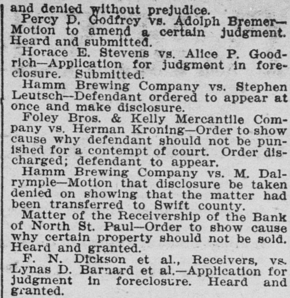 Judgments have been entered in all pending actions, except the bondsmen of banks which have been paid in full, and except, also, the Columbia National bank of Minneapolis, the Marine National bank of Duluth and the Fillmore County bank of Preston, in which action is stiil pending.