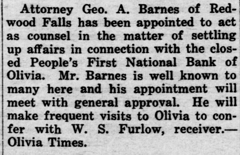 Attorney Geo. A. Barnes of Redwood Falls has been appointed to act as counsel in the matter of settling up affairs in connection with the closed People's First National Bank of Olivia. Mr. Barnes is well known to many here and his appointment will meet with general approval. He will make frequent visits to Olivia to confer with W. S. Furlow, receiver.Olivia Times.