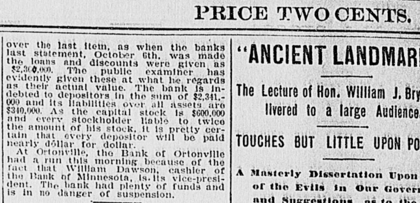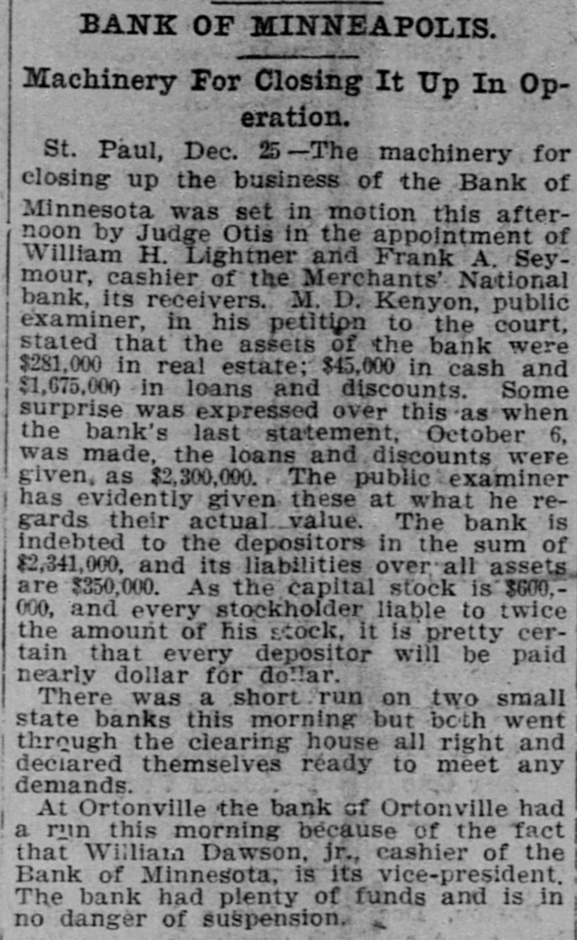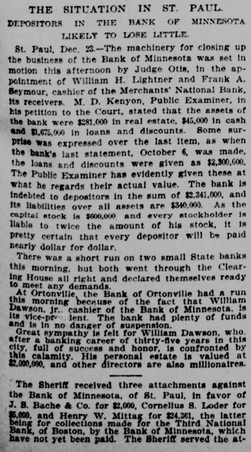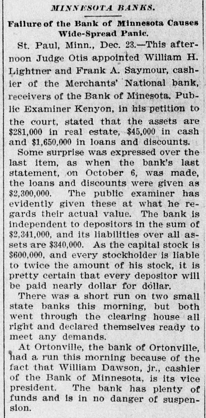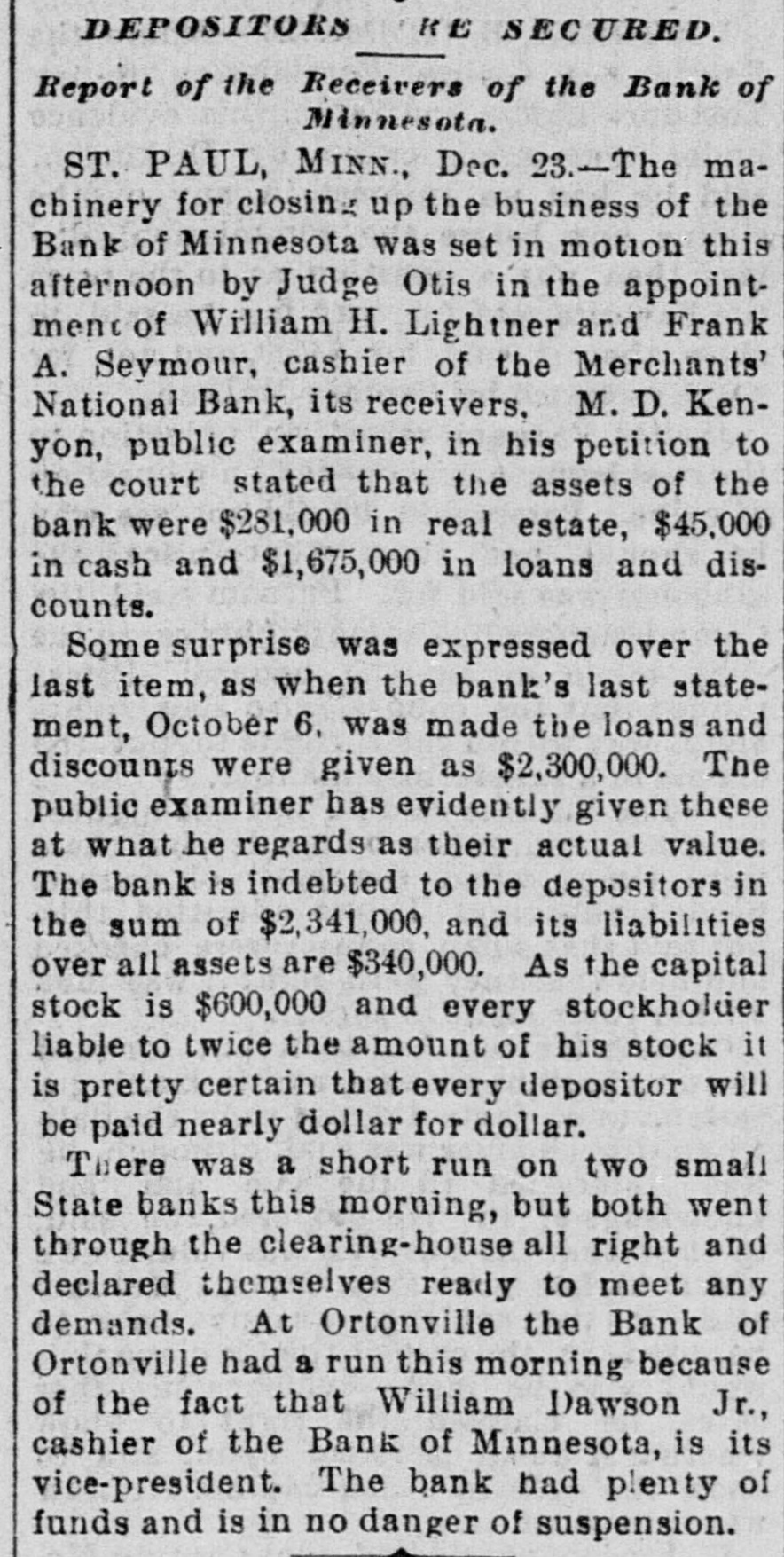 MINNESOTA BANKS. Failure of the Bank of Minnesota Causes Wide-Spread Panic. St. Paul, Minn., Dec. 23.-This afternoon Judge Otis appointed William H. Lightner and Frank A. Saymour, cashier of the Merchants' National bank, receivers of the Bank of Minesota. Public Examiner Kenyon, in his petition to the court, stated that the assets are $281,000 in real estate, $45,000 in cash and $1,650,000 in loans and discounts. Some surprise was expressed over the last item, as when the bank's last statement, on October 6, was made, the loans and discounts were given as $2,300,000. The public examiner has evidently given these at what he regards their actual value. The bank is independent to depositors in the sum of $2,341,000, and its liabilities over all assets are $340,000. As the capital stock is $600,000, and every stockholder is liable to twice the amount of his stock, it is pretty certain that every depositor will be paid nearly dollar for dollar. There was a short run on two small state banks this morning, but both went through the clearing house all right and declared themselves ready to meet any demands. At Ortonville, the bank of Ortonville, had a run this morning because of the fact that William Dawson, jr., cashier of the Bank of Minnesota, is its vice president. The bank has plenty of funds and is in no danger of suspension.