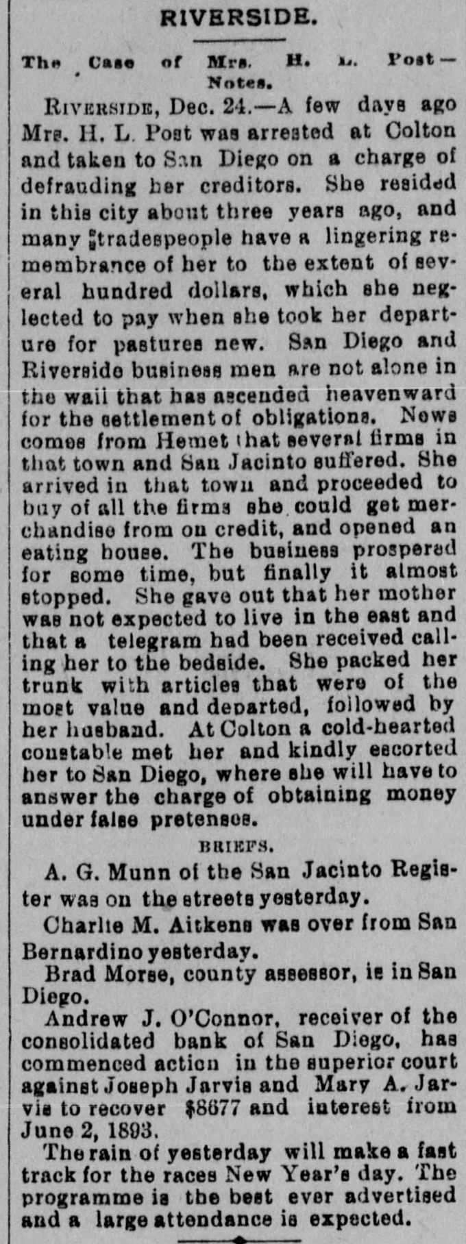 RIVERSIDE. The Case of Mrs. H. M. Post Notes. RIVERSIDE, Dec. 24.-A few days ago Mrs. H. L. Post was arreated at Colton and taken to San Diego on a charge of defrauding her creditors. She resided in this city about three years ago, and many "tradespeople have 8 lingering remembrance of her to the extent of several hundred dollars, which she neglected to pay when ahe took her departure for pastures new. San Diego and Riverside business men are not alone in the waii that has ascended heavenward for the settlement of obligations. News comes from Homet that several firms in that town and San Jacinto suffered. She arrived in that town and proceeded to buy of all the firms she could get merchandise from on credit, and opened an eating house. The business prospered for some time, but finally it almost stopped. She gave out that her mother was not expected to live in the east and that a telegram had been received calling her to the bedside. She packed her trunk with articles that were of the most value and departed, followed by her husband. At Colton a cold-hearted constable met her and kindly eecorted her to San Diego, where she will have to answer the charge of obtaining money under false pretensee. BRIEFS. A. G. Munn of the San Jacinto Register was on the streets yesterday. Charlte M. Aitkens was over from San Bernardino yesterday. Brad Morse, county assessor, ie in San Diego. Andrew J. Connor. receiver of the consolidated bank of San Diego, has commenced action in the superior court against Joseph Jarvia and Mary A. Jarvie to recover $8677 and interest from June 2, 1893. The rain of yesterday will make a fast track for the races New Year's day. The programme ia the best ever advertised and a large attendance is expected.