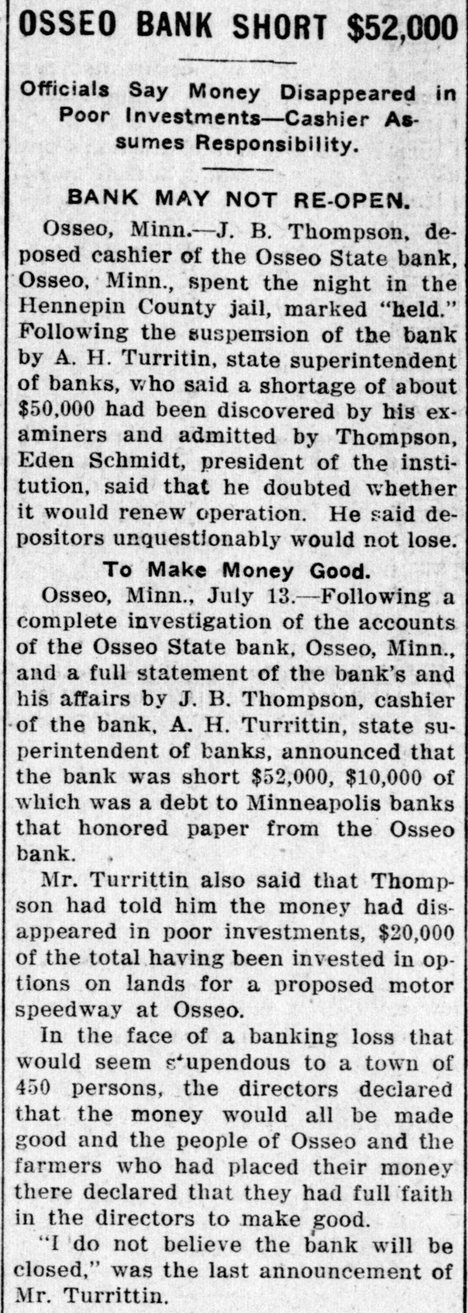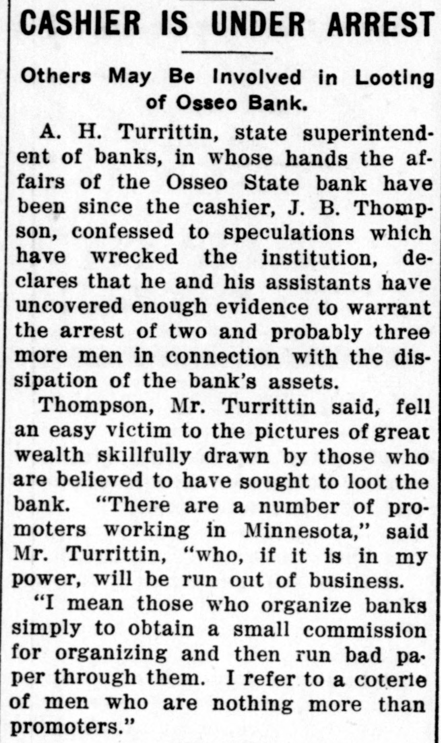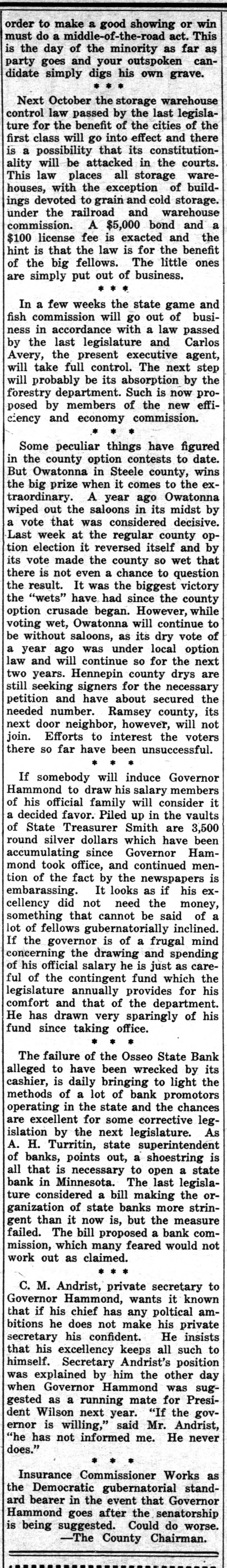 NEW LEADERS HAVE DISPLACED THE OLD STATE HISTORY MAKERS OF FEW YEARS AGO ARE NOW IN FORGOTTEN LIST. SELDOM VISIT OLD HAUNTS DAYS WHEN JACOBSON, DUNN, AND OTHERS HAD INFLUENCE RECALLED St. Paul, Aug. 17.-Five years is not a long period as time is reckoned these days, still it seems like an age when one harkens back to the days of such history makers as J. F. Jacobson, R. C. Dunn, E. E. Smith, Frank Day, Joe Cotton of Duluth, E. B. Hawkins and a score of others. Though all are in the land of the living only occasional mention is made of them now. "Where are all the boys? asked an old timer who was a recent visitor at the state capitol, and honestly I was unable to furnish the desired information. Other residents of the big marble pile on Capitol Hill were equally ignorant. Time was when no campaign or gossip was complete without some of them, and what they advocated or backed counted. Their advice was always sought and no one was ashamed to follow their standards. The other day J. F. Jacobson of Lac qui Parle county, as rough and flawless a diamond as was ever mined, dropped into the Cities. He was not even noticed. Bob Dunn, the hero of a score of rough and tumble fights, who gave to Minnesota the best of its timber and mineral protective acts, hardly lets a week go by without visiting St. Paul or Minneapolis, still he might be a complete stranger for all his presence attracts. And so it is with Joe Cotton, once the political king of the Iron Range; E. B. Hawkins, who always had a goodly bunch of live ones at his back, and a dozen others whose beck and call brought scores of hustlers to their aid. E. E. Smith, who piloted former Governor Eberhart through three hard fought campaigns and who was always a dominant figure in state politics, continues to hold out in Minneapolis, but if he is still in the game any activities on his part fail to show it. The lobby of the Merchants hotel, still the ghostly haunt of a few of them, is silent and SO are the other places once given over to their activities. The wiping out of the convention was their undoing, and as time passes only their names will be a memory. New kings have taken their places, but unlike the old days they do not answer to the title. Cards were on the table then. A fifth ace is necessary now, and publicity is not to the liking of the dealer. Not a little criticism is being directed at the state banking department and its head, A. H. Turritin, because of the recent failure of the Osseo State Bank. A dishonest cashier was responsible. Some of this criticism, especially that concerning the lack of strong regulative banking laws, is in order, but that directed at the head of the department comes with poor grace when it is known that the bank will reopen, that depositors will receive 100 cents on the dollar, and that even the stockholders will be partially reimbursed. All this is due to the activities of Mr. Turritin, who has left no stone unturned in his efforts to force back every dollar dishonestly taken. Even a corwd of Chicago promotors who had milked the institution for over $12,000 were compelled to disgorge, and they did not do it reluctantly either. They made good in a hurry when shown by Mr. Turritin. Lax as some of Minnesota's banking laws may be and weak to the extent that there is little control as far as the itinerant bank promotor is concerned, yet it is a compliment to those in charge of the department of Minnesota's 1,000 state banks are considered the strongest of any state in the Union and that the Osseo failure is the first in three years. In this neck of the woods one is simply unable to get away from the senatorial boom for Governor Ham-