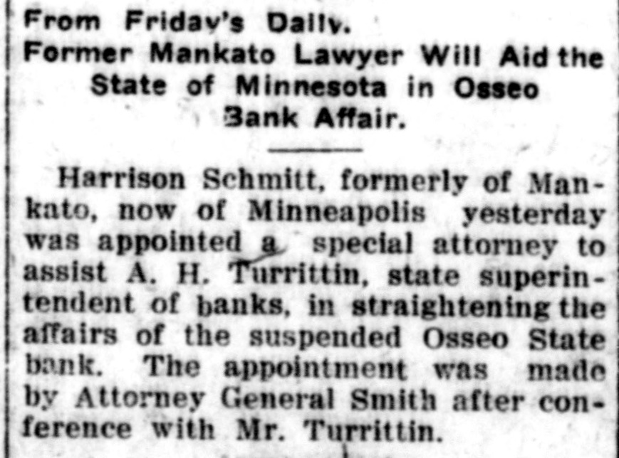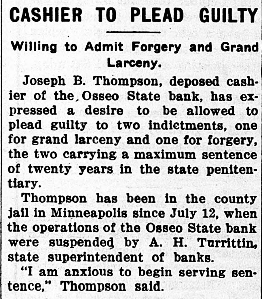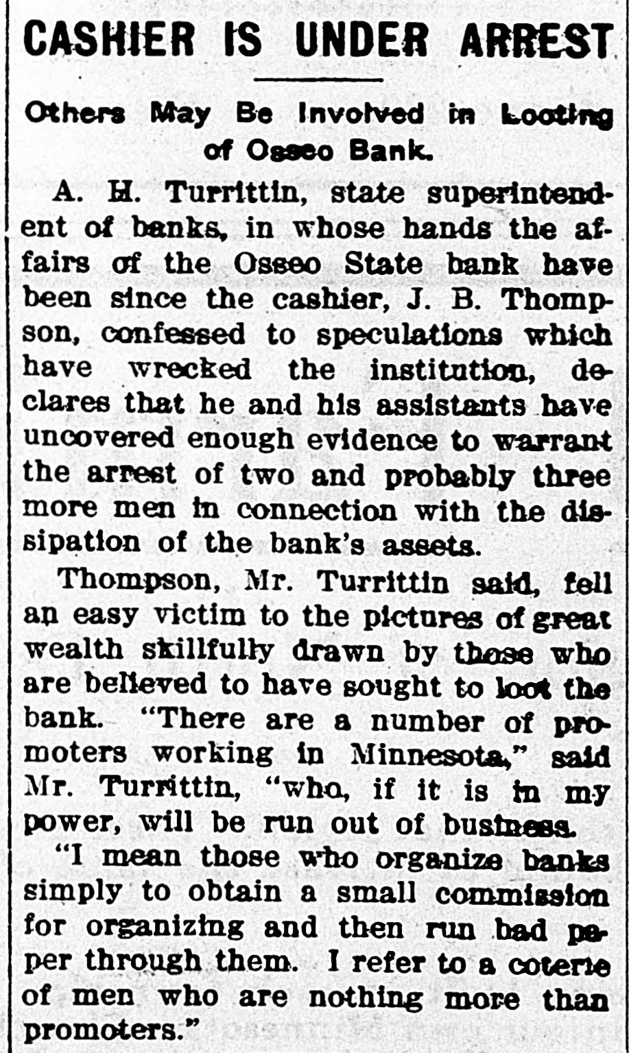 NEW LEADERS HAVE DISPLACED THE OLD STATE HISTORY MAKERS OF FEW YEARS AGO ARE NOW IN FORGOTTEN LIST. SELDOM VISIT OLD HAUNTS DAYS WHEN JACOBSON, DUNN, AND OTHERS HAD INFLUENCE RECALLED St. Paul, Aug. 17.-Five years is not a long period as time is reckoned these days, still it seems like an age when one harkens back to the days of such history makers as J. F. Jacobson, R. C. Dunn, E. E. Smith, Frank Day, Joe Cotton of Duluth, E. B. Hawkins and a score of others. Though all are in the land of the living only occasional mention is made of them now. "Where are all the boys? asked an old timer who was a recent visitor at the state capitol, and honestly I was unable to furnish the desired information. Other residents of the big marble pile on Capitol Hill were equally ignorant. Time was when no campaign or gossip was complete without some of them, and what they advocated or backed counted. Their advice was always sought and no one was ashamed to follow their standards. The other day J. F. Jacobson of Lac qui Parle county, as rough and flawless a diamond as was ever mined, dropped into the Cities. He was not even noticed. Bob Dunn, the hero of a score of rough and tumble fights, who gave to Minnesota the best of its timber and mineral protective acts, hardly lets a week go by without visiting St. Paul or Minneapolis, still he might be a complete stranger for all his presence attracts. And so it is with Joe Cotton, once the political king of the Iron Range; E. B. Hawkins, who always had a goodly bunch of live ones at his back, and a dozen others whose beck and call brought scores of hustlers to their aid. E. E. Smith, who piloted former Governor Eberhart through three hard fought campaigns and who was always a dominant figure in state politics, continues to hold out in Minneapolis, but if he is still in the game any activities on his part fail to show it. The lobby of the Merchants hotel, still the ghostly haunt of a few of them, is silent and SO are the other places once given over to their activities. The wiping out of the convention was their undoing, and as time passes only their names will be a memory. New kings have taken their places, but unlike the old days they do not answer to the title. Cards were on the table then. A fifth ace is necessary now, and publicity is not to the liking of the dealer. Not a little criticism is being directed at the state banking department and its head, A. H. Turritin, because of the recent failure of the Osseo State Bank. A dishonest cashier was responsible. Some of this criticism, especially that concerning the lack of strong regulative banking laws, is in order, but that directed at the head of the department comes with poor grace when it is known that the bank will reopen, that depositors will receive 100 cents on the dollar, and that even the stockholders will be partially reimbursed. All this is due to the activities of Mr. Turritin, who has left no stone unturned in his efforts to force back every dollar dishonestly taken. Even a corwd of Chicago promotors who had milked the institution for over $12,000 were compelled to disgorge, and they did not do it reluctantly either. They made good in a hurry when shown by Mr. Turritin. Lax as some of Minnesota's banking laws may be and weak to the extent that there is little control as far as the itinerant bank promotor is concerned, yet it is a compliment to those in charge of the department of Minnesota's 1,000 state banks are considered the strongest of any state in the Union and that the Osseo failure is the first in three years. In this neck of the woods one is simply unable to get away from the senatorial boom for Governor Ham-