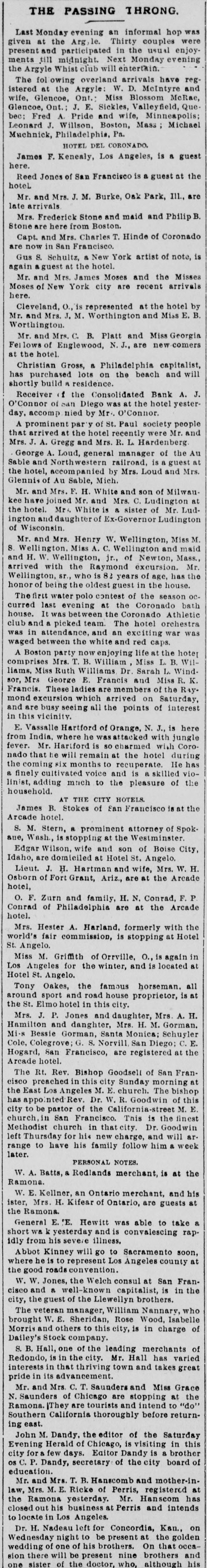 Last Monday evening an informal hop was given at the Arg,le. Thirty couples were present and participated in the usual enjoyments till midnight. Next Monday evening the Argyle Whist club will entertain. The fol owing overland arrivals have registered at the Argyle: W. D. McIntyre and wife, Glencoe, Ont.: Miss Blossom McRae, Glencoe, Ont.; J. E. Sickles, Valleyfield, Que. bec: Fred A. Pride and wife, Minneapolis; Leonard J. Willson, Boston, Mass Michael Muchnick, Philadelphia, Pa. HOTEL DEL CORONADO. James F. Kenealy, Los Angeles, is a guest here. Reed Jones of San Francisco is a guest at the hotel Mr. and Mrs. J. M. Burke, Oak Park, III., are late arrivals Mrs. Frederick Stone and maid and Philip B. Stone are here from Boston. Capt. and Mrs. Charles T. Hinde of Coronado are now in San Francisco. Gus S. Schultz, a New York artist of note, is again a guest at the hotel. Mr. and Mrs. James Moses and the Misses Moses of New York city are recent arrivals here. Cleveland, O., is represented at the hotel by Mr. and Mrs. J. M. Worthington and Miss E. B. Worthington. Mr. and Mrs. C. B. Platt and Miss Georgia Fellows of Englewood, N. J., are new comers at the hotel. Christian Gross, a Philadelphia capitalist, has purchased lots on the beach and will shortly build R residence. Receiver of the Consolidated Bank A. J. O'Connor of San Diego was at the hotel yesterday, accomp nied by Mr. O'Connor. A prominent par of St. Paul society people that arrived at the hotel recently were Mr. and Mrs. J. A. Gregg and Mrs. R. L. Hardenberg George A. Loud, general manager of the Au Sable and Northwestern railroad, is a guest at the hotel, accompanied by Mrs. Loud and Mrs. Glennis of Au Sable, Mich. Mr. and Mrs. F. H. White and son of Milwaukee have joined Mr. and Mrs. C. Ludington at the hotel. Mr. White is a sister of Mr. Ludington and daughter of Ex-Governor Ludington of Wisconsin. Mr. and Mrs. Henry W. Wellington, Miss M. S. Wellington. Miss A. C. Wellington and maid and H. W. Wellington, jr., of Newton, Mass., arrived with the Raymond excursion. Mr. Wellington, sr., who is 82 years of age, has the honor of being the oldest guest in the house. The firtt water polo contest of the season OC. curred last evening at the Coronado bath house. It was between the Coronado Athletic club and a picked team. The hotel orchestra was in attendance, and an exciting war was waged between the white and red caps. A Boston party now enjoying life at the hote[ comprises Mrs. T. B. William Miss L. B. Williams. Miss Ruth Williams Dr. Sarah L. Windsor, Mrs George E. Francis and Miss R. K. Francis. These ladies are members of the Ray. mond excursion which arrived on Saturday, and are busy seeing all the points of interest in this vicinity. E. Vassalle Hartford of Orange, N. J., is here from India, where he sattacked with jungle fever. Mr. Hartford is so charmed with Coronado that he will remain at the hotel during the coming six months to recuperate. He has a finely cultivated voice and is a skilled violinist, adding much to the pleasure of the household. AT THE CITY HOTELS. James B. Stokes of San Francisco is at the Arcade hotel. S. M. Stern, a prominent attorney of Spokaue, Wash, is stopping at the Westminster. Edgar Wilson, wife and son of Boise City, Idaho, are domiciled at Hotel St. Angelo. Lieut. J. H. Hartman and wife, Mrs. W. H. Osborn of Fort Grant, Ariz., are at the Arcade hotel, O. F. Zurn and family, H. N. Conrad, F. P Conrad of Philadelphia are at the Arcade hotel. Mrs. Hester A. Harland, formerly with the world's fair commission, is stopping at Hotel St. Angelo. Miss M. Griffith of Orrville, O., is again in Los Angeles for the winter, and is located at Hotel St. Angelo. Tony Oakes, the famous horseman. all around sport and road house proprietor, is at the St. Elmo hotel in this city. Mrs. J. P. Jones and daughter, Mrs. A. H. Hamilton and danghter, Mrs. H. M. Gorman. Mi-s Bessie Gorman, Santa Monica: Schuyler Cole, Colegrove; G. S. Norvill San Diego; C. E. Hogard, San Francisco, are registered at the Arcade hotel. The Rt. Rev. Bishop Goodsell of San Francisco preached in this city Sunday morning at the East Los Angeles M. E. church. The bishop has appointed Rev. Dr. W. R. Goodwin of this city to be pastor of the California-street M. E. church, in San Francisco. This is the finest Methodist church in that city. Dr. Goodwin left Thursday for his new charge, and will ar. range to have his family follow him a week later. PERSONAL NOTES. W. A. Batts, a Redlands merchant, is at the Ramona. W. E. Kellner, an Ontario merchant, and his ister, Mrs. H. Kifear of Ontario, are guests at the Ramona. General E. "E. Hewitt was able to take a short wa k yesterday and is convalescing rapidly from his severe illness, Abbot Kinney will go to Sacramento soon, where he is to represent Los Angeles county at the good roads convention. W. W. Jones, the Welch consul at San Francisco and a well-known capitalist, is in the city, the guest of the Llewellyn brothers. The veteran manager, William Nannary, who brought W. E. Sheridan, Rose Wood, Isabelle Morris and others to this city, is in charge of Dailey's Stock company. S. B. Hall, one of the leading merchants of Redondo, is in the city. Mr. Hall has varied interests in that thriving town and takes great pride in its advancement. Mr. and Mrs. C. T. Saunders and Miss Grace N. Saunders of Chicago are stopping at the Ramona. |They are tourists and intend to "do" Southern California thoroughly before returning east. John M. Dandy. the editor of the Saturday Evening Herald of Chicago, is visiting in this city fora few days. Editor Dandy is a brother os C. P. Dandy, secretary of the city board of