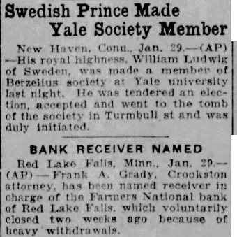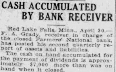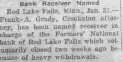 Bank Receiver Named. Red Lake Falls, Minn. Jan. Frank A. Grady Crookston attorney. has been named receiver in charge of the Farmers' National bank of Red Lake Falls which voluntarily closed two weeks ago because of heavy