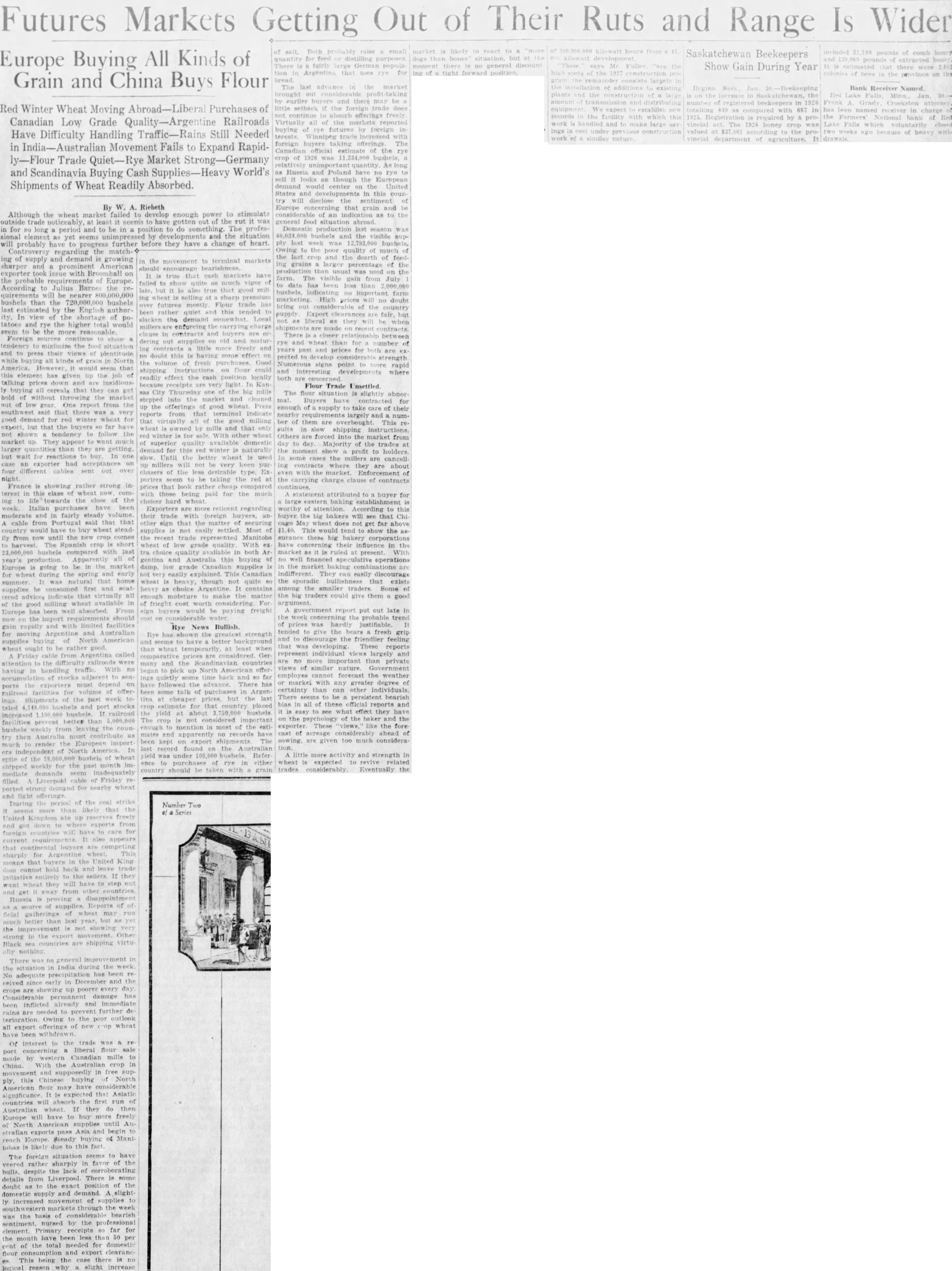 By W. A. Riebeth Although the wheat market failed to develop enough power to stimulate outside trade noticeably, at least it seems to have gotten out of the rut it was in for 80 long a period and to be in a position to do something. The professional element as yet seems by and the situation will probably have to progress further before they have a change of heart. Controversy regarding the matchgain rapidly and with limited facilities Rye News Bullish. for moving Argentine and Australian Rye has the strength supplies buying of North American and seems to have better background wheat to be rather good. than wheat temporarily at least when Friday cable from Argentina called comparative prices are Ger attention to the difficulty railroads were many and the Scandinavian countries having in handling traffic With no began to pick up North American offer of adjacent to sea- ings quietly some time back and so far ports the exporters must depend on have followed the advance. There has railroad facilities for volume of offer been some talk of purchases in ArgenIngs. Shipments of the past week to- tina at cheaper prices, but the last taled 000 bushels and port stocks crop estimate for that country placed increased 100 000 bushels If railroad the yield at about 3,750,000 bushels facilities prevent better than 5,000,000 The crop is not considered important enough to mention in most of the estibushels weekly from leaving the counmates and apparently no records have try then Australia must contribute as been kept on export The much to render the European import last record found on the Australian ers independent of North America. In yield was under 100, 000 bushels Refer spite of the bushels of wheat ence to purchases of rye in either shipped weekly for the past month Imcountry should be with grain mediate demands seem filled Liverpobl cable of Friday reported for nearby wheat and light offerings. During the of the coal strike Number Two It seems than likely that the Series United Kingdom ate UD reserves freely and got down to exports from foreign will have to care for current requirements It also appears that buyers are competing sharply for Argentine wheat This means that buyers in the United King dom cannot hold back and leave trade initiative to the sellers If they want wheat they will have to step out and get it away from countries Russia is proving disappointment RR source of supplies. Reports of of ficial gatherings of wheat may run much better than last year, but as yet the improvement is not showing very strong in the export movement Other Black sea countries are shipping virtually nothing There no general improvement in the situation in India during the week. No adequate precipitation has been re celved since early in December and the crops are showing up poorer every day Considerable permanent damage has been inflicted already and immediate rains are needed to prevent further de terioration Owing to the poor outlook all export offerings of new crop wheat have been withdrawn. or interest to the trade was a report concerning liberal flour sale made by western Canadian mills to China With the Australian crop in movement and supposedly in free supply, this Chinese buying North American flour may have considerable significance It is expected that Asiatic countries will absorb the first run of Australian wheat If they do then Europe will have to buy more freely of North until Australlan exports pass Asia and begin to reach Europe Steady buying of Manitobas is likely due to this fact The foreign situation to have veered rather sharply in favor of the bulls, despite the lack of details from Liverpool There is some doubt as to the exact position of the domestic supply and demand. A slight ly increased of supplies to southwestern through the week was the basis of bearish sentiment. nursed by the professional element Primary so far for the month have been less than 50 per cent of the total needed for domestic flour consumption and export clearanc es. This being the case there is no logical reason why a slight increase of salt, Both probably raise small quantity for feed or distilling purposes. There is fairly large German popula tion in Argentina that uses rye for bread. The last advance in the market brought out profit taking by earlier buyers and there may be little setback if the foreign trade does not continue to absorb offerings freely Virtually all of the markets reported buying of rye futures by foreign in terests. increased with foreign buyers taking offerings The Canadian official estimate of the rye crop of 1926 was 1,334,000 bushels, relatively unimportant quantity. As long as Russia and Poland have no rye to sell looks as though the European demand would center on the United States and developments in this coun try will disclose the sentiment of Europe that grain and be considerable of an indication as to the general food situation abroad production last season was bushels and the visible supply last week was 12,793,000 bushels, Owing to the poor quality of much of the last and the dearth of feeding grains larger percentage of the production than usual was used on the farm. The visible gain from July to date has been less than 000 bushels. indicating no important farm marketing. High prices will no doubt bring out considerable of the country supply Export clearances are fair, but not as liberal as they will be when are made on contracts. There is closer between rye and wheat than for number of years past and prices for both are ex pected to strength Numerous signs point to more rapid and interesting developments where both are