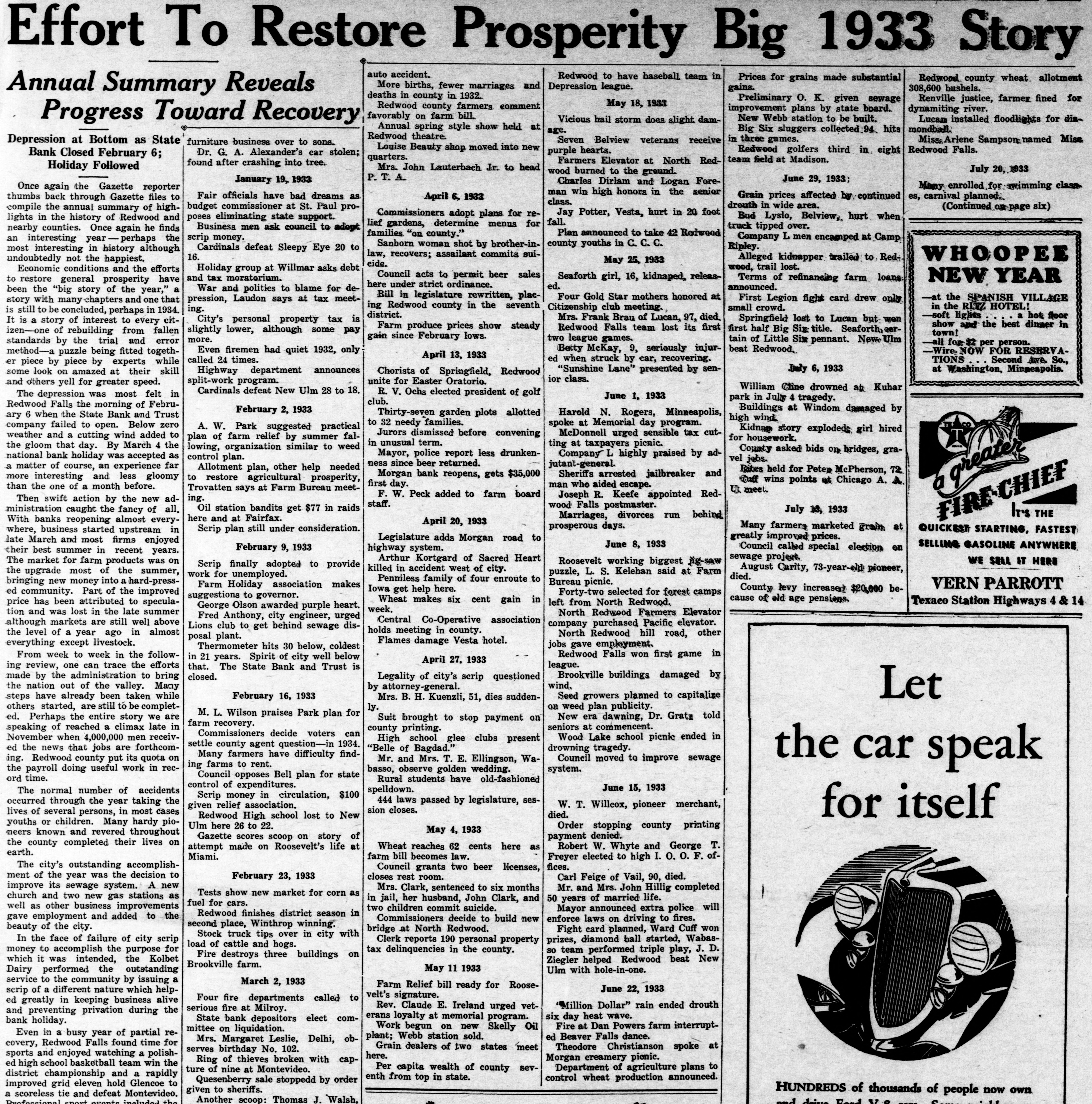 # Effort To Restore Prosperity Big 1933 Story # Annual Summary Reveals Progress Toward Recovery Depression at Bottom as State furniture business over to sons. Bank Closed February 6; Dr. G. A. Alexander's car stolen; Holiday Followed found after crashing into tree. January 19, 1933 Once again the Gazette reporter thumbs back through Gazette files to Fair officials have bad dreams as compile the annual summary of high- budget commissioner at St. Paul pro- lights in the history of Redwood and poses eliminating state support. nearby counties. Once again he finds Business men ask council to adopt an interesting year - perhaps the scrip money. most interesting in history although Cardinals defeat Sleepy Eye 20 to undoubtedly not the happiest. 16. Economic conditions and the efforts Holiday group at Willmar asks debt to restore general prosperity have and tax moratorium. been the "big story of the year," a War and politics to blame for de- story with many chapters and one that pression, Laudon says at tax meet- is still to be concluded, perhaps in 1934. ing. It is a story of interest to every cit- City's personal property tax is izen-one of rebuilding from fallen slightly lower, although some pay standards by the trial and error more. method-a puzzle being fitted togeth- Even firemen had quiet 1932, only er piece by piece by experts while called 24 times. some look on amazed at their skill Highway department announces and others yell for greater speed. split-work program. Cardinals defeat New Ulm 28 to 18. February 2, 1933 The depression was most felt in Redwood Falls the morning of Febru- A. W. Park suggested practical ary 6 when the State Bank and Trust plan of farm relief by summer fal- company failed to open. Below zero lowing, organization similar to weed weather and a cutting wind added to control plan. the gloom that day. By March 4 the Allotment plan, other help needed national bank holiday was accepted as to restore agricultural prosperity, a matter of course, an experience far Trovatten says at Farm Bureau meet- more interesting and less gloomy ing. than the one of a month before. Oil station bandits get $77 in raids here and at Fairfax. Then swift action by the new ad- Scrip plan still under consideration. ministration caught the fancy of all. With banks reopening almost every- where, business started upstream in late March and most firms enjoyed their best summer in recent years. The market for farm products was on the upgrade most of the summer, bringing new money into a hard-press- ed community. Part of the improved price has been attributed to specula- tion and was lost in the late summer although markets are still well above the level of a year ago in almost everything except livestock. From week to week in the follow- ing review, one can trace the efforts made by the administration to bring the nation out of the valley. Many steps have already been taken while others started, are still to be complet- ed. Perhaps the entire story we are speaking of reached a climax late in November when 4,000,000 men receiv- ed the news that jobs are forthcom- ing. Redwood county put its quota on the payroll doing useful work in rec- ord time. The normal number of accidents occurred through the year taking the lives of several persons, in most cases youths or children. Many hardy pio- neers known and revered throughout the county completed their lives on earth. The city's outstanding accomplish- ment of the year was the decision to improve its sewage system. A new church and two new gas stations as well as other business improvements gave employment and added to the beauty of the city. In the face of failure of city scrip money to accomplish the purpose for which it was intended, the Kolbet Dairy performed the outstanding service to the community by issuing a scrip of a different nature which help- ed greatly in keeping business alive and preventing privation during the bank holiday. Even in a busy year of partial re- covery, Redwood Falls found time for sports and enjoyed watching a polish- ed high school basketball team win the district championship and a rapidly improved grid eleven hold Glencoe to a scoreless tie and defeat Montevideo. Professional sport events included the February 9, 1933 Scrip finally adopted to provide work for unemployed. Farm Holiday association makes suggestions to governor. George Olson awarded purple heart. Fred Anthony, city engineer, urged Lions club to get behind sewage dis- posal plant. Thermometer hits 30 below, coldest in 21 years. Spirit of city well below that. The State Bank and Trust is closed. February 16, 1933 M. L. Wilson praises Park plan for farm recovery. Commissioners decide voters can settle county agent question in 1934. Many farmers have difficulty find- ing farms to rent. Council opposes Bell plan for state control of expenditures. Scrip money in circulation, $100 given relief association. Redwood High school lost to New Ulm here 26 to 22. Gazette scores scoop on story of attempt made on Roosevelt's life at Miami. February 23, 1933 Tests show new market for corn as fuel for cars. Redwood finishes district season in second place, Winthrop winning. Stock truck tips over in city with load of cattle and hogs. Fire destroys three buildings on Brookville farm. March 2, 1933 Four fire departments called to serious fire at Milroy. State bank depositors elect com- mittee on liquidation. Mrs. Margaret Leslie, Delhi, ob- serves birthday No. 102. Ring of thieves broken with cap- ture of nine at Montevideo. Quesenberry sale stoppedd by order given to sheriffs. Another scoop: Thomas J. Walsh, auto accident. More births, fewer marriages and deaths in county in 1932. Redwood county farmers comment favorably on farm bill. Annual spring style show held at Redwood theatre. Louise Beauty shop moved into new quarters. Mrs. John Lauterbach Jr. to head P. T. A. April 6, 1933 Commissioners adopt plans for re- lief gardens, determine menus for families "on county." San