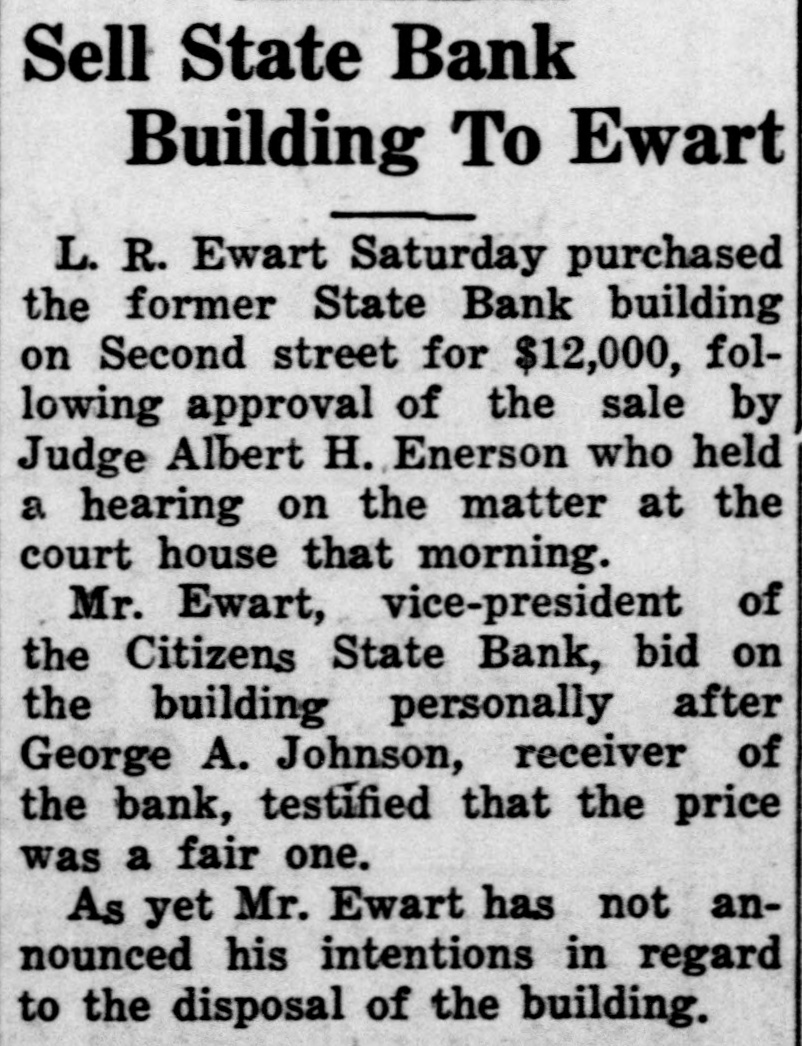 Sell State Bank Building To Ewart L. R. Ewart Saturday purchased the former State Bank building on Second street for $12,000, following approval of the sale by Judge Albert H. Enerson who held a hearing on the matter at the court house that morning. Mr. Ewart, vice-president of the Citizens State Bank, bid on the building personally after George A. Johnson, receiver of the bank, testified that the price was a fair one. As yet Mr. Ewart has not announced his intentions in regard to the disposal of the building.