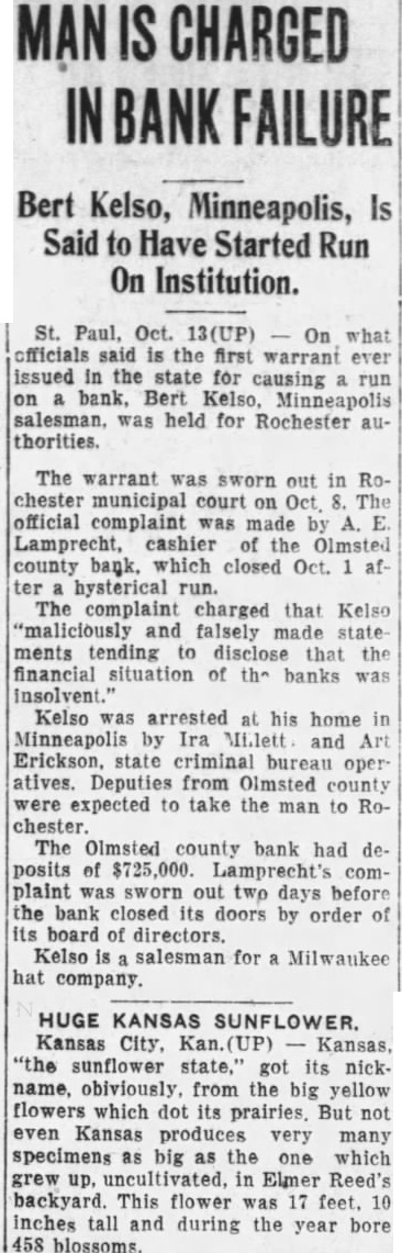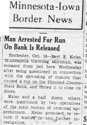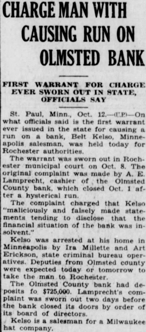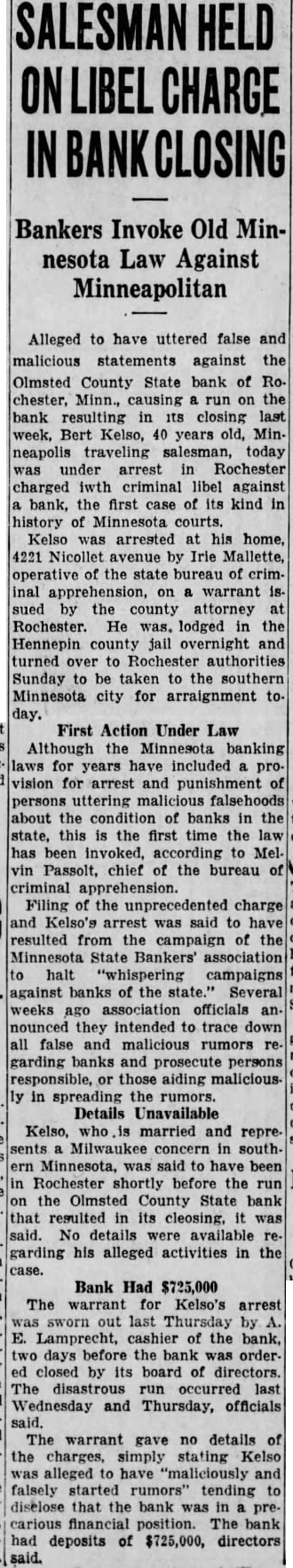 SALESMAN CHARGE Bankers Invoke Old Minnesota Law Against Minneapolitan Alleged to have uttered false and malicious statements against the Olmsted County State bank of Ro. chester, Minn., causing run on the bank resulting in closing last week, Bert Kelso, 40 years old, Minneapolis traveling salesman, today was under arrest Rochester charged iwth criminal libel against bank, the first case of its kind in history of Minnesota courts. Kelso was arrested his home, Nicollet avenue by Irie Mallette, operative of the state bureau of criminal apprehension, on warrant by the county attorney Rochester. He was. lodged the Hennepin county and turned over Rochester authorities Sunday be taken to the southern Minnesota city for arraignment day. First Action Under Law Although the Minnesota banking laws for years have included provision for arrest and punishment persons uttering falsehoods about the condition banks in state, this is the first time the has been invoked, Mel. vin Passolt, chief of the bureau criminal apprehension. Filing the unprecedented charge Kelso's arrest said to resulted from the campaign of Minnesota State Bankers' association halt "whispering campaigns against banks of the Several weeks ago association officials they intended to trace all false and malicious rumors garding banks and prosecute persons in spreading the rumors. Details Unavailable Kelso, married and reprein south. was said to been Rochester shortly before the run on the Olmsted County State bank that resulted its said. No available garding his alleged activities in the case. Bank Had $725,000 The warrant for Kelso's arrest sworn out last Thursday Lamprecht, of the bank, days before the bank orderclosed by its board of The last Wednesday and Thursday, officials The warrant gave details of the charges, simply stating Kelso alleged to "maliciously and falsely started rumors" tending diselose that the bank was carious position. bank had deposits of $725,000, directors