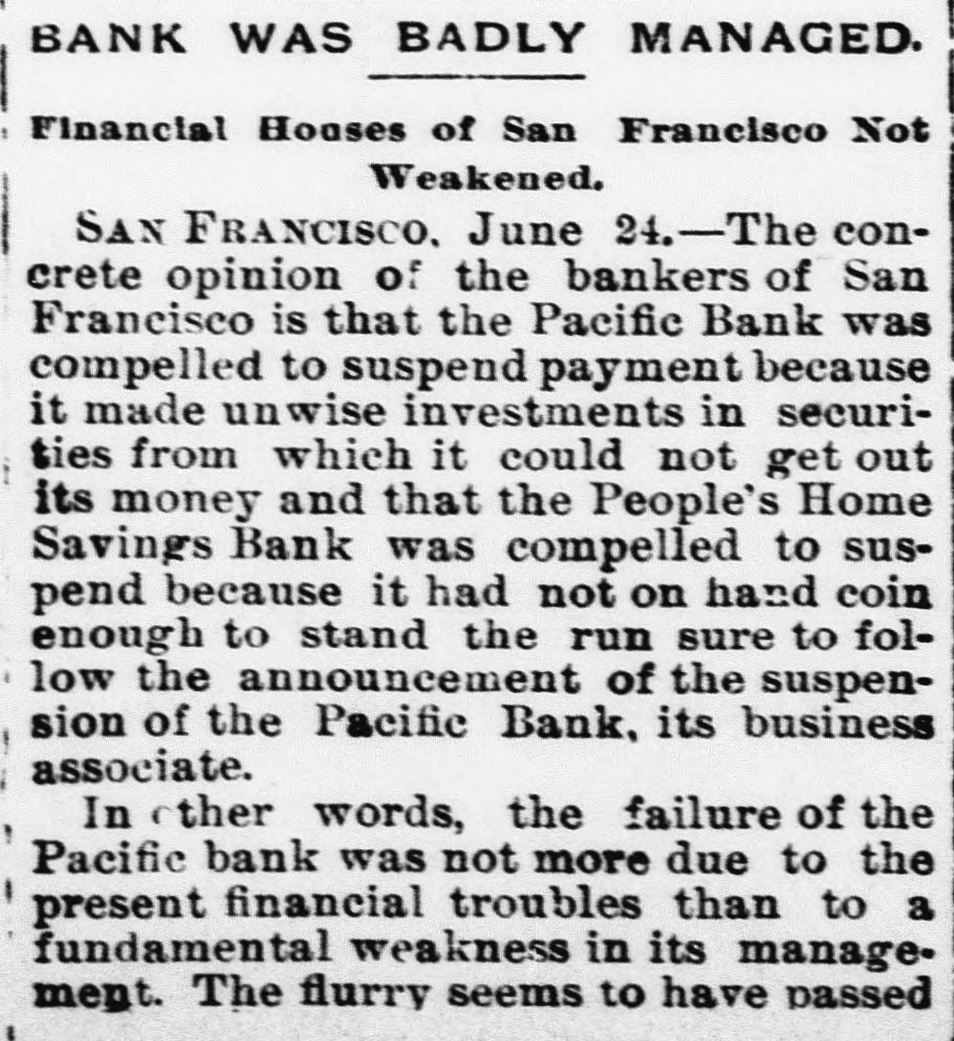BANK WAS BADLY MANAGED. Financial Houses of San Francisco Not Weakened. SAN FRANCISCO, June 24.-The concrete opinion of the bankers of San Francisco is that the Pacific Bank was compelled to suspend payment because it made unwise investments in securities from which it could not get out its money and that the People's Home Savings Bank was compelled to suspend because it had not on hand coin enough to stand the run sure to follow the announcement of the suspension of the Pacific Bank, its business associate. In ther words, the failure of the Pacific bank was not more due to the present financial troubles than to a fundamental weakness in its management. The flurry seems to have passed