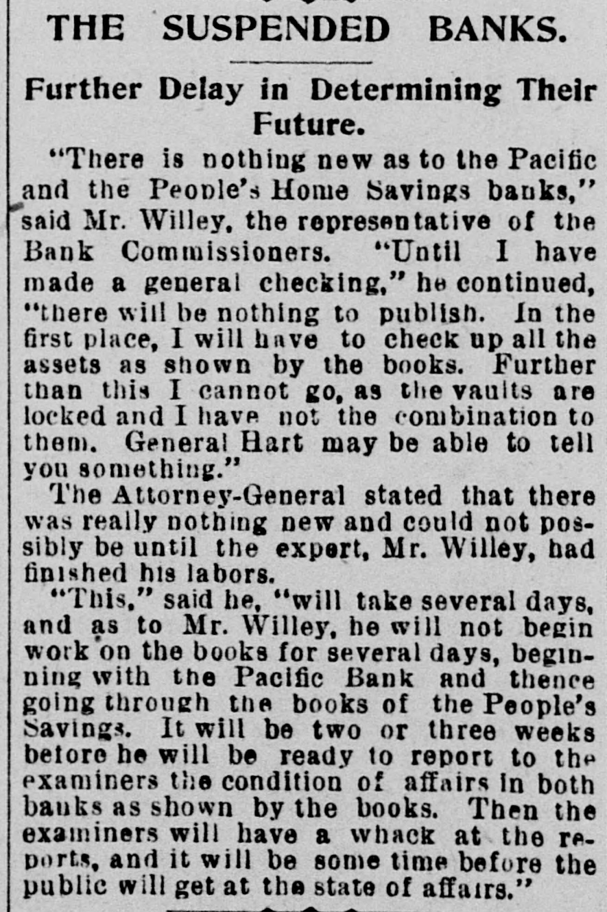 THE SUSPENDED BANKS. Further Delay in Determining Their Future. "There is nothing new as to the Pacific and the People's Home Savings banks," said Mr. Willey, the represent tative of the Bank Commissioners. "Until I have made a general checking," he continued, "there will be nothing to publish. In the first place, I will have to check up all the assets as shown by the books. Further than this I cannot go, as the vaults are locked and I have not the combination to them. General Hart may be able to tell you something." The Attorney-General stated that there was really nothing new and could not possibly be until the expert, Mr. Willey, had finished his labors. "This," said he, "will take several days, and as to Mr. Willey, he will not begin work on the books for several days, beginning with the Pacific Bank and thence going through the books of the People's Savings. It will be two or three weeks before he will be ready to report to the examiners the condition of affairs in both banks as shown by the books. Then the examiners will have a whack at the reports, and it will be some time before the public will get at the state of affairs."