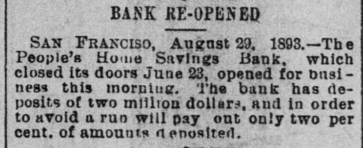 The People's Home Savings Bank closed (suspended) June 23, 1893 in connection with the Pacific Bank failure and limited cash on hand; it later reopened August 29, 1893 under restricted payout rules. The suspension appears driven by its tie to the Pacific Bank and inability to stand a run rather than by a discrete misinformation incident.