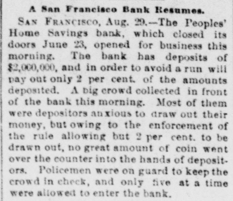 A San Francisco Bank Resumes. SAN FRANCISCO, Aug. 29.-The Peoples' Home Savings bank, which closed its doors June 23, opened for business this morning. The bank has deposits of $2,000,000, and in order to avoid a run will pay out only 2 per cent. of the amounts deposited. A big crowd collected in front of the bank this morning. Most of them were depositors anxious to draw out their money, but owing to the enforcement of the rule allowing but 2 per cent. to be drawn out, no great amount of coin went over the counter into the hands of depositors. Policemen were on guard to keep the crowd in check, and only five at a time were allowed to enter the bank.