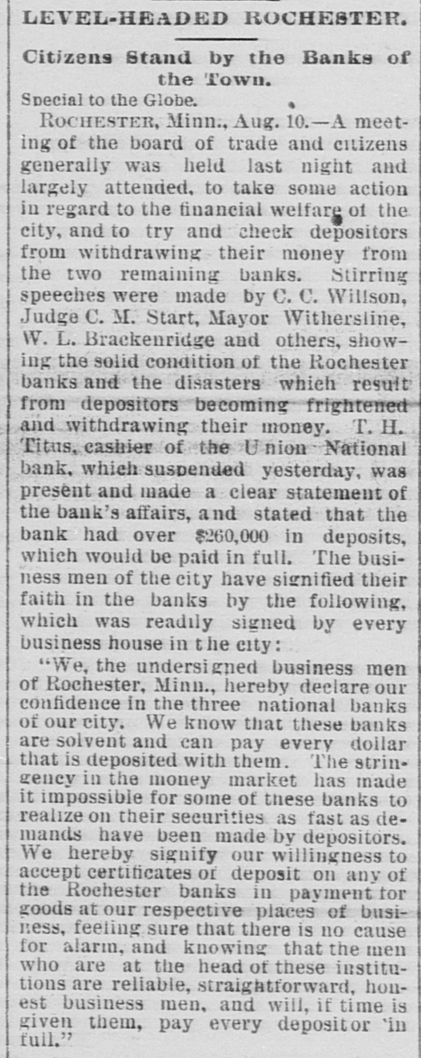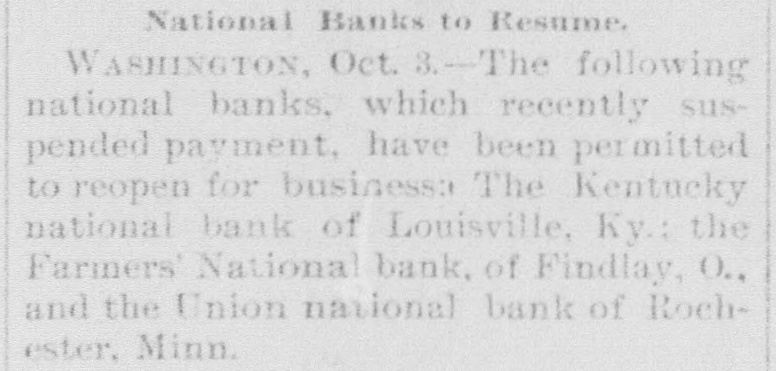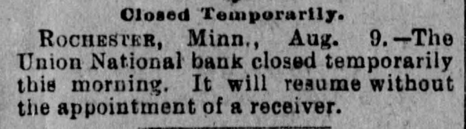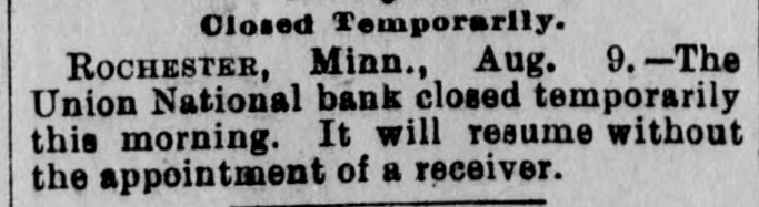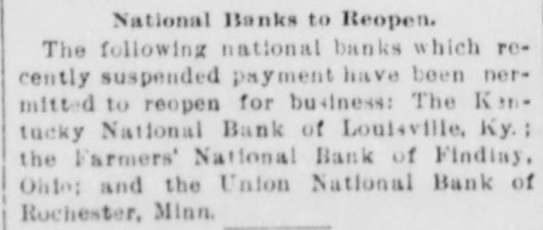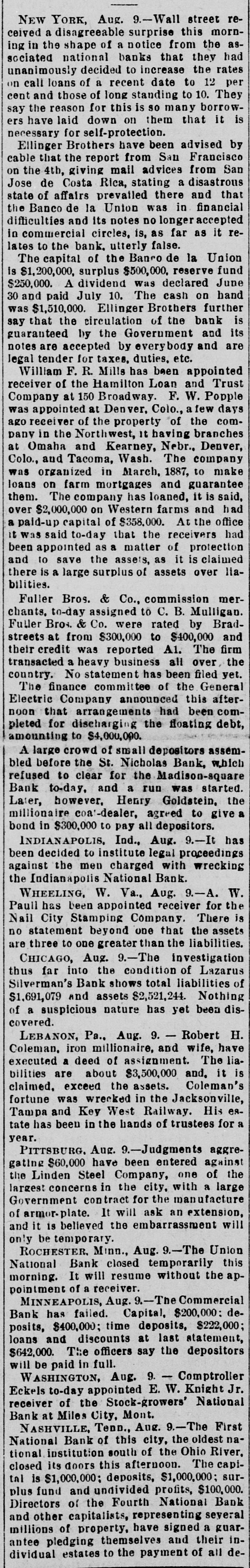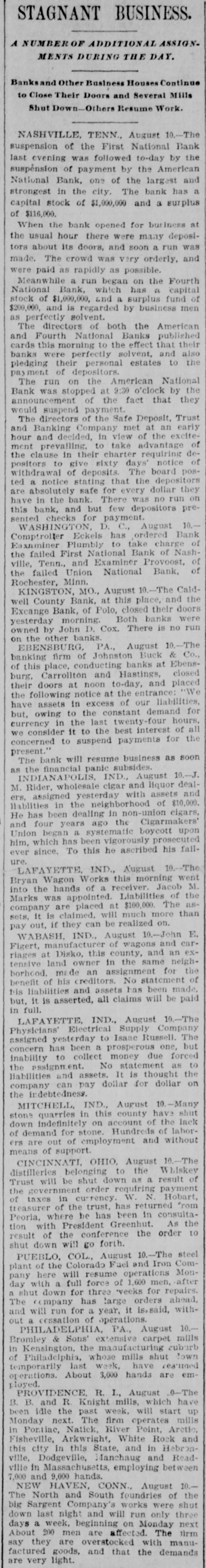 A NUMBER OF ADDITIONAL ASSIGN. MENTS DURING THE DAY. Banksand Other Business Houses Continue to Close Their Doors and Several Mills Shut Down- Others Resume Work. NASHVILLE, TENN., August -The suspension of the First National Bank last evening was followed to-day by the suspension of payment by the American National Bank, one of the largest and strongest in the city, The bank has a capital stock of $1,000,000 and a surplus of $116,000. When the bank opened for bus iness at the usual hour there were many depositors about its doors, and soon a run was made. The crowd was very orderly. and were paid as rapidly as possible. Meanwhile a run began on the Fourth National Bank, which has a capital stock of $1,000,000, and a surplus fund of $200,000. and is regarded by business men as perfectly solvent. The directors of both the American and Fourth National Banks published cards this morning to the effect that their banks were perfectly solvent, and also pledging their personal estates to the payment of depositors. The run on the American National Bank was stopped at 9:30 o'clock by the announcement of the fact that they would suspend payment. The directors of the Safe Deposit, Trust and Banking Company met at an early hour and decided, in view of the excitement prevailing, to take advantage of the clause in their charter requiring depositors to give sixty days' notice of withdrawal of deposits The board posted a notice stating that the depositors are absolutely safe for every dollar they have in the bank. There was no run on this bank, and but few depositors presented checks for payment. WASHINGTON, D. C., August 10.Comptroller Eckels has ordered Bank Eaxaminer Plumbly to take charge of the failed First National Bank of Nashville, Tenn., and Examiner Provoost, of of the failed Union National Bank, Rochester, Minn. KINGSTON, MO., August 10. The Caldwell County Bank, at this place, and the Excange Bank, of Polo, closed their doors yesterday morning. Both banks were owned by John D. Cox. There is no run on the other banks. EBENSBURG, PA., August 10. The banking firm of Johnston Buck & Co., of this place, conducting banks at Ebensburg. Carrollton and Hastings, closed their doors at noon to-day, and placed the following notice at the entrance: "We have assets in excess of our liabilities, but, owing to the constant demand for currency in the last twenty-four hours, we consider it to the best interest of the all concerned to suspend payments for present." The bank will resume business as soon as the financial panic subsides. INDIANAPOLIS IND., August 10.-J. M. Rider, wholesale cigar and liquor dealers. assigned yesterday with assets and llablities in the neighborhood of $10,000. He has been dealing in non-union cigars, and four years ago the Cigarmakers' Union began a systematic boycott upon him, which has been vigorously prosecuted ever since. To this he ascribed his failure. LAFAYETTE, IND., A'ugust 10.- The Bryan Wagon Works this morning went into the hands of a receiver. Jacob M. Marks was appointed. Liabilities of the company are placed at $100,000 The assets, it is claimed, will much more than pay out, if they can be realized on. WABASH, IND., August 10.-John E. Figert, manufacturer of wagons and carriages at Disko, this county, and an extensive land owner in the same neighborhood. made an assignment for the benefit of his creditors. No statement of his liabilities and assets has been made, but, it is asserted, all claims will be paid in full. LAFAYETTE, IND., August 10.-The Physicians' Electrical Supply Company assigned yesterday to Isaac Russell. The concern has been a prosperous one, but inability to collect money due forced the assignment. No statement as to liabilities and assets. It is thought the company can pay dollar for dollar on the indebtedness. MITCHELL IND., August 10.-Many quarries in this county have shut down stone indefinitely on account of the lack of demand for stone. Hundred of lahorers are out of employment and without means of support. CINCINNATI, OHIO, August 10 ).-The distilleries belonging to the Whiskey Trust will be shut down as a result of the government order requiring payment of taxes in currency. W. N. Hobart, of the trust, has returned from Peoria, treasurer where be has been in consultation with President Greenhut. As the result of the conference the order to shut down will go forth. PUEBLO, COL., August 10.-The steel plant of the Colorado Fael and Iron Com- Monpany here will resume operations with a full force of 1,600 men, after day a shut down for three weeks for repairs. The company has large orders ahead, and will run for a year, it is.said, without a cessation of operations. PHILADELPHIA, PA., August 10.Bromley & Sons' extensive carpet mills in Kensington, the manufacturing cuburb Philadelphia, whose mills shut Town last week, of temporarily hands have rearnoed operations. About 3,000 are employed. PROVIDENCE, R. I., August a-The B. B. and R Knight mills, which have been idle the past week, will start up Monday next. The firm operates mills in Portiac, Natick, River Point, Arctic, Fisheville, Arkwright, White Rock and this city in this State, and in Hebronville, Dodgeville, Manchaug and Readville in Massachusetts, employing between 7,000 and 9,000 hands. NEW HAVEN, CONN., August 10.The North and South foundries of the big Sargent Company's works were shut down last night and will run only three days a week, beginning on Monday next 200 men are are manuand that the say factured About they goods, overstocked affected. with The demands firm are very light.