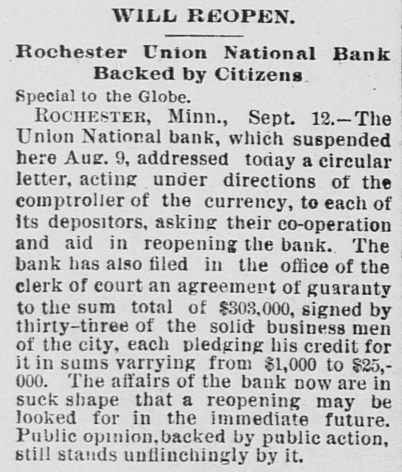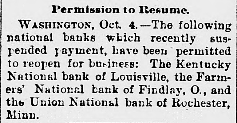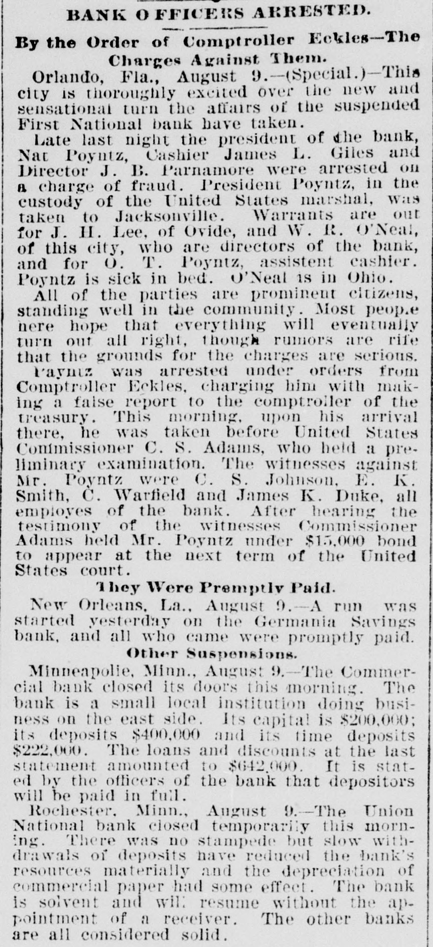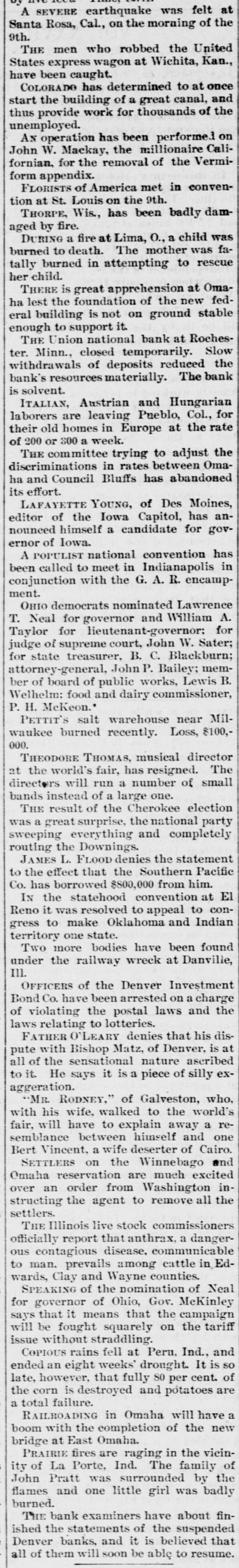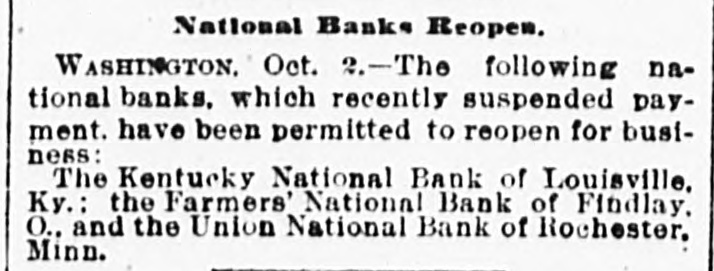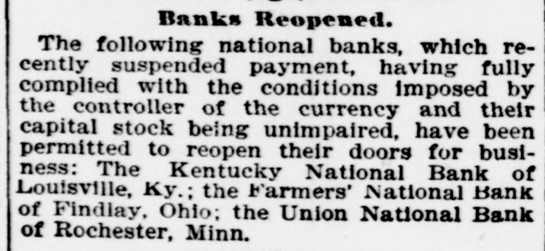 A NUMBER OF ADDITIONAL ASSIGN. MENTS DURING THE DAY. Banksand Other Business Houses Continue to Close Their Doors and Several Mills Shut Down- Others Resume Work. NASHVILLE, TENN., August -The suspension of the First National Bank last evening was followed to-day by the suspension of payment by the American National Bank, one of the largest and strongest in the city, The bank has a capital stock of $1,000,000 and a surplus of $116,000. When the bank opened for bus iness at the usual hour there were many depositors about its doors, and soon a run was made. The crowd was very orderly. and were paid as rapidly as possible. Meanwhile a run began on the Fourth National Bank, which has a capital stock of $1,000,000, and a surplus fund of $200,000. and is regarded by business men as perfectly solvent. The directors of both the American and Fourth National Banks published cards this morning to the effect that their banks were perfectly solvent, and also pledging their personal estates to the payment of depositors. The run on the American National Bank was stopped at 9:30 o'clock by the announcement of the fact that they would suspend payment. The directors of the Safe Deposit, Trust and Banking Company met at an early hour and decided, in view of the excitement prevailing, to take advantage of the clause in their charter requiring depositors to give sixty days' notice of withdrawal of deposits The board posted a notice stating that the depositors are absolutely safe for every dollar they have in the bank. There was no run on this bank, and but few depositors presented checks for payment. WASHINGTON, D. C., August 10.Comptroller Eckels has ordered Bank Eaxaminer Plumbly to take charge of the failed First National Bank of Nashville, Tenn., and Examiner Provoost, of of the failed Union National Bank, Rochester, Minn. KINGSTON, MO., August 10. The Caldwell County Bank, at this place, and the Excange Bank, of Polo, closed their doors yesterday morning. Both banks were owned by John D. Cox. There is no run on the other banks. EBENSBURG, PA., August 10. The banking firm of Johnston Buck & Co., of this place, conducting banks at Ebensburg. Carrollton and Hastings, closed their doors at noon to-day, and placed the following notice at the entrance: "We have assets in excess of our liabilities, but, owing to the constant demand for currency in the last twenty-four hours, we consider it to the best interest of the all concerned to suspend payments for present." The bank will resume business as soon as the financial panic subsides. INDIANAPOLIS IND., August 10.-J. M. Rider, wholesale cigar and liquor dealers. assigned yesterday with assets and llablities in the neighborhood of $10,000. He has been dealing in non-union cigars, and four years ago the Cigarmakers' Union began a systematic boycott upon him, which has been vigorously prosecuted ever since. To this he ascribed his failure. LAFAYETTE, IND., A'ugust 10.- The Bryan Wagon Works this morning went into the hands of a receiver. Jacob M. Marks was appointed. Liabilities of the company are placed at $100,000 The assets, it is claimed, will much more than pay out, if they can be realized on. WABASH, IND., August 10.-John E. Figert, manufacturer of wagons and carriages at Disko, this county, and an extensive land owner in the same neighborhood. made an assignment for the benefit of his creditors. No statement of his liabilities and assets has been made, but, it is asserted, all claims will be paid in full. LAFAYETTE, IND., August 10.-The Physicians' Electrical Supply Company assigned yesterday to Isaac Russell. The concern has been a prosperous one, but inability to collect money due forced the assignment. No statement as to liabilities and assets. It is thought the company can pay dollar for dollar on the indebtedness. MITCHELL IND., August 10.-Many quarries in this county have shut down stone indefinitely on account of the lack of demand for stone. Hundred of lahorers are out of employment and without means of support. CINCINNATI, OHIO, August 10 ).-The distilleries belonging to the Whiskey Trust will be shut down as a result of the government order requiring payment of taxes in currency. W. N. Hobart, of the trust, has returned from Peoria, treasurer where be has been in consultation with President Greenhut. As the result of the conference the order to shut down will go forth. PUEBLO, COL., August 10.-The steel plant of the Colorado Fael and Iron Com- Monpany here will resume operations with a full force of 1,600 men, after day a shut down for three weeks for repairs. The company has large orders ahead, and will run for a year, it is.said, without a cessation of operations. PHILADELPHIA, PA., August 10.Bromley & Sons' extensive carpet mills in Kensington, the manufacturing cuburb Philadelphia, whose mills shut Town last week, of temporarily hands have rearnoed operations. About 3,000 are employed. PROVIDENCE, R. I., August a-The B. B. and R Knight mills, which have been idle the past week, will start up Monday next. The firm operates mills in Portiac, Natick, River Point, Arctic, Fisheville, Arkwright, White Rock and this city in this State, and in Hebronville, Dodgeville, Manchaug and Readville in Massachusetts, employing between 7,000 and 9,000 hands. NEW HAVEN, CONN., August 10.The North and South foundries of the big Sargent Company's works were shut down last night and will run only three days a week, beginning on Monday next 200 men are are manuand that the say factured About they goods, overstocked affected. with The demands firm are very light.