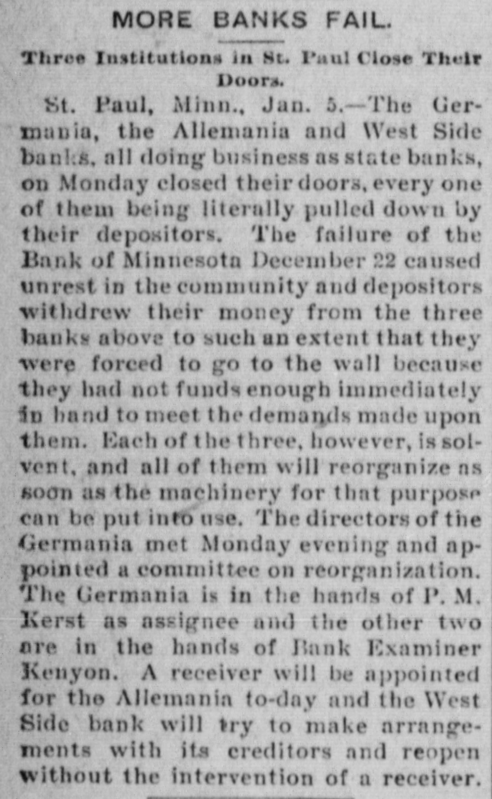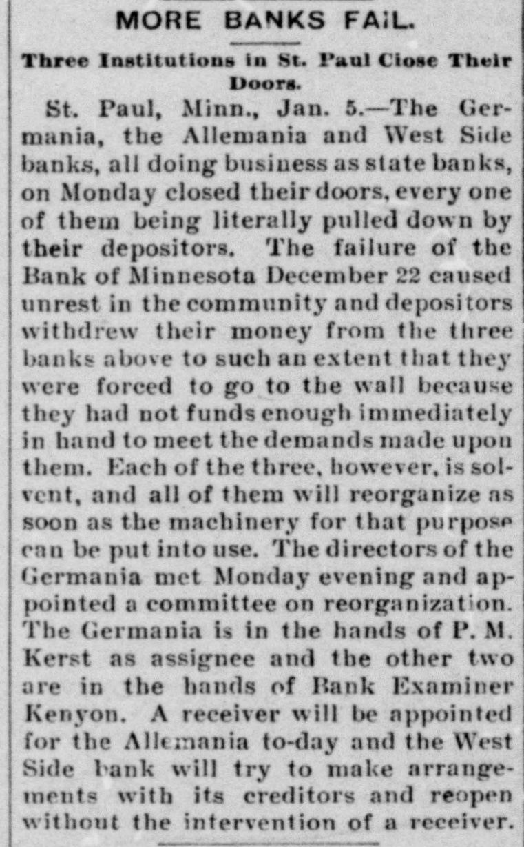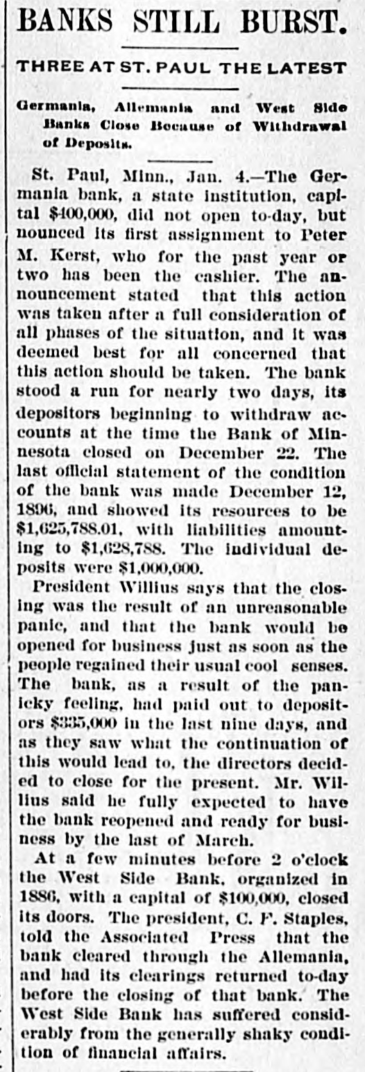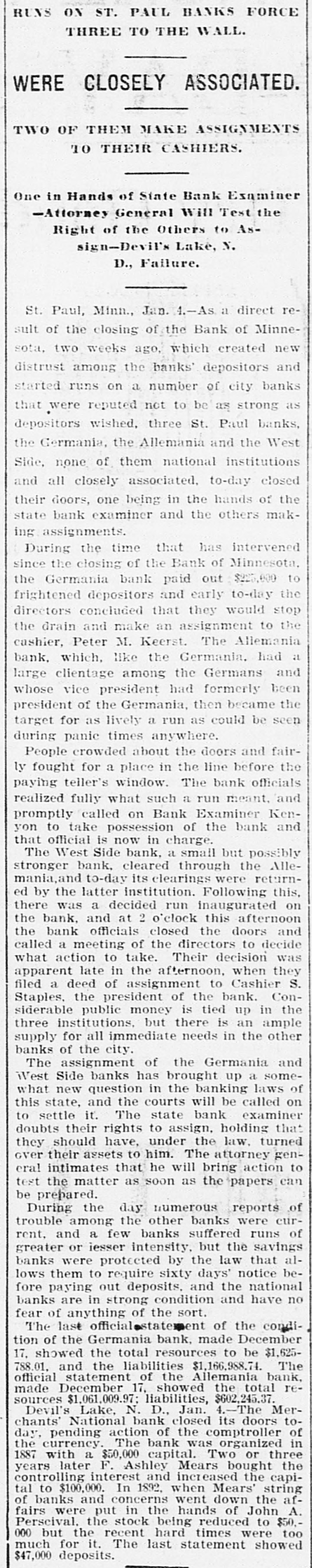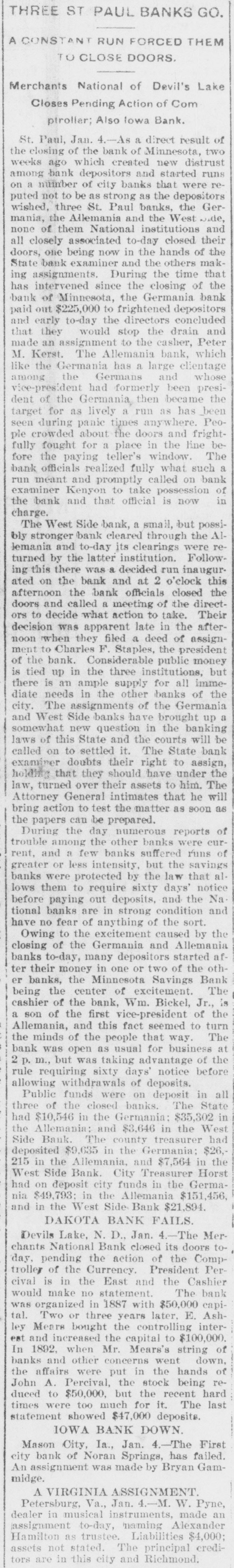 CONSTANT RUN FORCED THEM TO CLOSE DOORS. Merchants National of Devil's Lake Closes Pending Action of Com piroller; Also Iowa Bank. St. Paul, Jan. 4.-As a direct result of the closing of the bank of Minnesota, two which created new distrust bank depositors and runs number of city banks among on weeks a ago that started were reputed not to be as strong as the depositors Gerwished, three St. Paul banks, the mania, the Allemania and the West wide, and none of them National institutions all closely associated to-day closed their doors, one being now in the hands of the examiner and the makDuring the State ing assignments. bank closing others time of that the intervened since the the to frightened paid bank has out of $225,000 Minnesota, Germania depositors concluded bank to-day the directors would stop the assignment to the and made that early they an casher, drain Peter and M. The Allemania like Germania has a large Kerst. the bank, clientage whose which the Germans and had formerly presi- the the Germania then dent among vice-president of became been has been for as lively a run as panic times about the doors and ple target seen crowded during anywhere. fright- Peofully fought for a place in the line The before the paying teller's window. bank officials realized fully what such a meant and promptly called on bank of run examiner Kenyon to take possession in the bank and that official is now charge. The West Side bank, a small, but possibank cleared through the and to-day its were bly Jemania stronger clearings Followthe latter institution. there was a decided run bank and at 2 the bank officials called a meeting of ated turned ing this on and by the o'clock closed the inaugur- this the decide what action to ors afternoon doors to take. the direct- after- Their was apparent late in they filed a deed Charles F. Staples, the decision noon ment when to of president assignof Considerable public money is in the three tied the bank. up institutions, all imme- but there is an ample supply for the diate needs in the other banks of city. The assignments of the Germania a Side banks have brought up new question in State and the courts be somewhat and laws West of this the banking will bank to settled it. The State doubts their right to that they should have the examiner holding called on under him. assign, The turned over their assets to General intimates law, Attorney that he will as bring action to test the matter as soon the papers can be prepared. During the day numerous reports of trouble among the other banks were cura few banks suffered runs of or less intensity, but the were by the them to require sixty out deposits, banks rent, lows before greater and paying protected condition and days' law the that savings notice and Na al. tional banks are in strong have no fear of anything of the sort. Owing to the excitement caused by the closing of the Germania and Allemania banks to-day, many depositors started af ter their money in one or two of the other banks, the Minnesota Savings Bank the center of excitement. The of the bank, Wm. is a the first cashier being son of vice-president seemed Bickel, to of Jr., turn the Allemania, and this fact the of the people that way. bank was open as usual for but was taking the sixty days' 2 p.m., rule requiring advantage notice of withdrawals of allowing minds deposits. business before in The all at Public funds were on deposit three of the closed banks. The State had $10,546 in the Germania: $35,302 in the Allemania: and $3,646 in the West Side Bank. The county treasurer had deposited $9,635 in the Germania: $26, 215 in the Allemania, and $7,564 in the West Side Bank. City Treasurer Horst had on deposit city funds in the Germania $49,793: in the Allemania $151,456, and in the West Side Bank $21,894. DAKOTA BANK FAILS. Devils Lake, N. D., Jan. 4.-The Merchants National Bank closed its doors today. pending the action of the Comptroller of the Currency. President Percival is in the East and the Cashier bank would make no statement. The was organized in 1887 with $50,000 capital. Two or three years later. E. Ashley Mears bought the controlling interincreased the capital to $100,000. when Mr. Mears's other concerns went eat banks In and 1892, and string down, of of the were put in the hands John the stock reaffairs A. Percival, being hard duced to $50,000, but the recent times were too much for it. The last statement showed $47,000 deposits. IOWA BANK DOWN. Mason City, Ia., Jan. 4.-The First city bank of Noran Springs, has failed. An assignment was made by Bryan Gammidge. A VIRGINIA ASSIGNMENT. Petersburg, Va., Jan. 4.-M. W. Pyne, dealer in musical instruments, made an assignment to-day, naming Alexander Hamilton as trustee. Liabilities $4,000; assets not stated. The principal creditors are in this city and Richmond.
