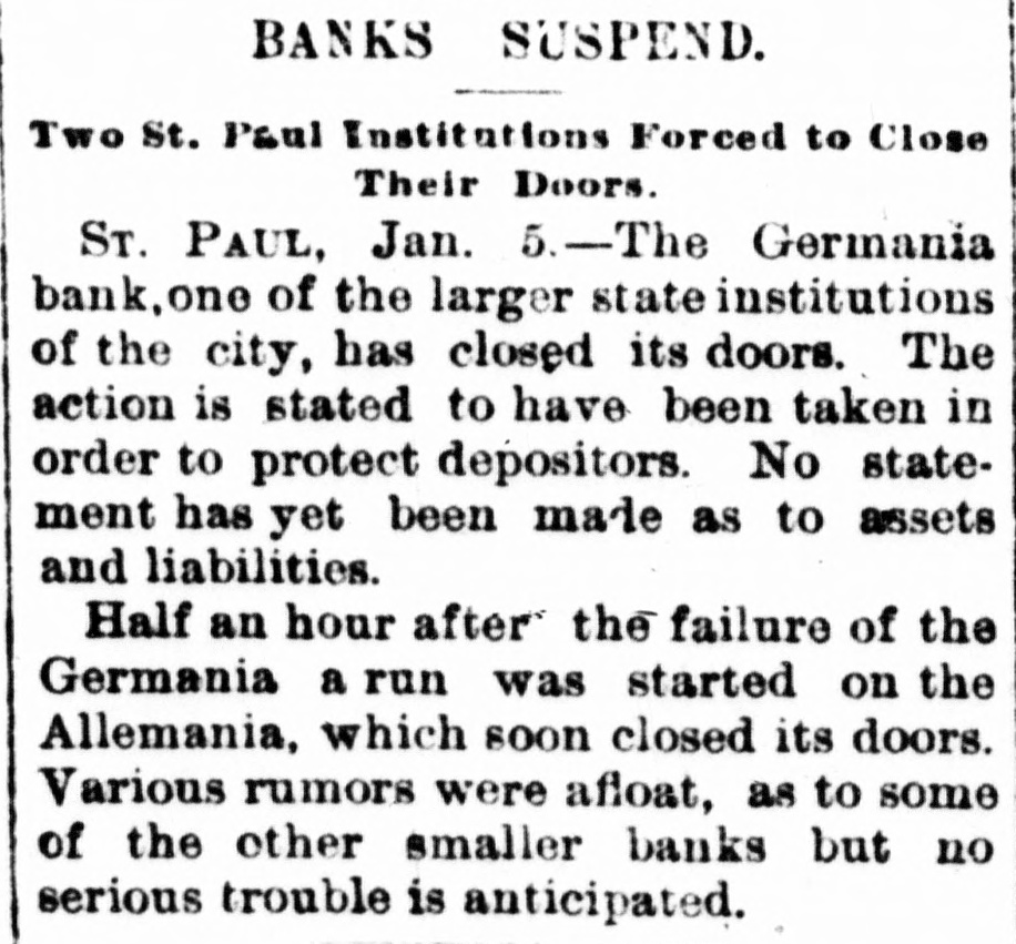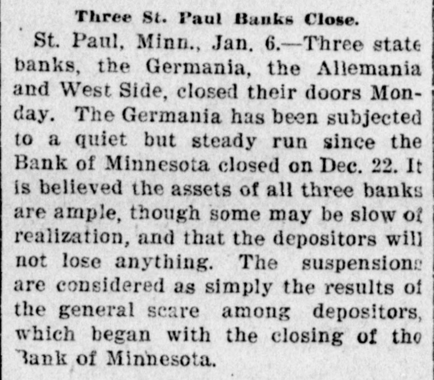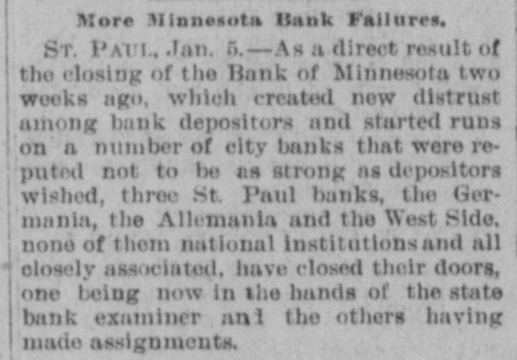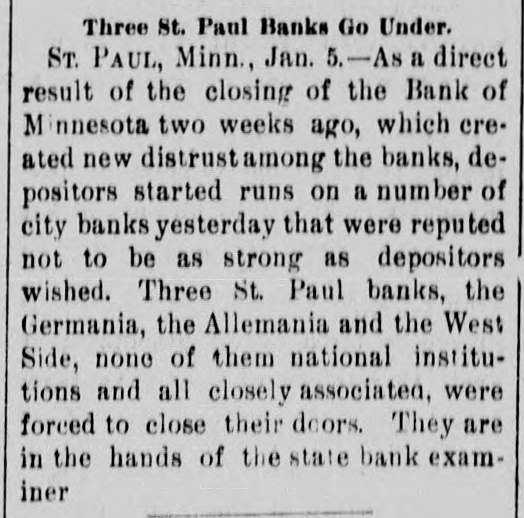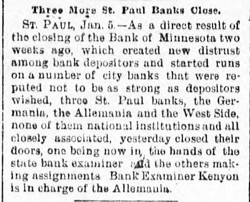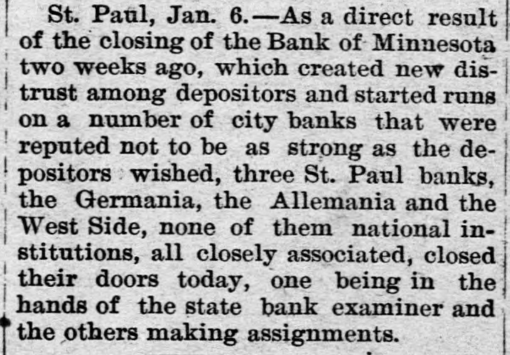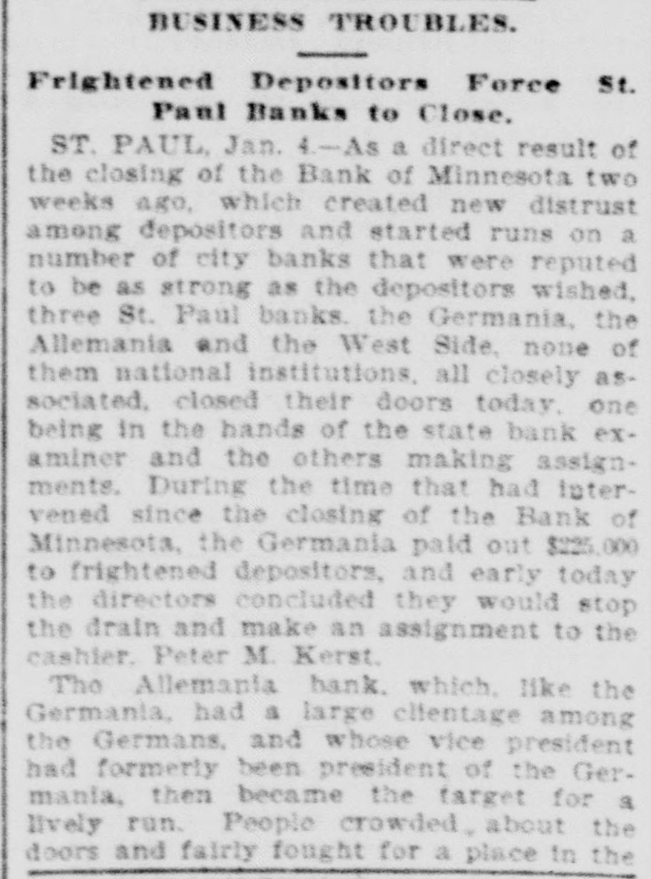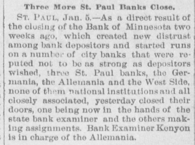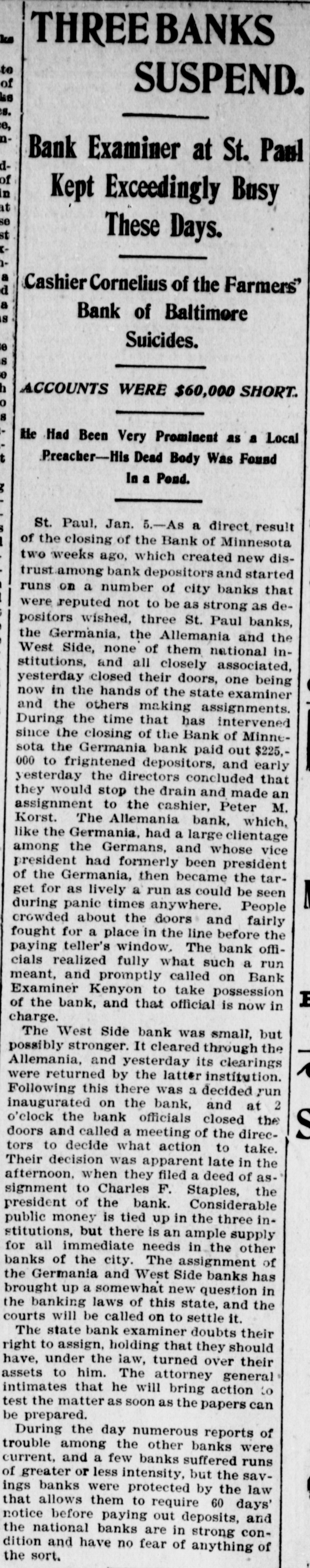 CONSTANT RUN FORCED THEM TO CLOSE DOORS. Merchants National of Devil's Lake Closes Pending Action of Com piroller; Also Iowa Bank. St. Paul, Jan. 4.-As a direct result of the closing of the bank of Minnesota, two which created new distrust bank depositors and runs number of city banks among on weeks a ago that started were reputed not to be as strong as the depositors Gerwished, three St. Paul banks, the mania, the Allemania and the West wide, and none of them National institutions all closely associated to-day closed their doors, one being now in the hands of the examiner and the makDuring the State ing assignments. bank closing others time of that the intervened since the the to frightened paid bank has out of $225,000 Minnesota, Germania depositors concluded bank to-day the directors would stop the assignment to the and made that early they an casher, drain Peter and M. The Allemania like Germania has a large Kerst. the bank, clientage whose which the Germans and had formerly presi- the the Germania then dent among vice-president of became been has been for as lively a run as panic times about the doors and ple target seen crowded during anywhere. fright- Peofully fought for a place in the line The before the paying teller's window. bank officials realized fully what such a meant and promptly called on bank of run examiner Kenyon to take possession in the bank and that official is now charge. The West Side bank, a small, but possibank cleared through the and to-day its were bly Jemania stronger clearings Followthe latter institution. there was a decided run bank and at 2 the bank officials called a meeting of ated turned ing this on and by the o'clock closed the inaugur- this the decide what action to ors afternoon doors to take. the direct- after- Their was apparent late in they filed a deed Charles F. Staples, the decision noon ment when to of president assignof Considerable public money is in the three tied the bank. up institutions, all imme- but there is an ample supply for the diate needs in the other banks of city. The assignments of the Germania a Side banks have brought up new question in State and the courts be somewhat and laws West of this the banking will bank to settled it. The State doubts their right to that they should have the examiner holding called on under him. assign, The turned over their assets to General intimates law, Attorney that he will as bring action to test the matter as soon the papers can be prepared. During the day numerous reports of trouble among the other banks were cura few banks suffered runs of or less intensity, but the were by the them to require sixty out deposits, banks rent, lows before greater and paying protected condition and days' law the that savings notice and Na al. tional banks are in strong have no fear of anything of the sort. Owing to the excitement caused by the closing of the Germania and Allemania banks to-day, many depositors started af ter their money in one or two of the other banks, the Minnesota Savings Bank the center of excitement. The of the bank, Wm. is a the first cashier being son of vice-president seemed Bickel, to of Jr., turn the Allemania, and this fact the of the people that way. bank was open as usual for but was taking the sixty days' 2 p.m., rule requiring advantage notice of withdrawals of allowing minds deposits. business before in The all at Public funds were on deposit three of the closed banks. The State had $10,546 in the Germania: $35,302 in the Allemania: and $3,646 in the West Side Bank. The county treasurer had deposited $9,635 in the Germania: $26, 215 in the Allemania, and $7,564 in the West Side Bank. City Treasurer Horst had on deposit city funds in the Germania $49,793: in the Allemania $151,456, and in the West Side Bank $21,894. DAKOTA BANK FAILS. Devils Lake, N. D., Jan. 4.-The Merchants National Bank closed its doors today. pending the action of the Comptroller of the Currency. President Percival is in the East and the Cashier bank would make no statement. The was organized in 1887 with $50,000 capital. Two or three years later. E. Ashley Mears bought the controlling interincreased the capital to $100,000. when Mr. Mears's other concerns went eat banks In and 1892, and string down, of of the were put in the hands John the stock reaffairs A. Percival, being hard duced to $50,000, but the recent times were too much for it. The last statement showed $47,000 deposits. IOWA BANK DOWN. Mason City, Ia., Jan. 4.-The First city bank of Noran Springs, has failed. An assignment was made by Bryan Gammidge. A VIRGINIA ASSIGNMENT. Petersburg, Va., Jan. 4.-M. W. Pyne, dealer in musical instruments, made an assignment to-day, naming Alexander Hamilton as trustee. Liabilities $4,000; assets not stated. The principal creditors are in this city and Richmond.