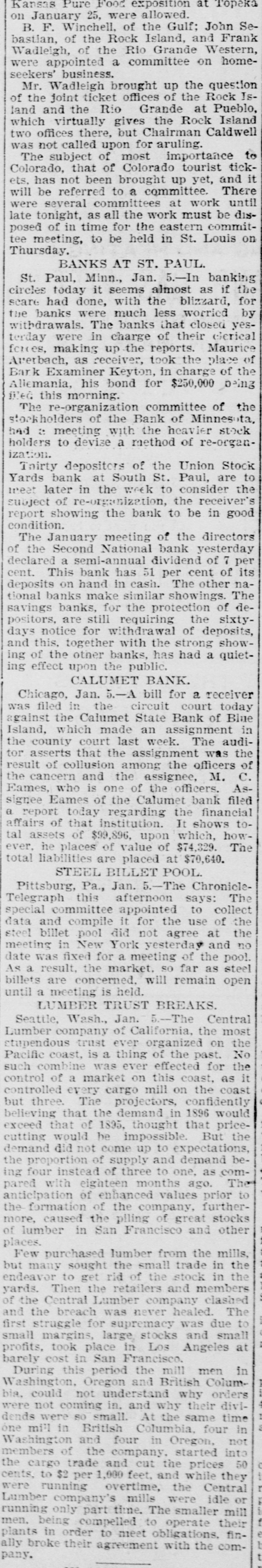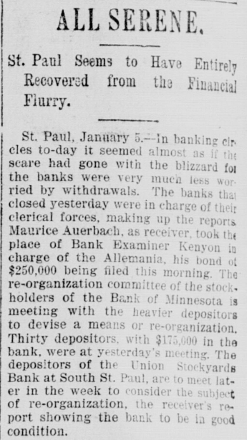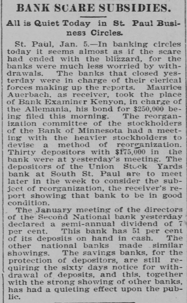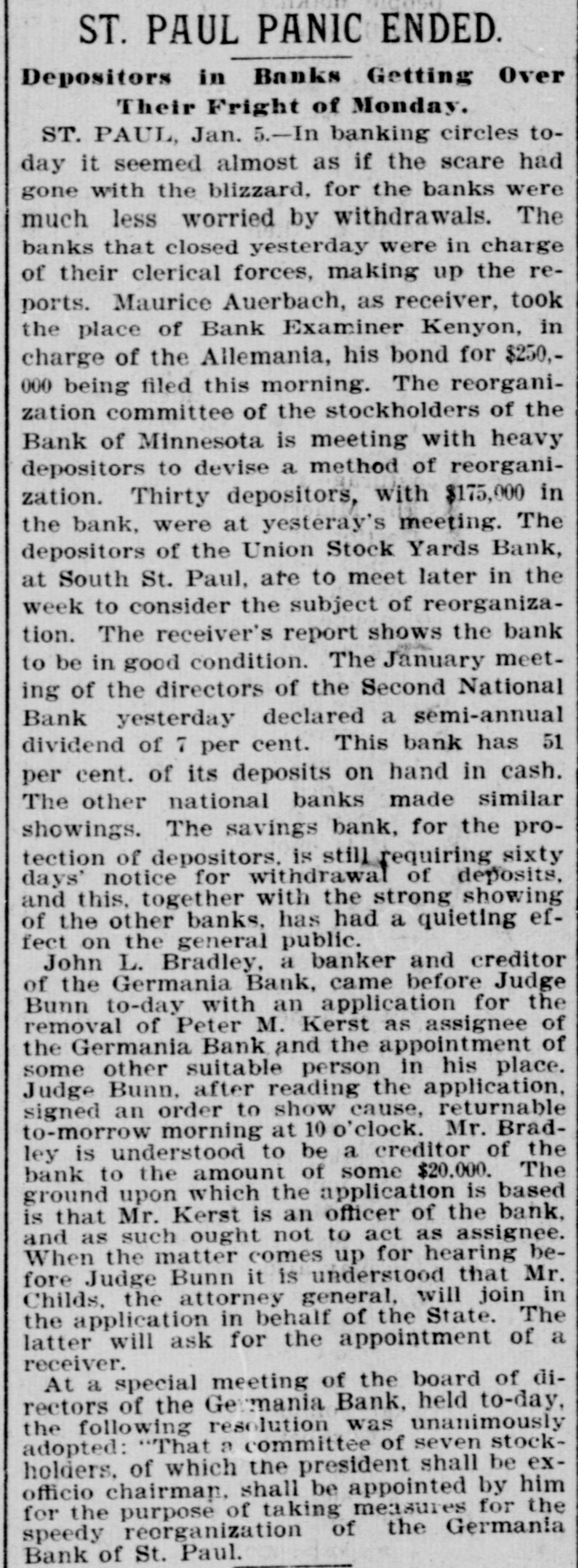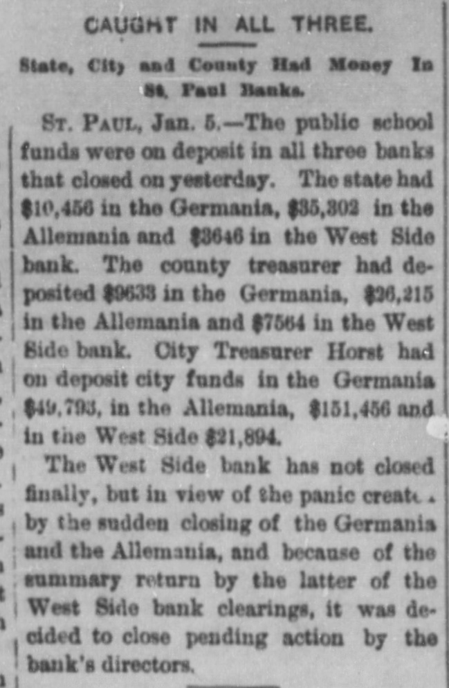 CONSTANT RUN FORCED THEM TO CLOSE DOORS. Merchants National of Devil's Lake Closes Pending Action of Com piroller; Also Iowa Bank. St. Paul, Jan. 4.-As a direct result of the closing of the bank of Minnesota, two which created new distrust bank depositors and runs number of city banks among on weeks a ago that started were reputed not to be as strong as the depositors Gerwished, three St. Paul banks, the mania, the Allemania and the West wide, and none of them National institutions all closely associated to-day closed their doors, one being now in the hands of the examiner and the makDuring the State ing assignments. bank closing others time of that the intervened since the the to frightened paid bank has out of $225,000 Minnesota, Germania depositors concluded bank to-day the directors would stop the assignment to the and made that early they an casher, drain Peter and M. The Allemania like Germania has a large Kerst. the bank, clientage whose which the Germans and had formerly presi- the the Germania then dent among vice-president of became been has been for as lively a run as panic times about the doors and ple target seen crowded during anywhere. fright- Peofully fought for a place in the line The before the paying teller's window. bank officials realized fully what such a meant and promptly called on bank of run examiner Kenyon to take possession in the bank and that official is now charge. The West Side bank, a small, but possibank cleared through the and to-day its were bly Jemania stronger clearings Followthe latter institution. there was a decided run bank and at 2 the bank officials called a meeting of ated turned ing this on and by the o'clock closed the inaugur- this the decide what action to ors afternoon doors to take. the direct- after- Their was apparent late in they filed a deed Charles F. Staples, the decision noon ment when to of president assignof Considerable public money is in the three tied the bank. up institutions, all imme- but there is an ample supply for the diate needs in the other banks of city. The assignments of the Germania a Side banks have brought up new question in State and the courts be somewhat and laws West of this the banking will bank to settled it. The State doubts their right to that they should have the examiner holding called on under him. assign, The turned over their assets to General intimates law, Attorney that he will as bring action to test the matter as soon the papers can be prepared. During the day numerous reports of trouble among the other banks were cura few banks suffered runs of or less intensity, but the were by the them to require sixty out deposits, banks rent, lows before greater and paying protected condition and days' law the that savings notice and Na al. tional banks are in strong have no fear of anything of the sort. Owing to the excitement caused by the closing of the Germania and Allemania banks to-day, many depositors started af ter their money in one or two of the other banks, the Minnesota Savings Bank the center of excitement. The of the bank, Wm. is a the first cashier being son of vice-president seemed Bickel, to of Jr., turn the Allemania, and this fact the of the people that way. bank was open as usual for but was taking the sixty days' 2 p.m., rule requiring advantage notice of withdrawals of allowing minds deposits. business before in The all at Public funds were on deposit three of the closed banks. The State had $10,546 in the Germania: $35,302 in the Allemania: and $3,646 in the West Side Bank. The county treasurer had deposited $9,635 in the Germania: $26, 215 in the Allemania, and $7,564 in the West Side Bank. City Treasurer Horst had on deposit city funds in the Germania $49,793: in the Allemania $151,456, and in the West Side Bank $21,894. DAKOTA BANK FAILS. Devils Lake, N. D., Jan. 4.-The Merchants National Bank closed its doors today. pending the action of the Comptroller of the Currency. President Percival is in the East and the Cashier bank would make no statement. The was organized in 1887 with $50,000 capital. Two or three years later. E. Ashley Mears bought the controlling interincreased the capital to $100,000. when Mr. Mears's other concerns went eat banks In and 1892, and string down, of of the were put in the hands John the stock reaffairs A. Percival, being hard duced to $50,000, but the recent times were too much for it. The last statement showed $47,000 deposits. IOWA BANK DOWN. Mason City, Ia., Jan. 4.-The First city bank of Noran Springs, has failed. An assignment was made by Bryan Gammidge. A VIRGINIA ASSIGNMENT. Petersburg, Va., Jan. 4.-M. W. Pyne, dealer in musical instruments, made an assignment to-day, naming Alexander Hamilton as trustee. Liabilities $4,000; assets not stated. The principal creditors are in this city and Richmond.