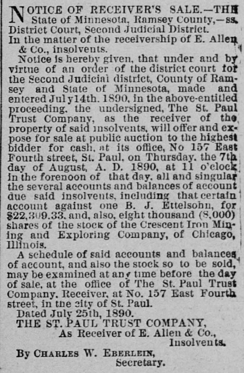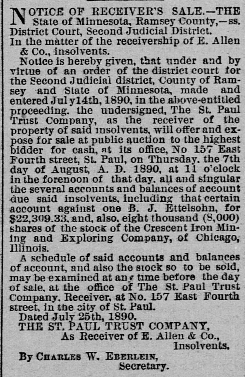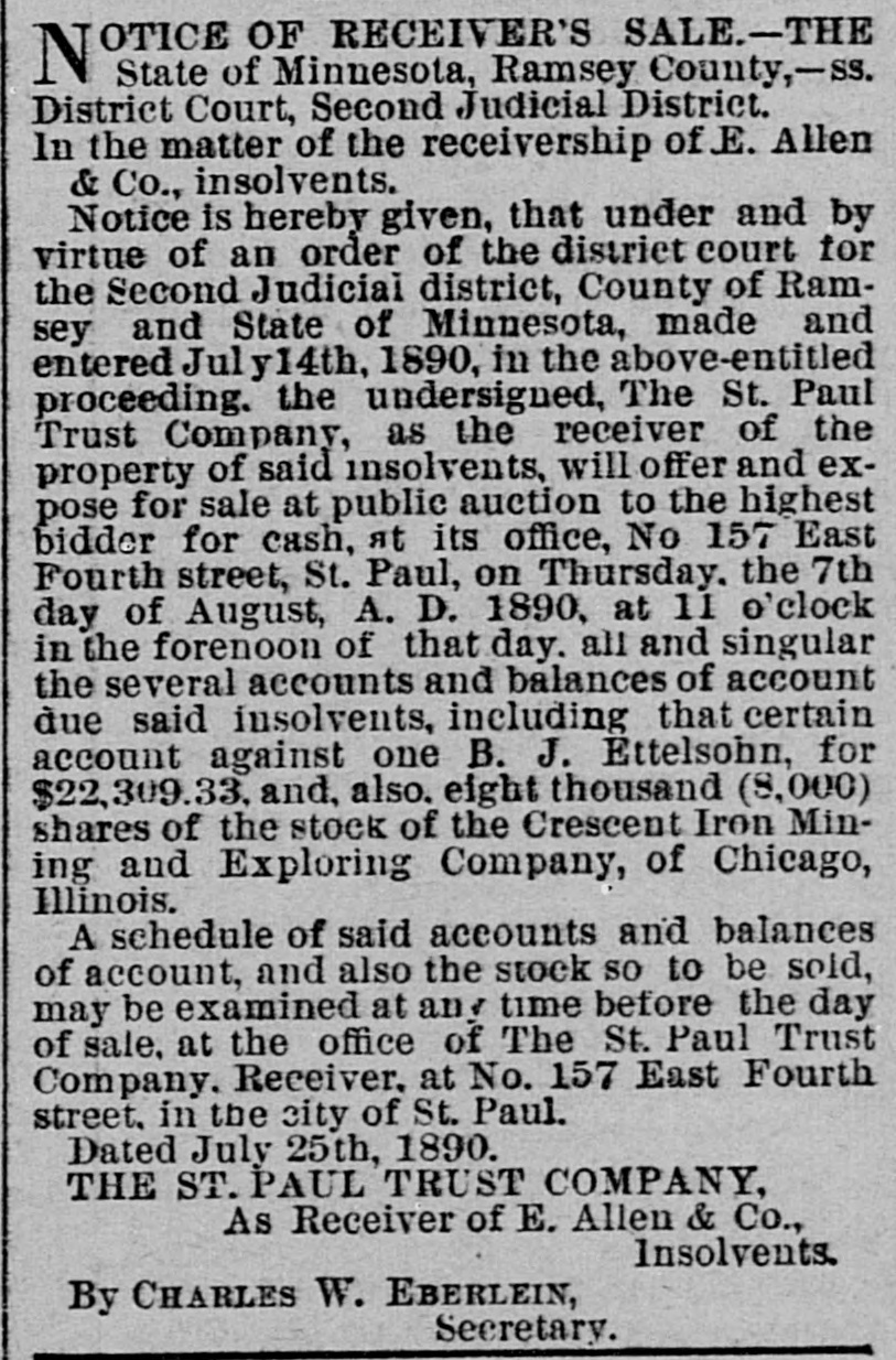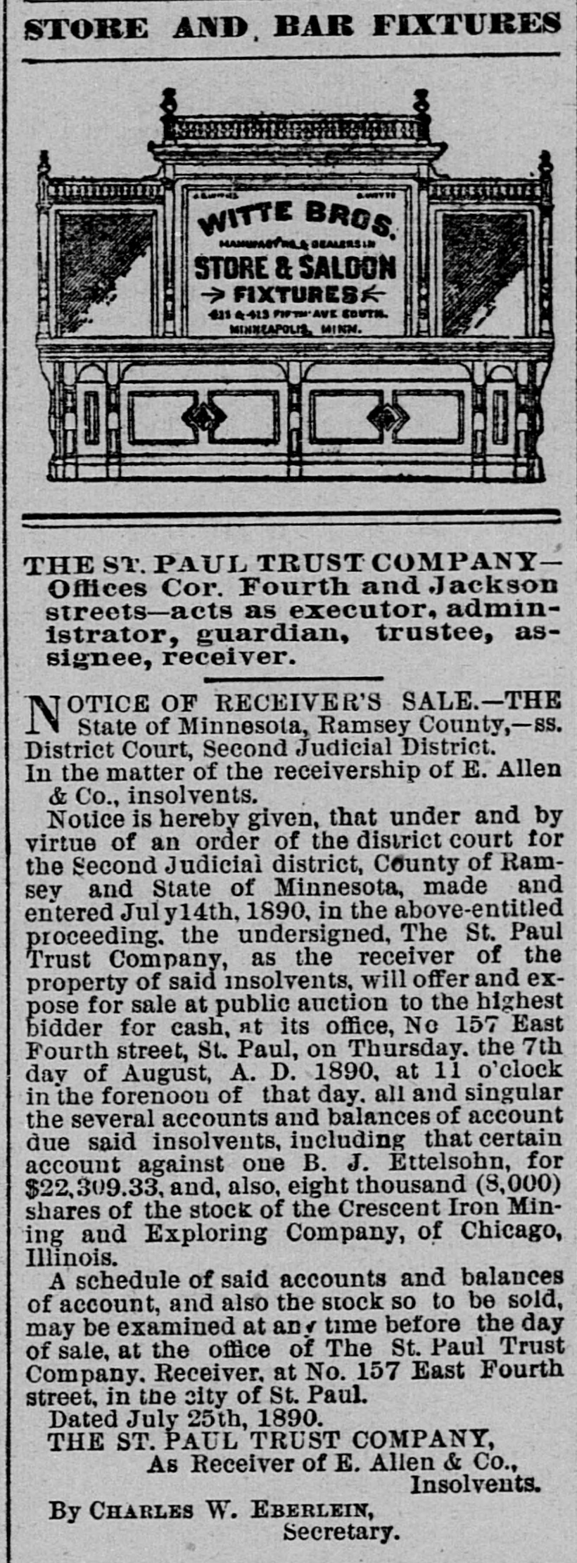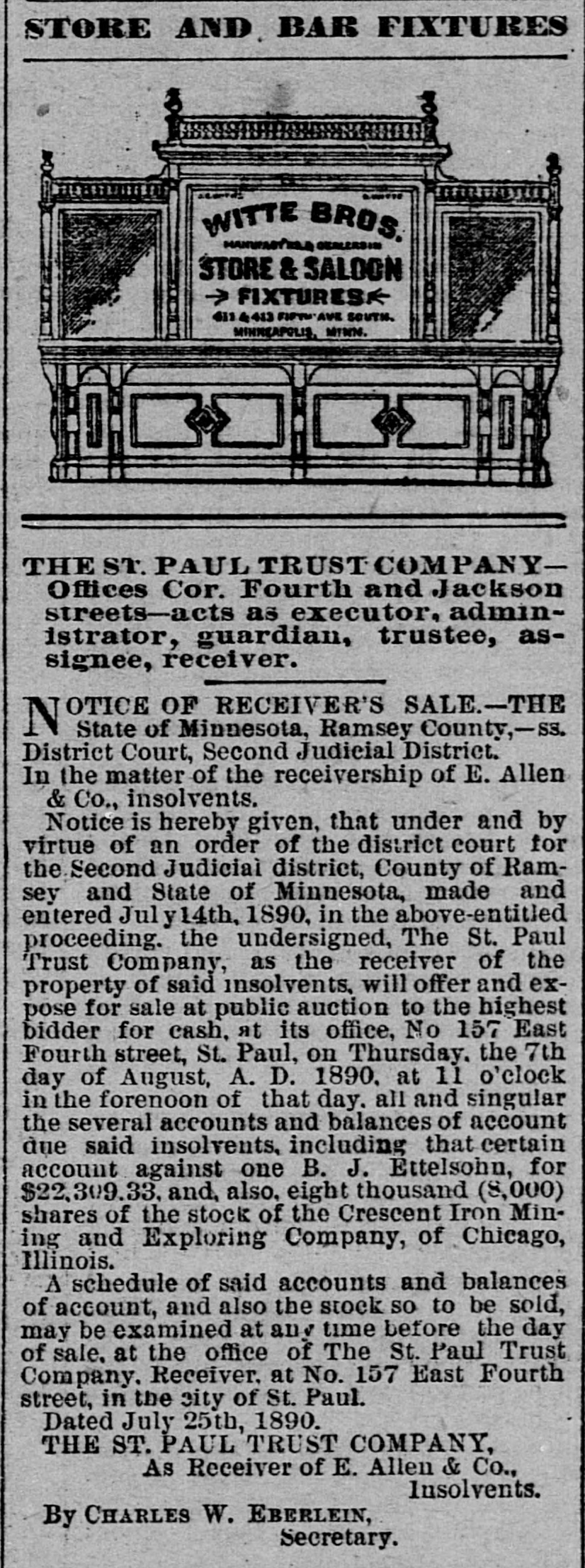STORE AND, BAR FIXTURES SUITE WITTE BROS. MANUFACTURE DEALERSIN STORE & SALDON FIXTURES 411 4413 FIFTMAVE COUTH. MINNEAPOLIS, MINN. THE ST. PAUL TRUST COMPANYOffices Cor. Fourth and Jackson streets-acts as executor, administrator, guardian, trustee, assignee, receiver. OTICE OF RECEIVER'S SALE.-THE N State of Minnesota, Ramsey County,-ss. District Court, Second Judicial District. In the matter of the receivership of E. Allen & Co., insolvents. Notice is hereby given, that under and by virtue of an order of the district court for the Second Judicial district, County of Ramsey and State of Minnesota, made and entered Jul y14th, 1890, in the above-entitled proceeding. the undersigned, The St. Paul Trust Company, as the receiver of the property of said insolvents, will offer and expose for sale at public auction to the highest bidder for cash, at its office, No 157 East Fourth street, St. Paul, on Thursday. the 7th day of August, A. D. 1890, at 11 o'clock in the forenoou of that day. all and singular the several accounts and balances of account due said insolvents, including that certain account against one B. J. Ettelsohn, for $22,309.33, and, also, eight thousand (8,000) shares of the stock of the Crescent Iron Mining and Exploring Company, of Chicago, Illinois. A schedule of said accounts and balances of account, and also the stock so to be sold, may be examined at an time before the day of sale, at the office of The St. Paul Trust Company. Receiver. at No. 157 East Fourth street, in the city of St. Paul. Dated July 25th, 1890. THE ST. PAUL TRUST COMPANY, As Receiver of E. Allen & Co., Insolvents. By CHARLES W. EBERLEIN, Secretary.