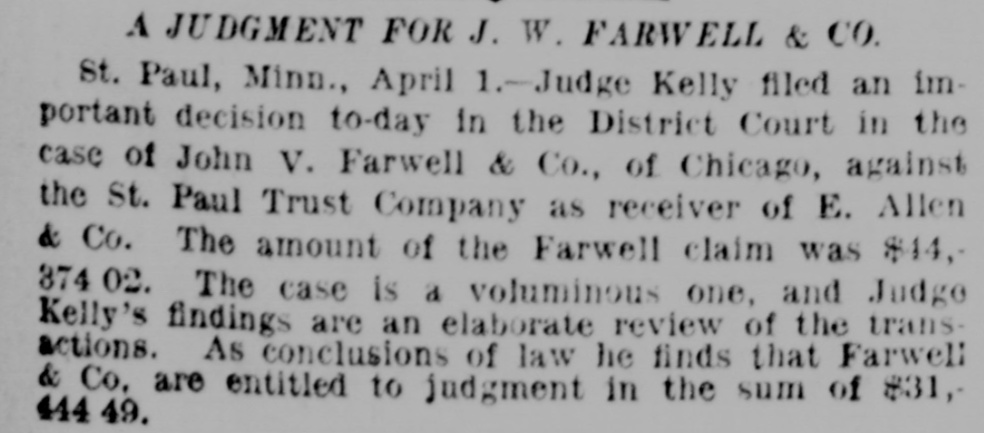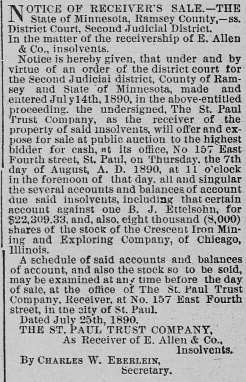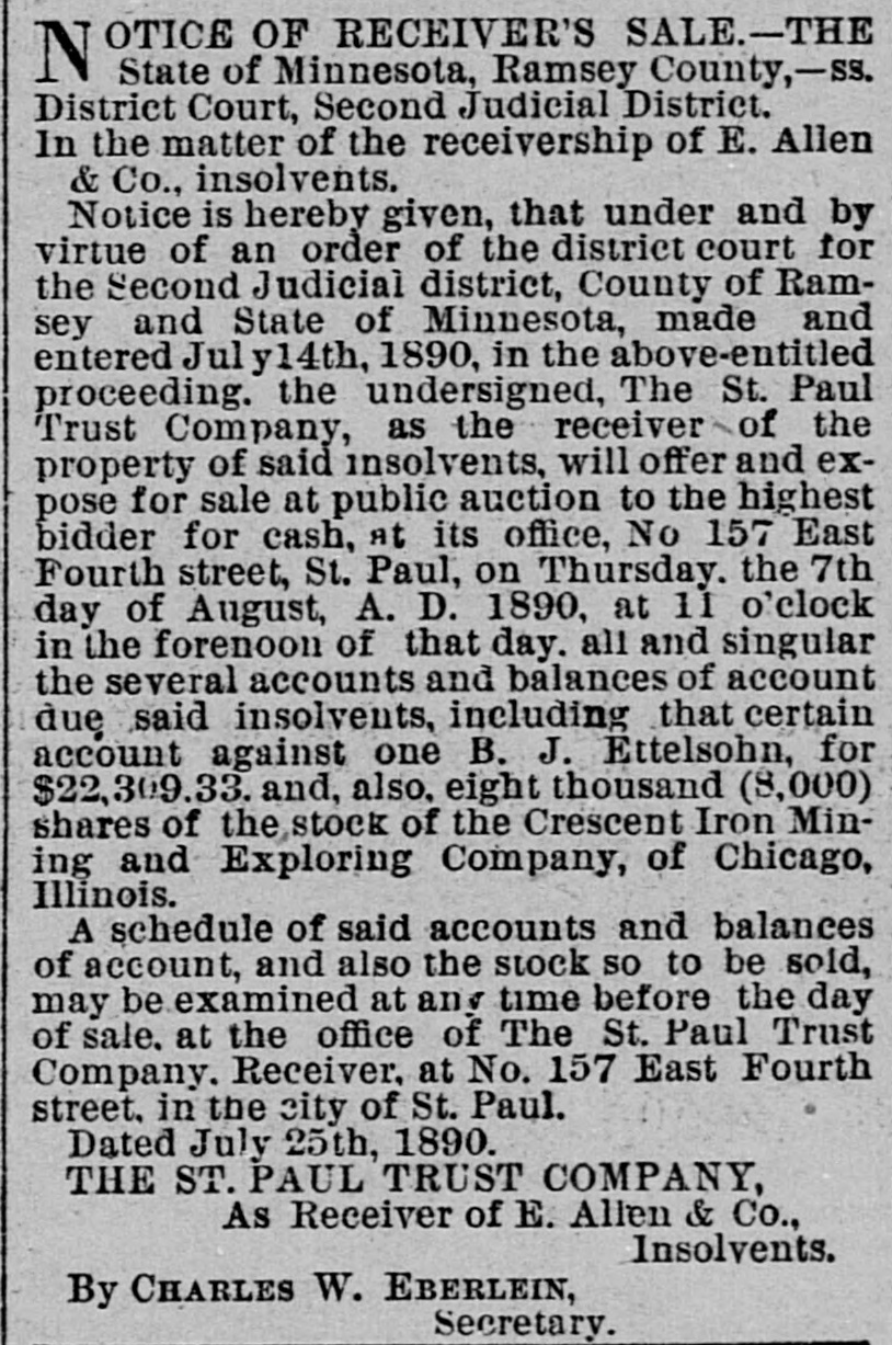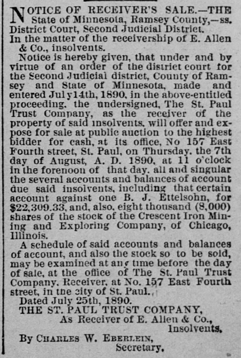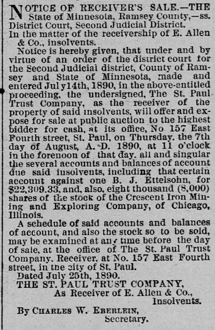 STORE AND, BAR FIXTURES SUITE WITTE BROS. MANUFACTURE DEALERSIN STORE & SALDON FIXTURES 411 4413 FIFTMAVE COUTH. MINNEAPOLIS, MINN. THE ST. PAUL TRUST COMPANYOffices Cor. Fourth and Jackson streets-acts as executor, administrator, guardian, trustee, assignee, receiver. OTICE OF RECEIVER'S SALE.-THE N State of Minnesota, Ramsey County,-ss. District Court, Second Judicial District. In the matter of the receivership of E. Allen & Co., insolvents. Notice is hereby given, that under and by virtue of an order of the district court for the Second Judicial district, County of Ramsey and State of Minnesota, made and entered Jul y14th, 1890, in the above-entitled proceeding. the undersigned, The St. Paul Trust Company, as the receiver of the property of said insolvents, will offer and expose for sale at public auction to the highest bidder for cash, at its office, No 157 East Fourth street, St. Paul, on Thursday. the 7th day of August, A. D. 1890, at 11 o'clock in the forenoou of that day. all and singular the several accounts and balances of account due said insolvents, including that certain account against one B. J. Ettelsohn, for $22,309.33, and, also, eight thousand (8,000) shares of the stock of the Crescent Iron Mining and Exploring Company, of Chicago, Illinois. A schedule of said accounts and balances of account, and also the stock so to be sold, may be examined at an time before the day of sale, at the office of The St. Paul Trust Company. Receiver. at No. 157 East Fourth street, in the city of St. Paul. Dated July 25th, 1890. THE ST. PAUL TRUST COMPANY, As Receiver of E. Allen & Co., Insolvents. By CHARLES W. EBERLEIN, Secretary.