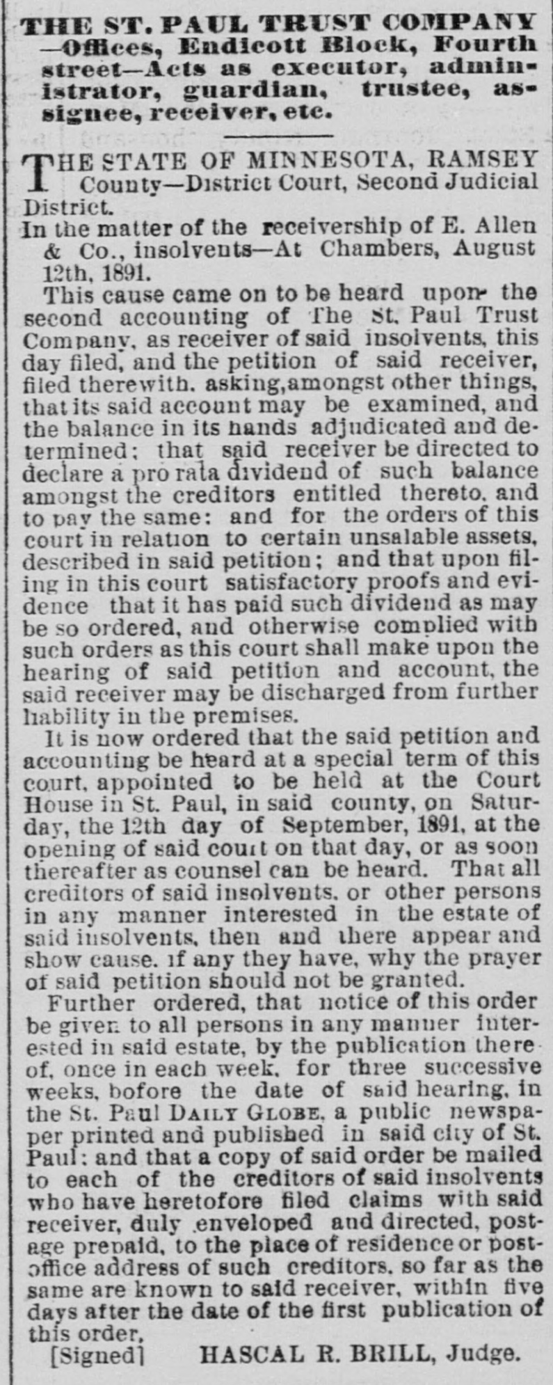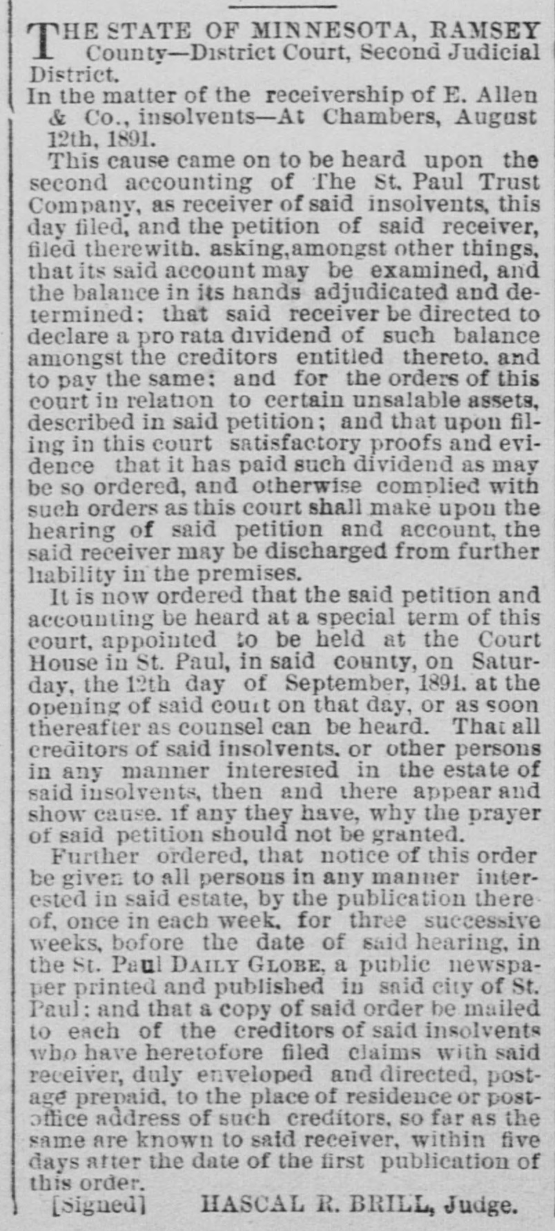 District. In the matter of the receivership of E. Allen & Co., insolvents-At Chambers, August 12th, 1891. This cause came on to be heard upon the second accounting of The St. Paul Trust Company, as receiver of said insolvents, this day filed, and the petition of said receiver, filed therewith. asking, amongst other things, that its said account may be examined, and the balance in its hands adjudicated and determined: that said receiver be directed to declare a pro rata dividend of such balance amongst the creditors entitled thereto. and to pay the same: and for the orders of this court in relation to certain unsalable assets, described in said petition; and that upon filing in this court satisfactory proofs and evidence that it has paid such dividend as may be so ordered, and otherwise complied with such orders as this court shall make upon the hearing of said petition and account, the said receiver may be discharged from further liability in the premises. It is now ordered that the said petition and accounting be heard at a special term of this court, appointed to be held at the Court House in St. Paul, in said county, on Saturday, the 12th day of September, 1891. at the opening of said court on that day, or as soon thereafter as counsel can be heard. That all creditors of said insolvents. or other persons in any manner interested in the estate of said insolvents, then and there appear and show cause. if any they have, why the prayer of said petition should not be granted. Further ordered, that notice of this order be given to all persons in any manner interested in said estate, by the publication there of, once in each week. for three successive weeks, bofore the date of said hearing, in the St. Paul DAILY GLOBE, a public newspaper printed and published in said city of St. Paul: and that a copy of said order be mailed to each of the creditors of said insolvents who have heretofore filed claims with said receiver, duly enveloped and directed, postage prepaid, to the place of residence or postoffice address of such creditors, SO far as the same are known to said receiver, within five days after the date of the first publication of this order. [Signed] HASCAL R. BRILL, Judge.