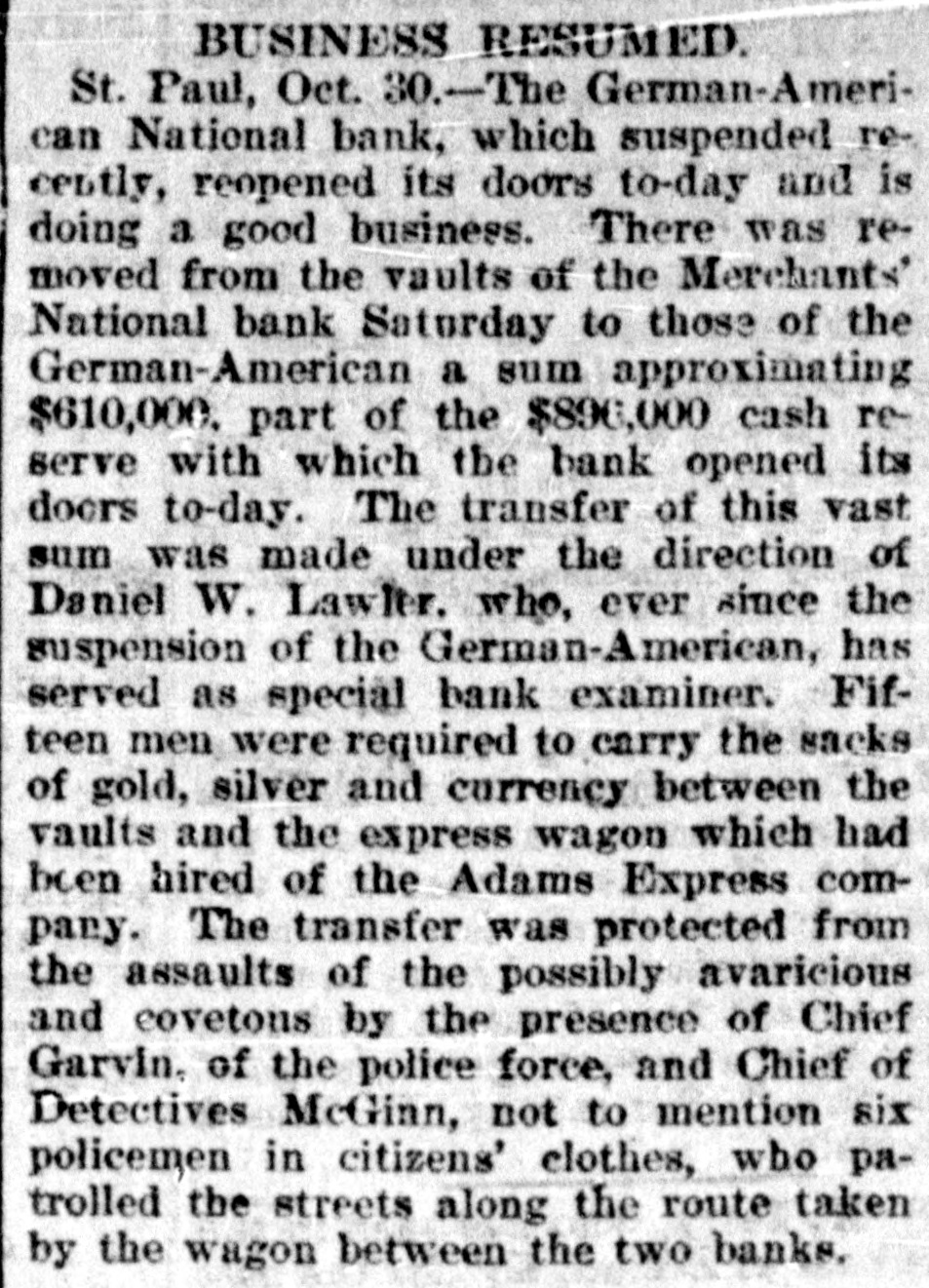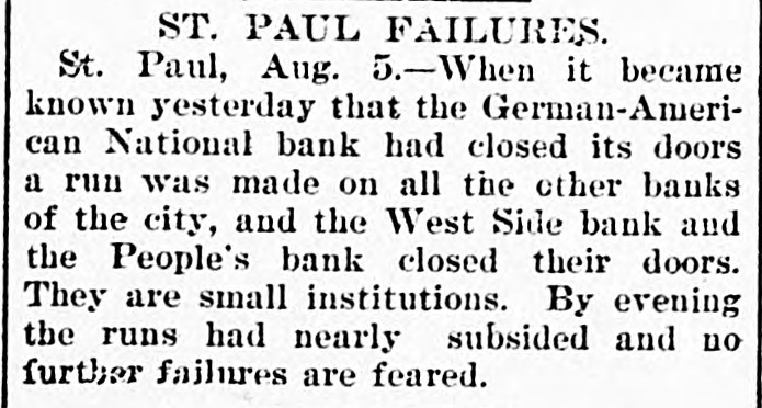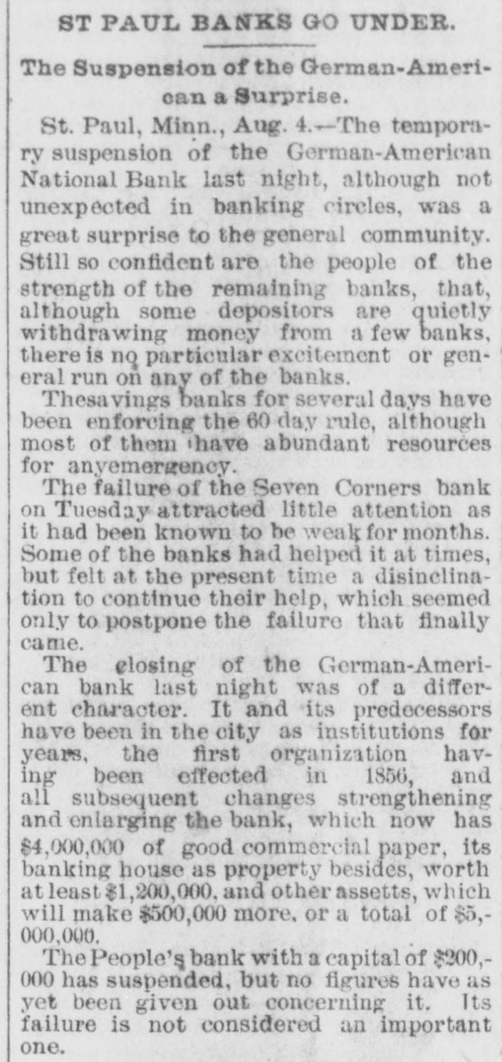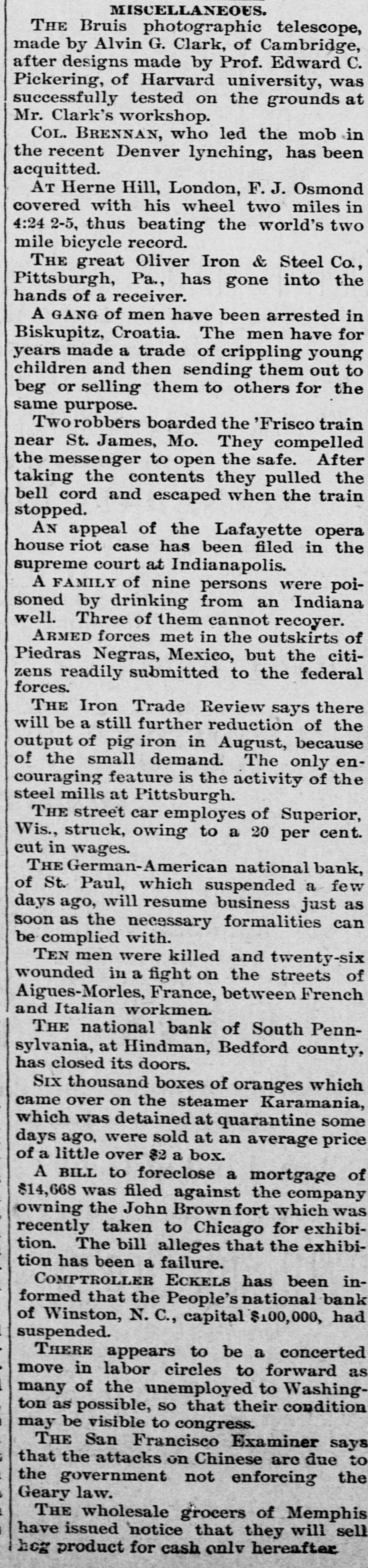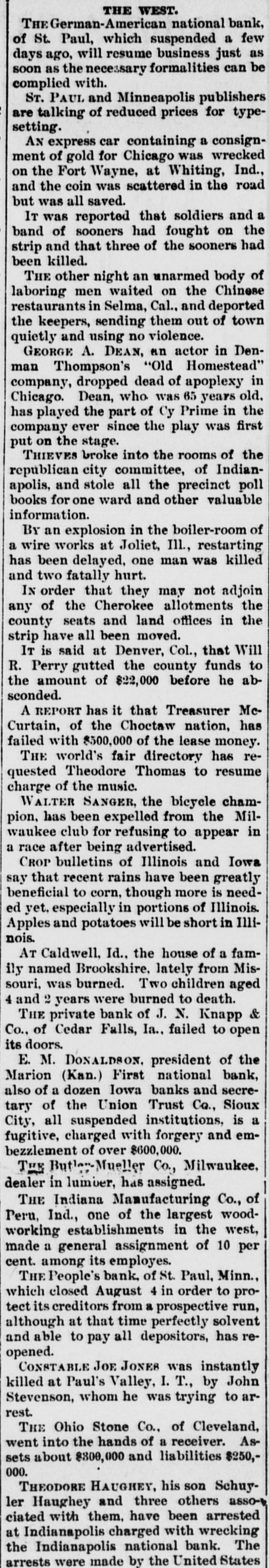 THE WEST. THEGerman-American national bank, of St. Paul, which suspended a few days ago, will resume business just as soon as the necessary formalities can be complied with. ST. PAUL and Minneapolis publishers are talking of reduced prices for typesetting. AN express car containing a consignment of gold for Chicago was wrecked on the Fort Wayne, at Whiting, Ind., and the coin was scattered in the road but was all saved. IT was reported that soldiers and a band of sooners had fought on the strip and that three of the sooners had been killed. THE other night an unarmed body of laboring men waited on the Chinese restaurants in Selma, Cal., and deported the keepers, sending them out of town quietly and using no violence. GEORGE A. DEAN, an actor in Denman Thompson's "Old Homestead" company, dropped dead of apoplexy in Chicago. Dean, who was 65 years old. has played the part of Cy Prime in the company ever since the play was first put on the stage. THIEVES broke into the rooms of the republican city committee, of Indianapolis, and stole all the precinct poll books for one ward and other valuable information. By an explosion in the boiler-room of a wire works at Joliet, Ill., restarting has been delayed, one man was killed and two fatally hurt. IN order that they may not adjoin any of the Cherokee allotments the county seats and land offices in the strip have all been moved. IT is said at Denver, Col., that Will R. Perry gutted the county funds to the amount of $22,000 before he absconded. A REPORT has it that Treasurer McCurtain, of the Choctaw nation, has failed with $500,000 of the lease money. THE world's fair directory has requested Theodore Thomas to resume charge of the music. WALTER SANGER, the bicycle champion, has been expelled from the Milwaukee club for refusing to appear in a race after being advertised. CROP bulletins of Illinois and Iowa say that recent rains have been greatly beneficial to corn, though more is needed yet, especially in portions of Illinois. Apples and potatoes will be short in Illinois. AT Caldwell, Id., the house of a family named Brookshire, lately from Missouri, was burned. Two children aged 4 and 2 years were burned to death. THE private bank of J. N. Knapp & Co., of Cedar Falls, Ia., failed to open its doors. E. M. DONALDSON. president of the Marion (Kan.) First national bank, also of a dozen Iowa banks and secretary of the Union Trust Co., Sioux City, all suspended institutions, is a fugitive, charged with forgery and embezzlement of over $600,000. THE Butlen-Mueller Co., Milwaukee, dealer in lumber, has assigned. THE Indiana Manufacturing Co., of Peru, Ind., one of the largest woodworking establishments in the west, made a general assignment of 10 per cent. among its employes. THE People's bank, of St. Paul, Minn., which closed August 4 in order to protect its creditors from a prospective run, although at that time perfectly solvent and able to pay all depositors, has reopened. CONSTABLE JOE JONES was instantly killed at Paul's Valley, I. T., by John Stevenson, whom he was trying to arrest. THE Ohio Stone Co., of Cleveland, went into the hands of a receiver. Assets about $300,000 and liabilities $250,000. THEODORE HAUGHEY, his son Schuyler Haughey and three others asso-v ciated with them, have been arrested at Indianapolis charged with wrecking the Indianapolis national bank. The arrests were made by the United States