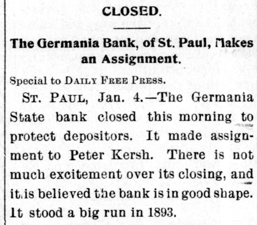 CLOSED. The Germania Bank, of St. Paul, Makes an Assignment. Special to DAILY FREE PRESS. ST. PAUL, Jan. 4.-The Germania State bank closed this morning to protect depositors. It made assignment to Peter Kersh. There is not much excitement over its closing, and it.is believed the bank is in good shape. It stood a big run in 1893.