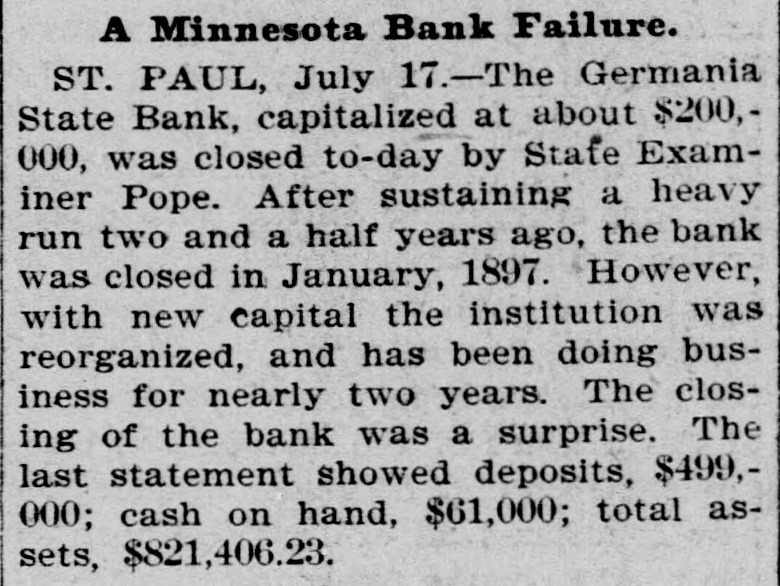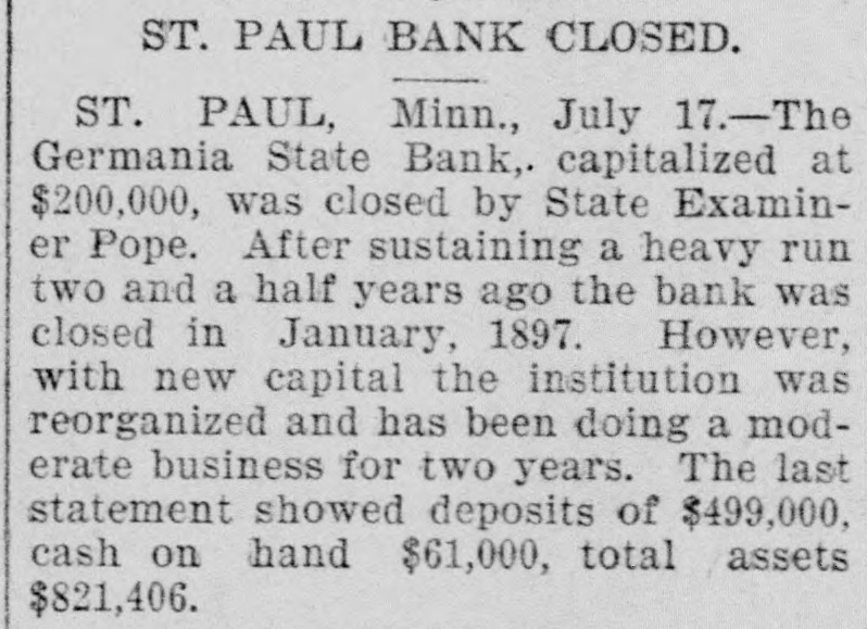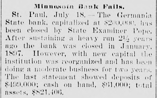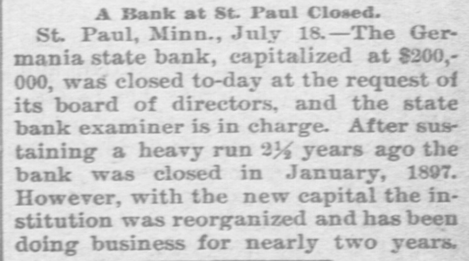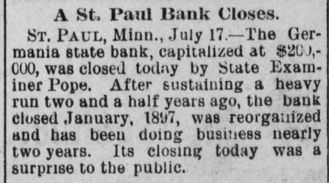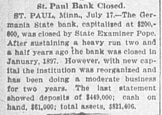 Bank's Second Failure. St. Paul, Minn., July 17.-The Germania State Bank, capitalized at $200,000, was closed to-day by State Examiner Pope. After sustaining a heavy run two and a half years ago, the bank closed in January, 1897, was reorganized, and has been doing business nearly two years. The closing to-day was a surprise to the public.