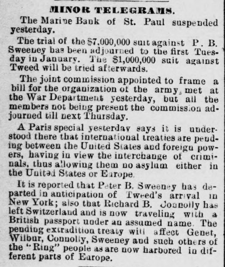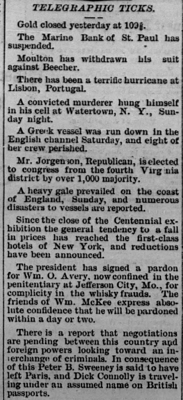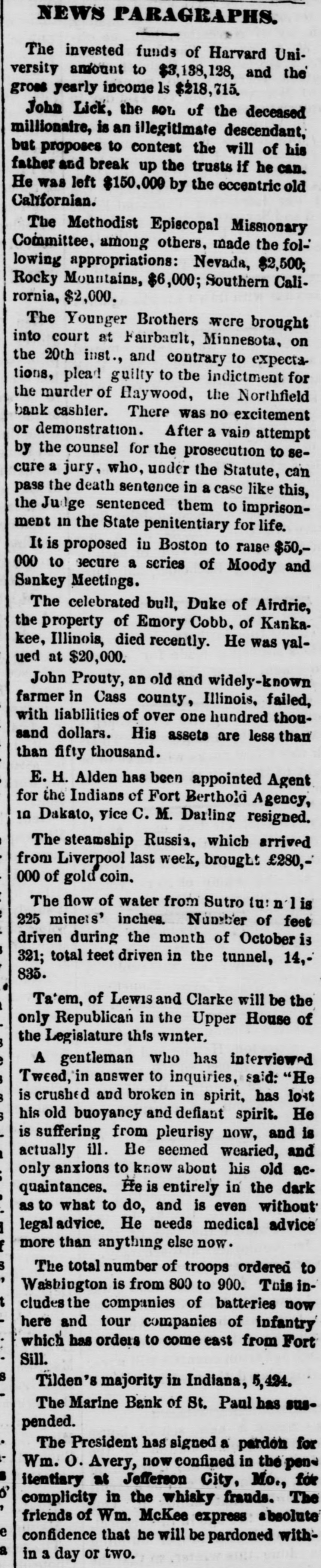 NEWS PARAGEAPHS. The invested funds of Harvard University amount to $3,138,128, and the gross yearly income Is $218,715. John Lick, the BOL of the deceased millionaire, is an illegitimate descendant, but proposes to contest the will of his father and break up the trusts if he can. He was left $150,000 by the eccentric old Californian. The Methodist Episcopal Missionary Committee, among others, made the following appropriations: Nevada, $2,500; Rocky Mountains, $6,000; Southern Calirornia, $2,000. The Younger Brothers were brought into court at Fairbault, Minnesota, on the 20th inst., and contrary to expecta tions, plead guilty to the indictment for the murder of Haywood, the Northfield bank cashier. There was no excitement or demonstration. After a vain attempt by the counsel for the prosecution to secure a jury, who, under the Statute, can pass the death sentence in a case like this, the Judge sentenced them to imprisonment in the State penitentiary for life. It is proposed in Boston to raise $50,000 to secure a scries of Moody and Sankey Meetings. The celebrated bull, Duke of Airdrie, the property of Emory Cobb, of Kanka. kee, Illinois, died recently. He was valued at $20,000. John Prouty, an old and widely-known farmer in Cass county, Illinois, failed, with liabilities of over one hundred thousand dollars. His assets are less than than fifty thousand. E. H. Alden has been appointed Agent for the Indians of Fort Berthold Agency, 10 Dakato, yice C. M. Darling resigned. The steamship Russia, which arrived from Liverpool last week, brought £280,000 of gold coin. The flow of water from Sutro tu: n lis 225 minets' inches. Number of feet driven during the month of October is s 321; total teet driven in the tunnel, 14,835. e Ta'em, of Lewis and Clarke will be the only Republican in the Upper House of the Legislature this winter. 3 ) A gentleman who has interviewed 3 Tweed, in answer to inquiries, said: "He B is crushed and broken in spirit, has lost 3 his old buoyancy and defiant spirit. He is suffering from pleurisy now, and is 1 actually ill. He seemed wearied, and only anxions to know about his old ac: quaintances. He is entirely in the dark as to what to do, and is even without I legal advice. He needs medical advice more than anything else now. f 8 The total number of troops ordered to , Washington is from 800 to 900. Tois int cludes the companies of batteries now here and tour companies of infantry which has orders to come east from Fort : Sill. 8 Tilden's majority in Indiana, 5,424. The Marine Bank of St. Paul has suspended. The President has signed a pardon for : Wm. O. Avery, now confined in the pen8 itentiary at Jefferson City, Mo., for 6' complicity in the whisky frauds. The , friends of Wm. McKee express absolute e confidence that he will be pardoned witha in a day or two.