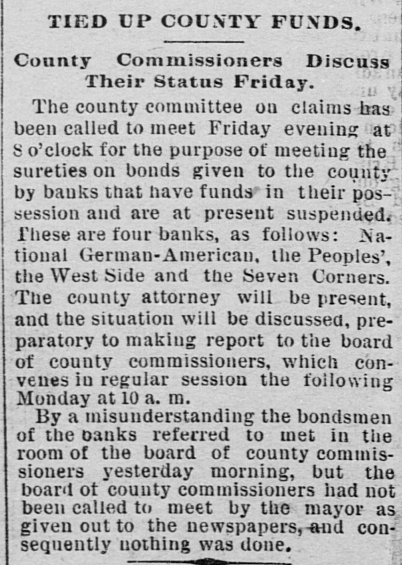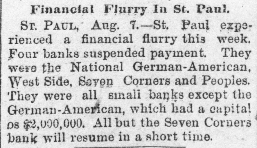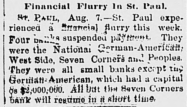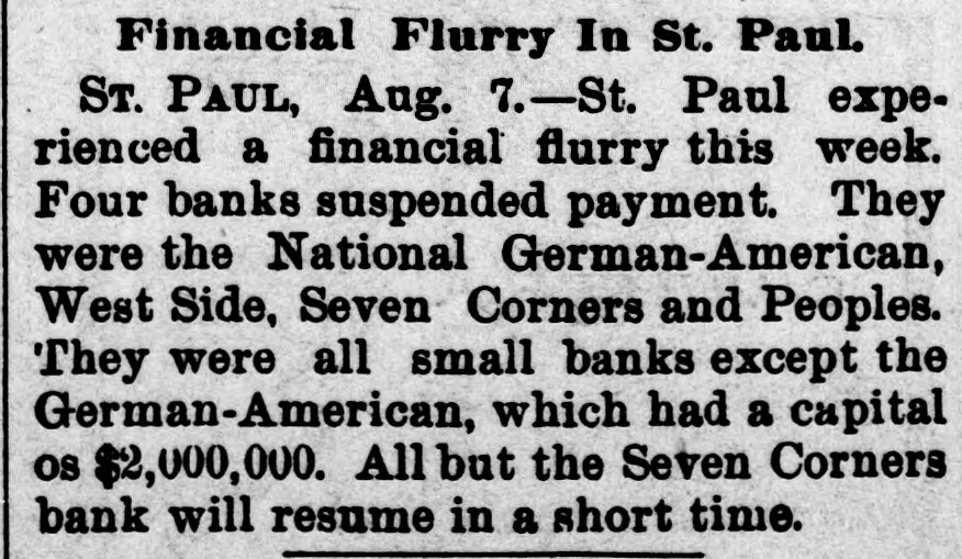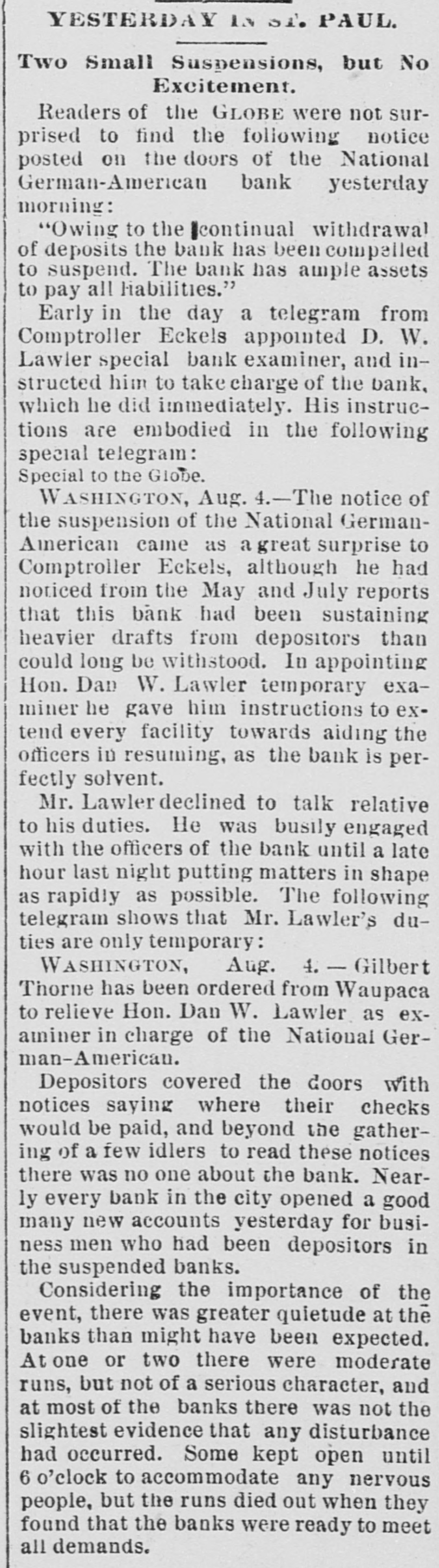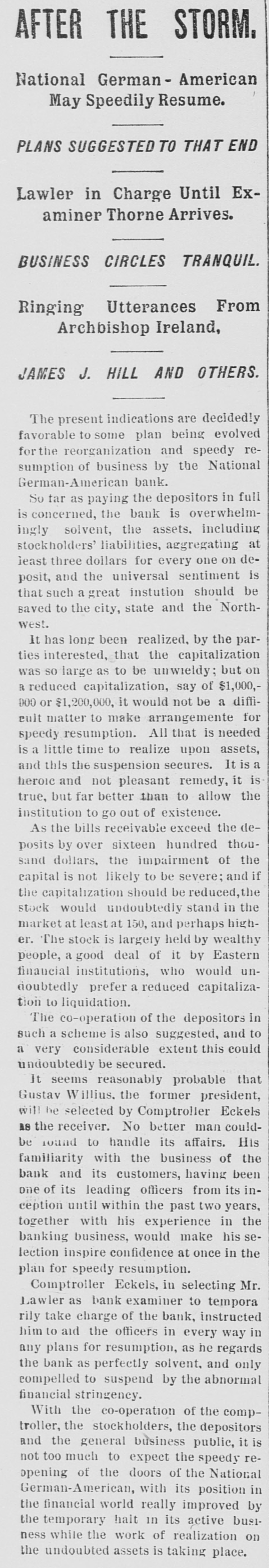 AFTER THE STORM. National German - American May Speedily Resume. PLANS SUGGESTED TO THAT END Lawler in Charge Until Examiner Thorne Arrives. BUSINESS CIRCLES TRANQUIL. Ringing Utterances From Archbishop Ireland, JAMES J. HILL AND OTHERS. The present indications are decidedly favorable to some plan being evolved for the reorganization and speedy resumption of business by the National German-American bank. So tar as paying the depositors in full is concerned, the bank is overwhelmingly solvent, the assets. including stockholders' liabilities, aggregating at least three dollars for every one on deposit, and the universal sentiment is that such a instution great should be saved to the city, state and the Northwest. It has long been realized, by the parties that the interested, capitalization but was so large as to be unwieldy; on R reduced capitalization, say of $1,000,000 or $1,200,000, it would not be a difficult matter to make arrangemente for speedy resumption. All that is needed is a little time to realize upon assets, and this the suspension secures. It is a heroic and not pleasant remedy, it is true, but far better than to allow the institution to go out of existence. As the bills receivable exceed the deposits by over sixteen hundred thousand dollars, the impairment of the capital is not likely to be severe; and if the capitalization should be reduced, the stock would undoubtedly stand in the market at least at 150, and perhaps higher. The stock is largely held by wealthy people, a good deal of it by Eastern financial institutions, who would undoubtedly prefer a reduced capitalization to liquidation. The co-operation of the depositors in such a scheme is also suggested, and to a very considerable extent this could undoubtedly be secured. It seems reasonably probable that Gustav Willius, the former president, will he selected by Comptroller Eckels AS the receiver. No better man couldbe round to handle its affairs. His familiarity with the business of the bank and its customers, having been one of its leading officers from its inception until within the past two years, with together his experience in his the banking business, would make selection inspire confidence at once in the plan for speedy resumption. Comptroller Eckels, in selecting Mr. Lawler as bank examiner to tempora rily take charge of the bank, instructed him to aid the officers in every way in any plans for resumption, as he regards the bank as perfectly solvent, and only compelled to suspend by the abnormal financial stringency. With the co-operation of the comptroller, the stockholders, the depositors and the general business public, it is not too much to expect the speedy reopening of the doors of the National German-American, with its position in the financial world really improved by the temporary halt in its active business while the work of realization on the undoubted assets is taking place.